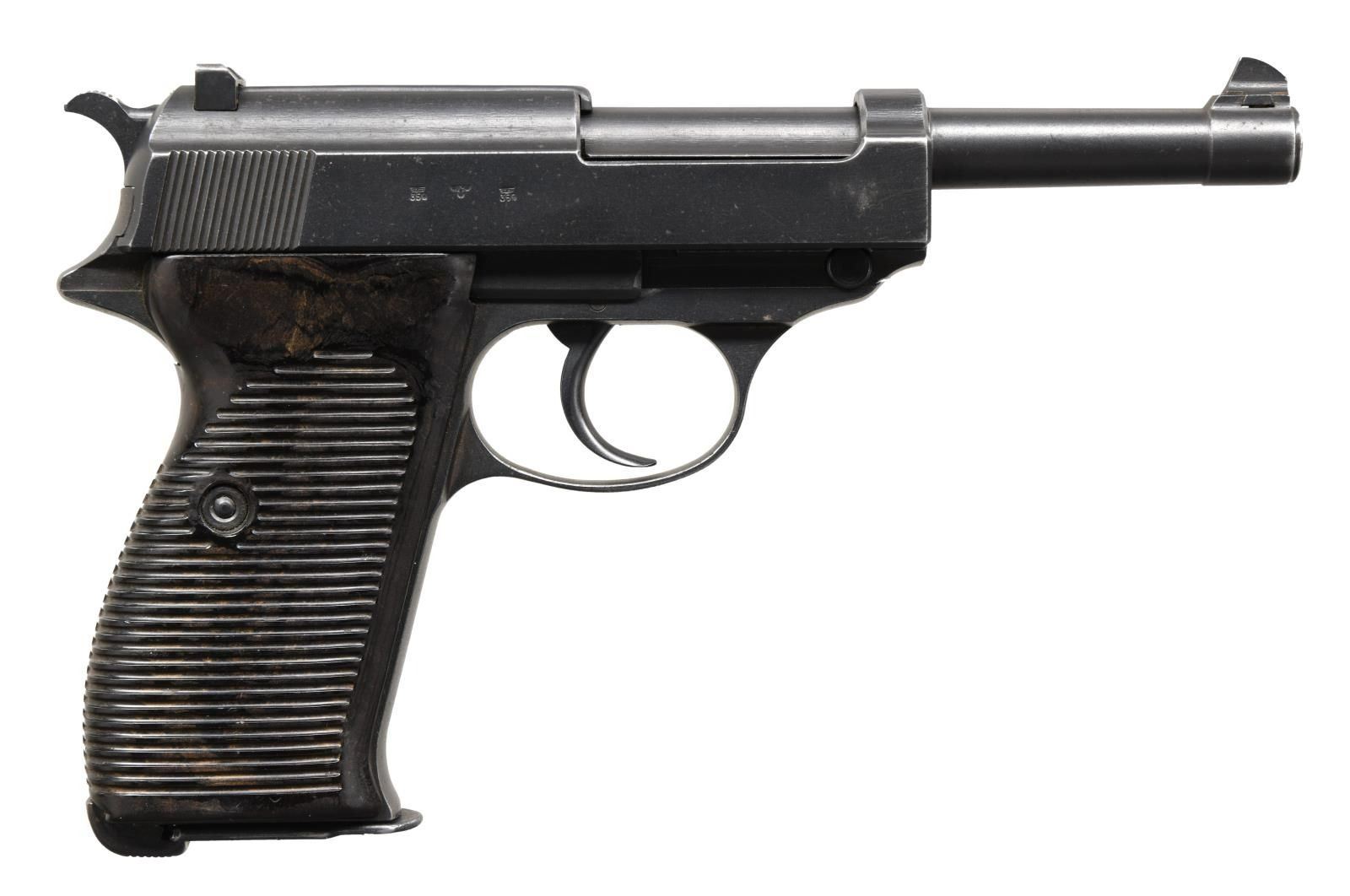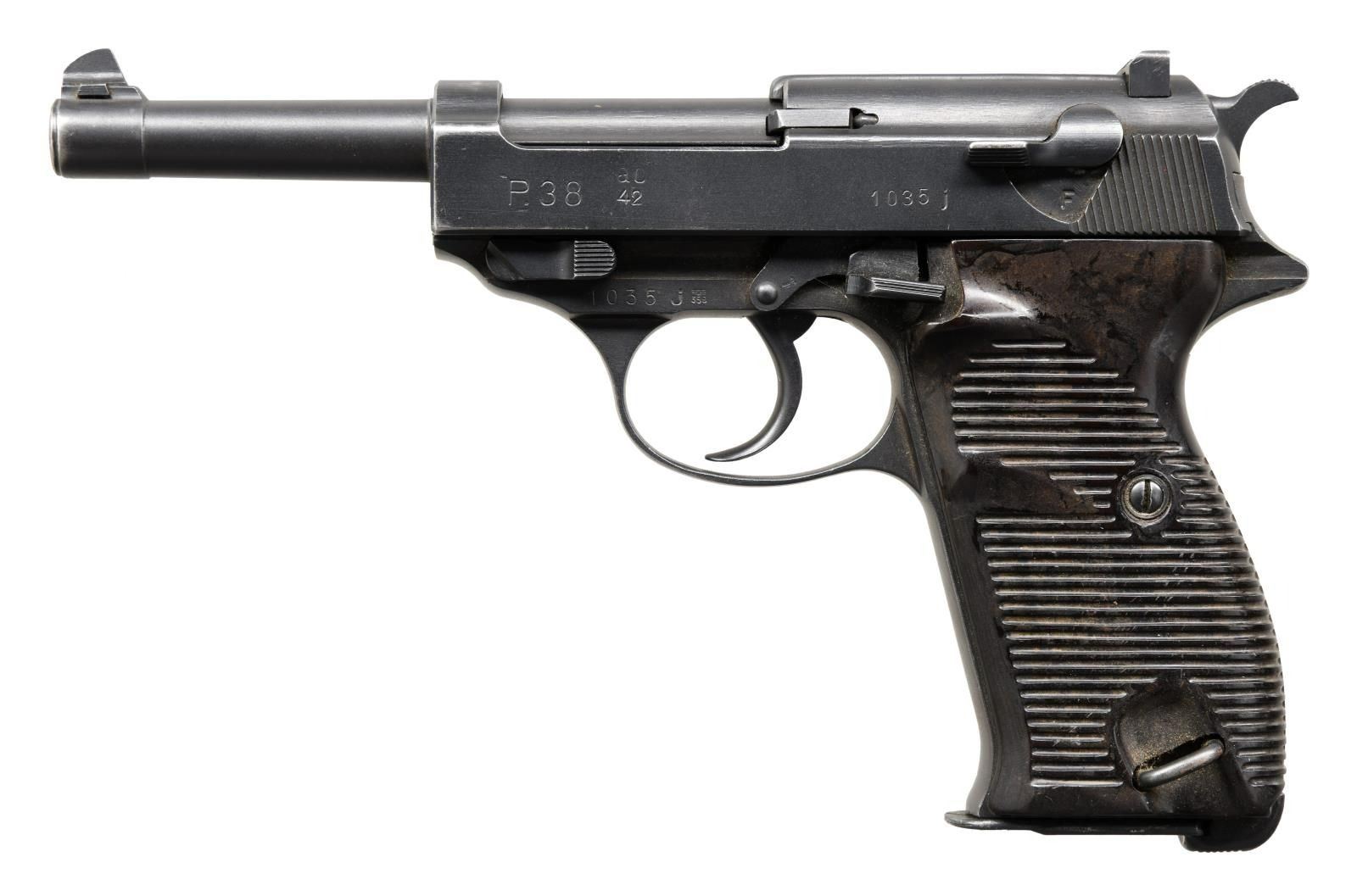 Cal. 9mm L. S# 1035j. Bbl 4 7/8". Standard configuration P.38 manufactured at the Walther arsenal in 1942. Left side of slide bears Walther's manufacturer code and the year of manufacture "ac/42", with the right side bearing an Eagle/359 waffenamt on either side of an eagle firing proof. Metal components exhibit a reapplied dull blue finish, with the frame being mounted with 2 piece grooved pressed resin grips. All numbers are matching and include the frame, slide, barrel, and locking block. MAGS: 1 8 rnd. CONDITION: metal components retain the majority of their reapplied blue finish, exhibiting mild areas of wear overall. Bore exhibits pitting and good rifling throughout. Grips show some scattered marks from storage and handling, but are otherwise good. (23-1824/MLW). CURIO. $500-700.
