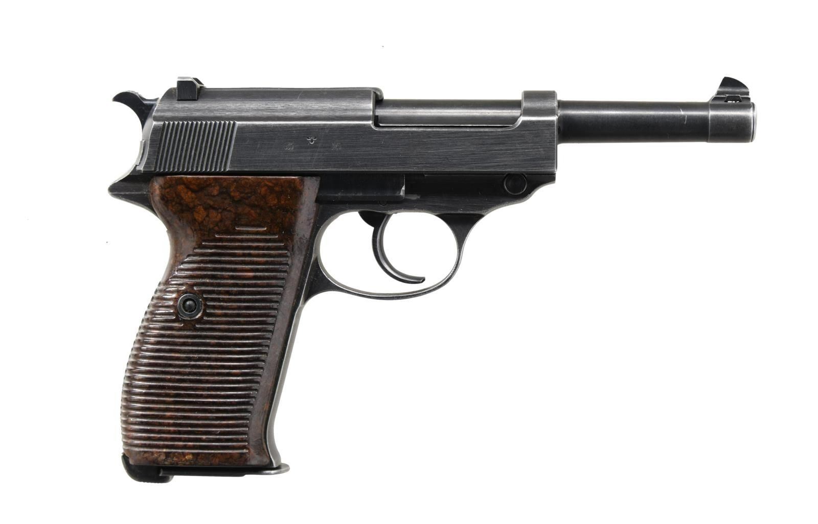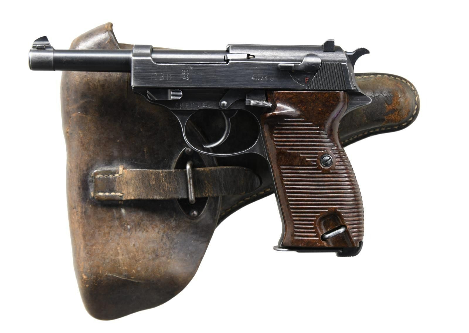 WITH HOLSTER. Cal. 9mm Luger. S# 4071e. Bbl 4 7/8". Standard configuration P.38 manufactured at the Walther arsenal in 1943. The left side of the slide is stamped "P.38" followed by Walther's manufacturer code and the year of manufacture "ac/43", and the serial number, with an Eagle/359 waffenamt present on either side of an eagle firing proof on the right. Magazine is serialized and is number "9190a". Metal components are blued, with the frame being mounted with 2 piece grooved brown pressed resin grips. All numbers are matching and include the frame, slide, barrel, and locking block. MAGS: 2 8 rnd. UNATTACHED ACCESSORIES: brown leather holster containing 1 spare magazine. Waffenamt on rear of holster has worn away and is partially illegible. CONDITION: metal components retain the majority of their original arsenal blue finish, exhibiting areas of edge wear, mild thinning on the grip strap, and wear on the left side of the barrel showing through to gray patina and some pitting. Brilliant mirror bore, exhibiting well defined rifling throughout. Grips show a couple scattered handling marks, but are otherwise very good overall. Holster exhibits discoloration overall, with areas of mild age related cracking and wear. (23-2382/MLW). CURIO. $800-1,200.