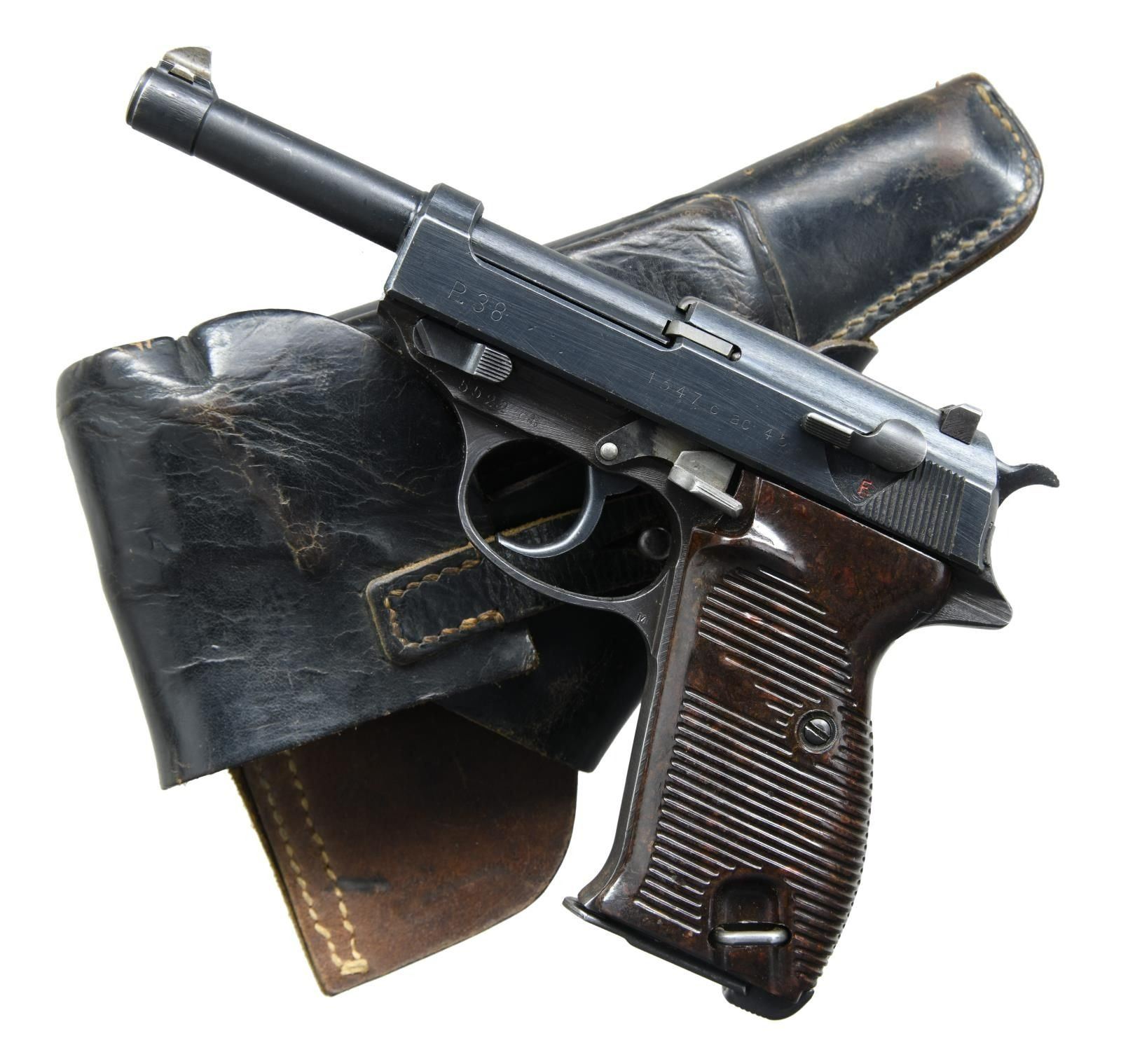 P.38 SEMI-AUTOMATIC PISTOL ASSEMBLED ON FABRIQUE NATIONALE FRAME, WITH HOLSTER. Cal. 9x19mm Parabellum. S# 5522c. Bbl 4 7/8". P.38 manufactured at the Walther arsenal in 1945. This example, falls within the appropriate serial number range and exhibits the characteristics of a P.38 that was assembled by a U.S.G.I. after the Allied capture of the Walther arsenal. The left side of the frame bears the serial number followed by an Fabrique Nationale Eagle/140 waffenamt, with an FN "MI" inspection proof stamped on the lower trigger web. The left side of the slide bears standard markings, with the right side only bearing a single Walther Eagle/359 waffenamt. Major metal components are blued, with some smaller components including the front sight blade, extractor, firing pin/indicator cover, and slide release lever exhibiting a late war phosphate finish. Frame is mounted with 2 piece grooved brown pressed resin grips. No matching numbers are present, but are all within the "c" serial number block, as is typical with P.38s in this G.I. assembled variation. Locking block is unserialized, bearing only an Eagle/359 waffenamt on the right. MAGS: 2 8 rnd. UNATTACHED ACCESSORIES: G.I. modified brown leather holster dated "1944" on the rear. Closure flap has been cut, exposing the butt of the pistol. CONDITION: metal components retain the vast majority of their original arsenal applied blue and phosphate finishes, exhibiting some mild holster wear along the edges, thinning and wear on the grip strap that show through to a pleasant gray patina, as well as some scattered superficial marks from handling and storage. Brilliant mirror bore, exhibiting sharp and well defined rifling throughout. Grips exhibit a few marks from handling and storage, but are otherwise very good overall. Holster shows wear, some areas of creasing, and a few spots of light crazing, but otherwise remains sturdy and serviceable. A very nice and desirable U.S.G.I. P.38 assembled on a Fabrique Nationale frame. (23-2453/MLW). CURIO. $1,500-2,500.