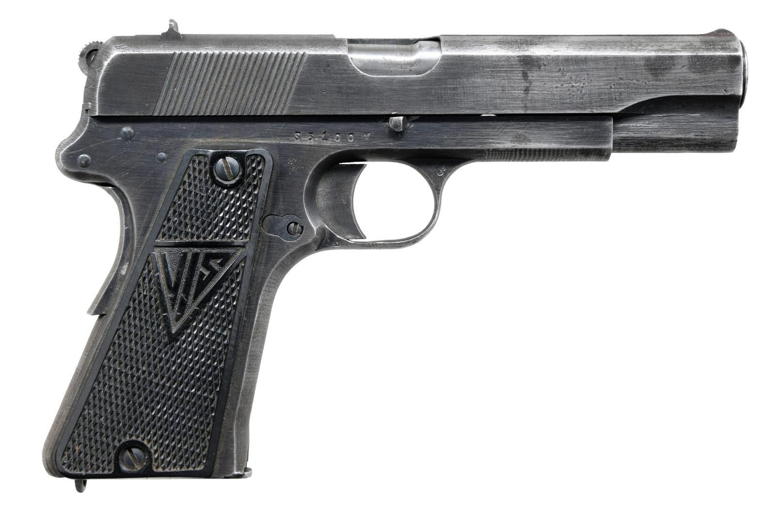SEMI-AUTOMATIC PISTOL. Cal. 9MM L. S# S5100. Bbl 4 5/8". VIS-35 manufactured under German occupation during World War II at the Radom arsenal in Poland. The left side of the slide bears the usual Radom/Model stamp, with an Eagle/77 and indiscernible Eagle/623 waffenamts. Eagle/77 waffenamt is present on the left side of the frame, with an additional Eagle/623 waffenamt present on the barrel lug. Metal components (with the exception of the barrel) are blued, with the frame being mounted with 2 piece checkered black plastic "FB" and "VIS" grips. All numbers are matching and include the frame, slide, and barrel. Takedown latch is broken and no longer retains its provision to catch the slide. MAGS: 1 8 rnd. CONDITION: metal components exhibit wear and thinning overall, with some areas of minor pitting and discoloration, as well as some mild surface oxidation overall. Bright bore, exhibiting moderate pitting and strong rifling throughout. Grips show smoothing and scattered marks from handling and storage, but otherwise remain sturdy and serviceable. (23-1820/MLW). CURIO. $700-1,000.