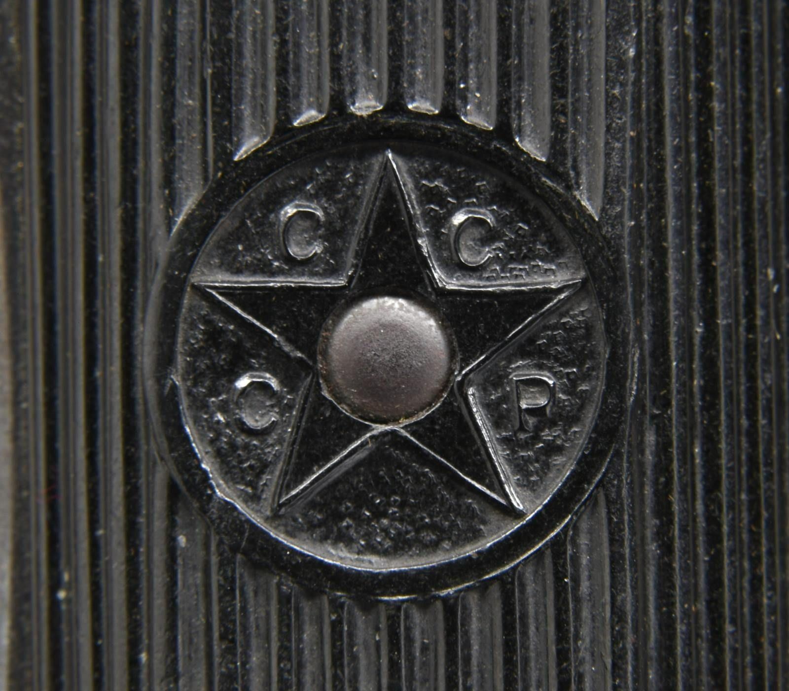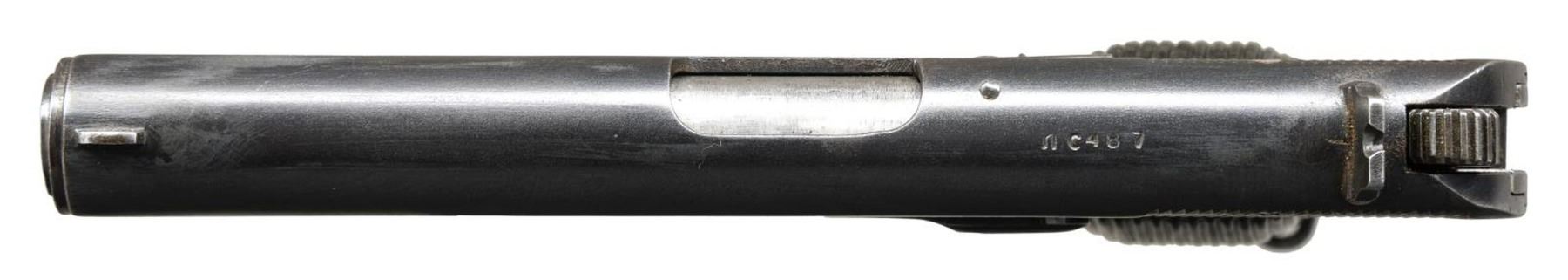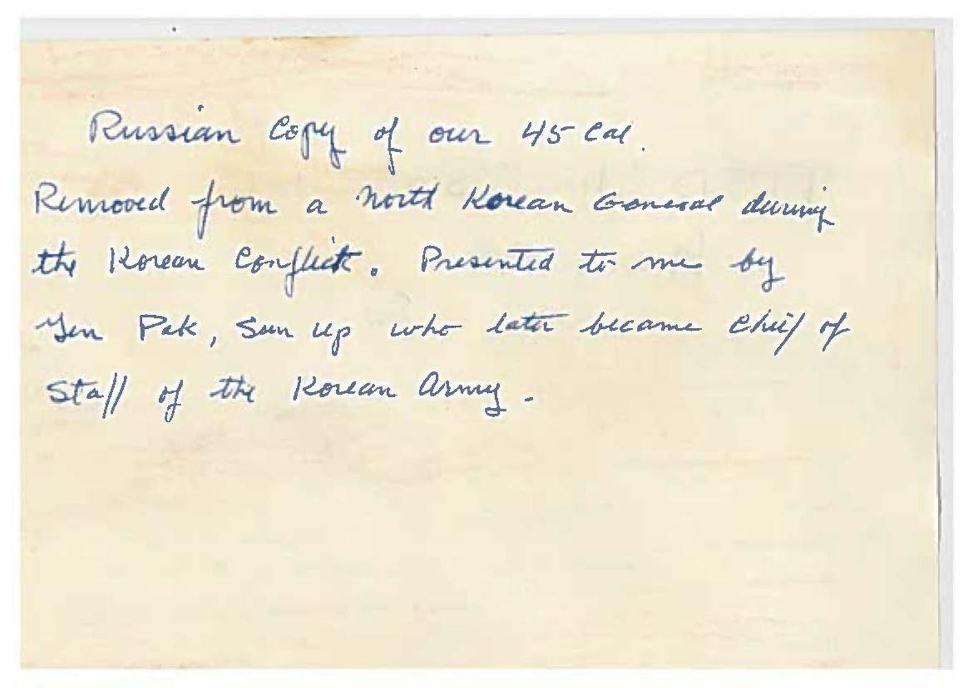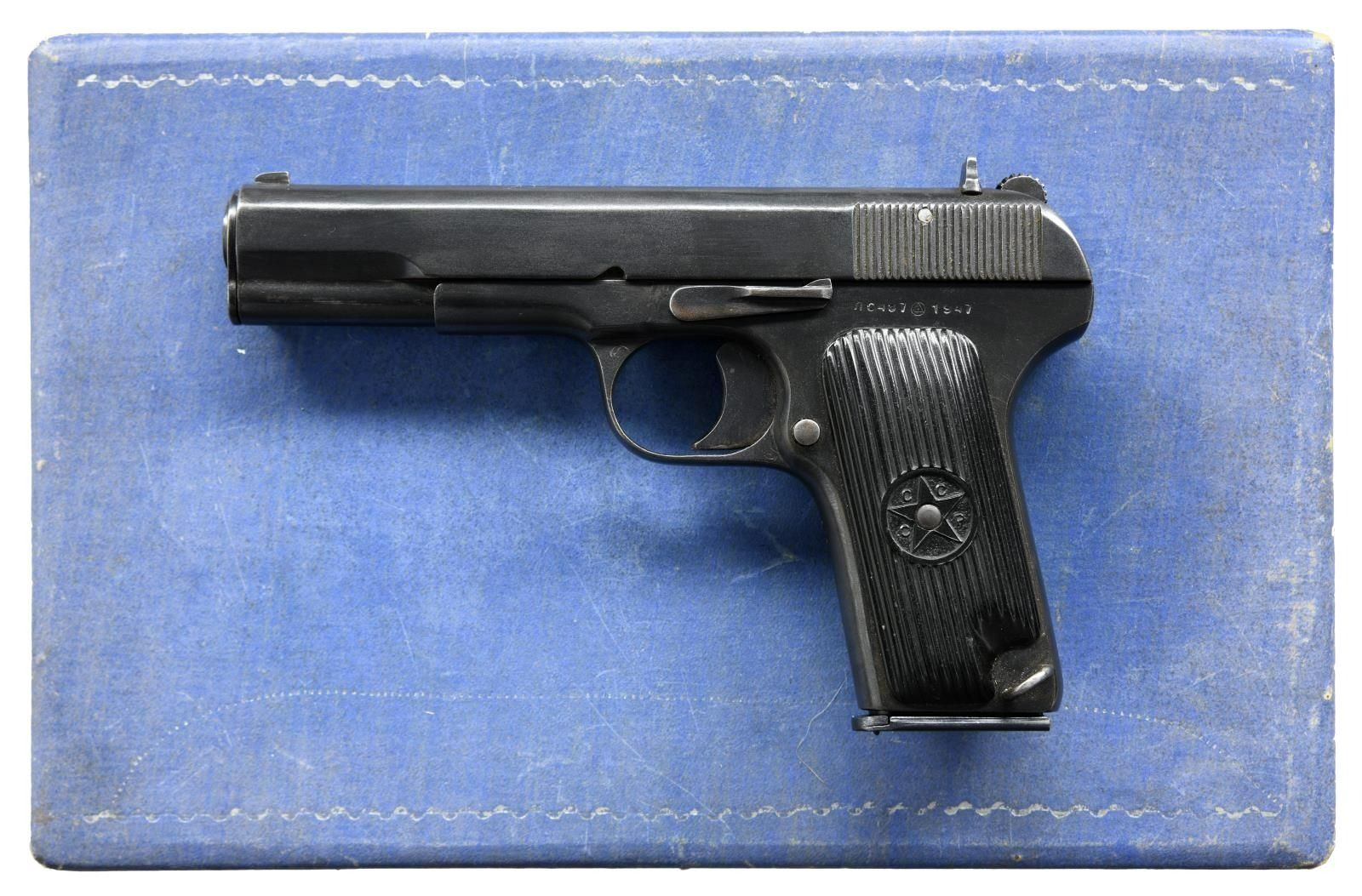 FROM NORTH KOREAN GENERAL & PRESENTED TO BRIGADIER GENERAL FRED SLADEN BY FUTURE SOUTH KOREAN CHIEF OF STAFF PAIK SUN-YUP. Cal. 7.62x25. S# c487. Bbl. 4.5". Mfg.1947. A Soviet Union TT-33 War Trophy as liberated from Korea & presented to U.S. Brigadier General Fred Winchester "Jim" Sladen Jr by Paik Sun-yup, who would later become the Joint Chief of staff of the Republic of Korea Army. This is the real deal, Soviet TT-33. No import marks, nor has it been modified for the required safety to be installed, such as on imported pistols. Original Russian TT-33s are difficult to find & many of the few that made it home arrived from WWII as souvenirs or war trophy's that had been previously captured by the Nazi's & modified by removing any reference to Mother Russia. This example was liberated from a North Korean General during the Korean War & still retains the black bakelite CCCP marked star grips. Slide has correct heavy, machined serrations & is numbered matching the frame. Markings include "C 487 1947" separated by the Izhevsk circle / triangle mark on left side of frame. Fixed sights. Lanyard loop below left grip panel. Serrated spur solid hammer. Left side slide release & mag. release. Matching numbers on frame, slide hammer group & barrel. MAGS: 4 original 8 rd. UNATTACHED ACCESSORIES: a letter hand written by Brigadier General Fred Winchester "Jim" Sladen Jr stating "Russian copy of our 45 Cal. removed from a North Korean General during the Korean conflict. Presented to me by Gen Paik Sun up, who later became Chief of Staff of the Korean Army". Blue cardboard presentation box w/ faded red satin interior w/ green ribbon. Brown leather holster. w/ blue felt interior. CONDITION: original blued finish enjoys remarkably complete & consistent coverage. Very little visible thinning or wear. Grips demonstrate only a few gentle signs of use, primarily on the top of the right panel where some light chipping is visible under close inspection. Each side retains the original circle & star, complete w/ original "CCCP" lettering. Bore is dark but still retains descent rifling. (23-2369/JZ). CURIO. $2,000-3,000. This pistol is from a massive archive of 3 generations of Sladens (1861-1975). There are 25 lots offered on Day 3 and will be sold in order. Included is a wonderful Korean scrapbook, lot 3393, of when Gen. Sladen was stations there for 16 months. This scrapbook has several letters from Paik Sun-Yup.