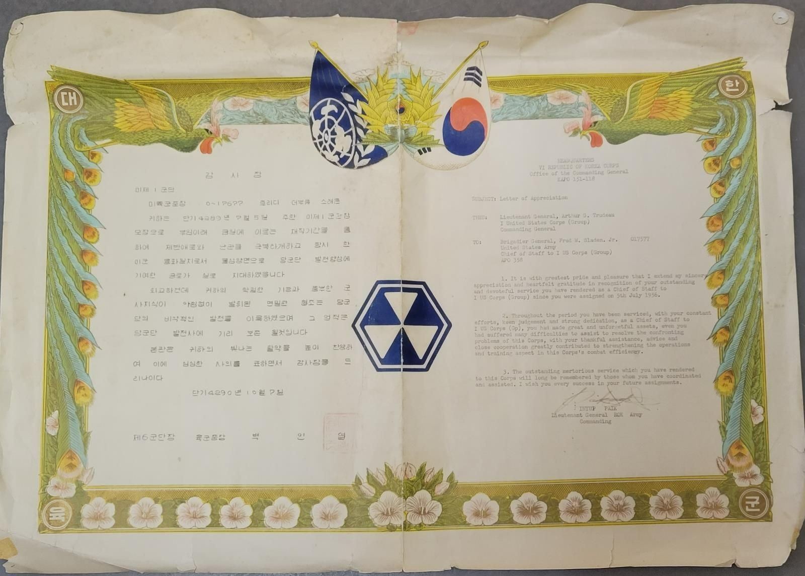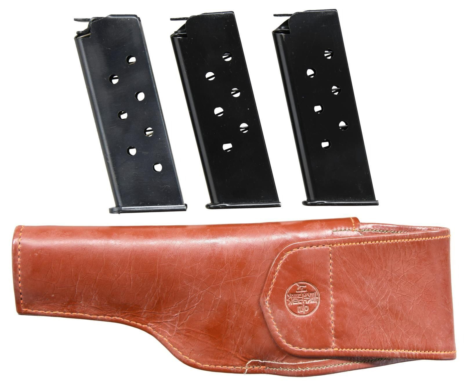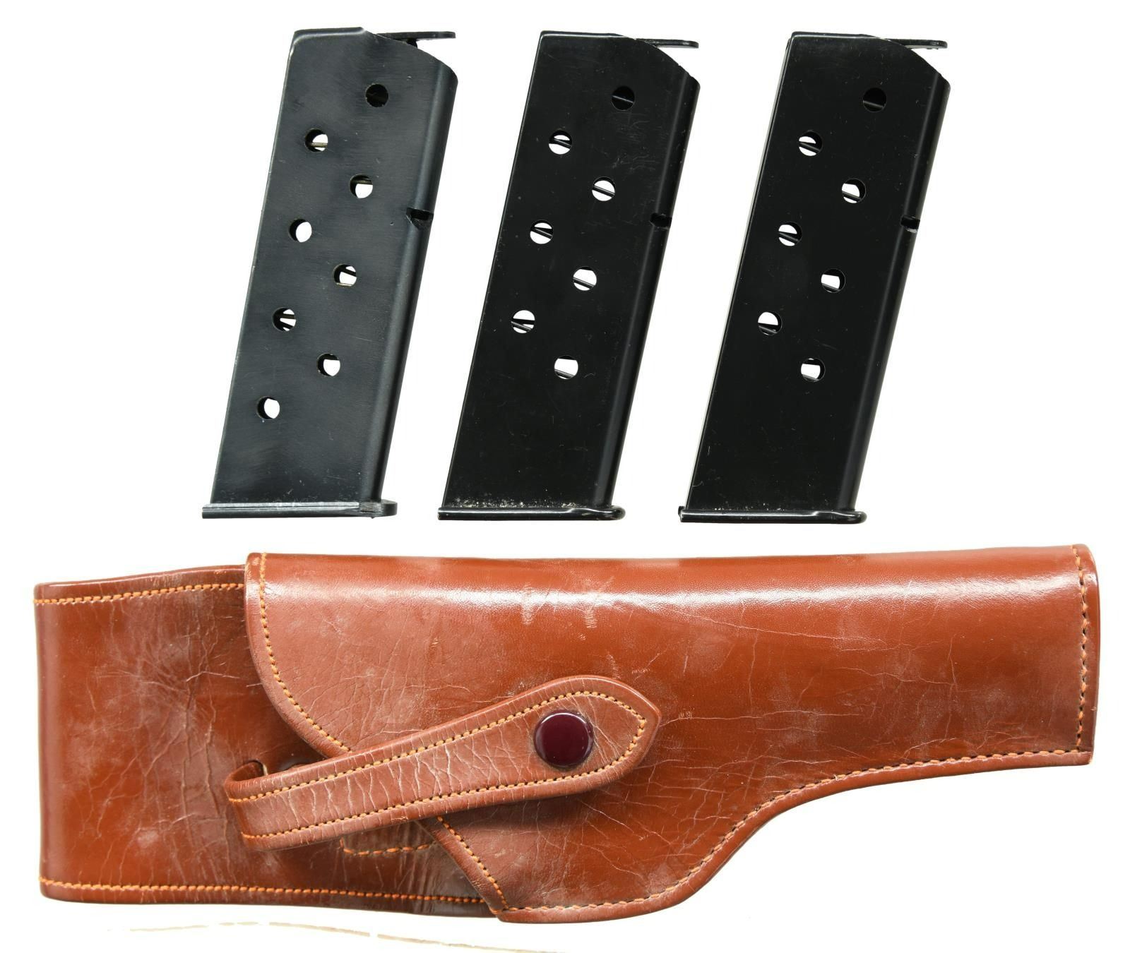 FROM NORTH KOREAN GENERAL & PRESENTED TO BRIGADIER GENERAL FRED SLADEN BY FUTURE SOUTH KOREAN CHIEF OF STAFF PAIK SUN-YUP. Cal. 7.62x25. S# c487. Bbl. 4.5". Mfg.1947. A Soviet Union TT-33 War Trophy as liberated from Korea & presented to U.S. Brigadier General Fred Winchester "Jim" Sladen Jr by Paik Sun-yup, who would later become the Joint Chief of staff of the Republic of Korea Army. This is the real deal, Soviet TT-33. No import marks, nor has it been modified for the required safety to be installed, such as on imported pistols. Original Russian TT-33s are difficult to find & many of the few that made it home arrived from WWII as souvenirs or war trophy's that had been previously captured by the Nazi's & modified by removing any reference to Mother Russia. This example was liberated from a North Korean General during the Korean War & still retains the black bakelite CCCP marked star grips. Slide has correct heavy, machined serrations & is numbered matching the frame. Markings include "C 487 1947" separated by the Izhevsk circle / triangle mark on left side of frame. Fixed sights. Lanyard loop below left grip panel. Serrated spur solid hammer. Left side slide release & mag. release. Matching numbers on frame, slide hammer group & barrel. MAGS: 4 original 8 rd. UNATTACHED ACCESSORIES: a letter hand written by Brigadier General Fred Winchester "Jim" Sladen Jr stating "Russian copy of our 45 Cal. removed from a North Korean General during the Korean conflict. Presented to me by Gen Paik Sun up, who later became Chief of Staff of the Korean Army". Blue cardboard presentation box w/ faded red satin interior w/ green ribbon. Brown leather holster. w/ blue felt interior. CONDITION: original blued finish enjoys remarkably complete & consistent coverage. Very little visible thinning or wear. Grips demonstrate only a few gentle signs of use, primarily on the top of the right panel where some light chipping is visible under close inspection. Each side retains the original circle & star, complete w/ original "CCCP" lettering. Bore is dark but still retains descent rifling. (23-2369/JZ). CURIO. $2,000-3,000. This pistol is from a massive archive of 3 generations of Sladens (1861-1975). There are 25 lots offered on Day 3 and will be sold in order. Included is a wonderful Korean scrapbook, lot 3393, of when Gen. Sladen was stations there for 16 months. This scrapbook has several letters from Paik Sun-Yup.
