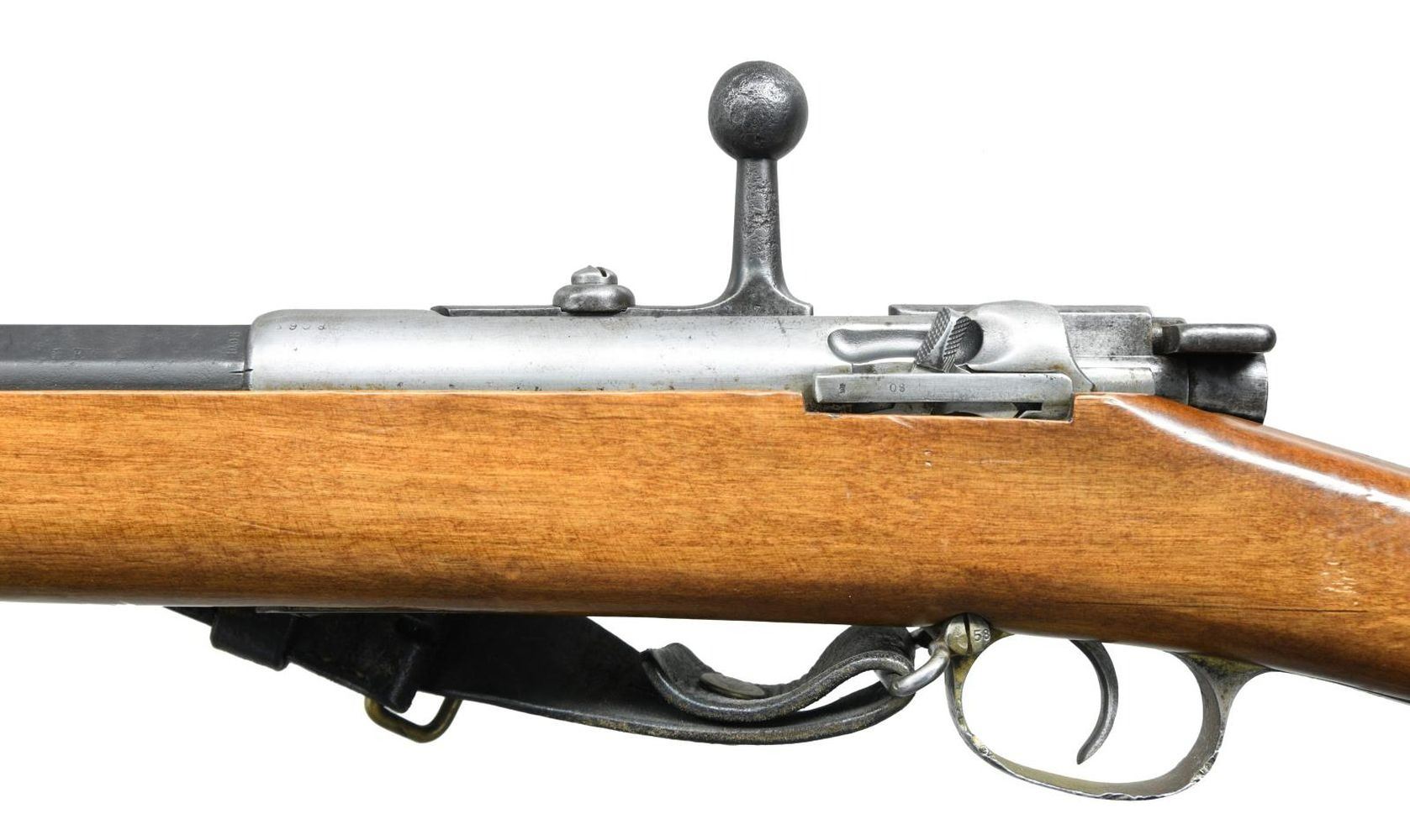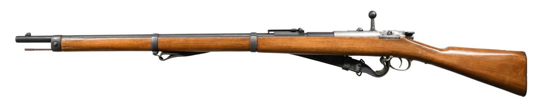"THE LAST SAMURAI". Cal. 11mm Mauser. S# 8908. Bbl. 31 1/2". Matching numbers on receiver, bbl., mag cutoff rear sight & front sight. Other parts are mismatched. Ladder rear sight graduated to 1500m. Blade front sight. This rifle was one of approx. rebuilt by the Gibbs Rifle Co. & used in the famous Tom Cruise movie "The Last Samurai". In the film the Imperial Japanese army used 71/84 rifles. As part of the Gibbs rebuild program trigger guards were spray painted gold, receivers were polished, blued parts refinished, the firing mechanisms were reactivated to fire blanks & newly made stocks were created. The two rear bands are a bit loose. Beech stock set w/ bottom mounted sling swivels & leather sling. Stock has newly added cartouches. UNATTACHED ACCESSORIES: Gibbs Rifle Co. certificate of authenticity detailing the rifles rebuild, movie use & history from Val Forgett. CONDITION: stock has added varnish w/ several long cracks behind nosecap, scattered scratches, dings & handling wear. Bottom metal is turning silver w/ strong traces of gold paint, scattered pitting & oxidation. Receiver & bolt are turning gray w/ scattered oxidation & pitting. Bbl. & bands retain most of their dull reblue finish w/ scattered pitting beneath the bluing, some light dings & edge wear. Bore has a ring near muzzle & scattered pitting. (01-23452/MJC). ANTIQUE. $500-800.