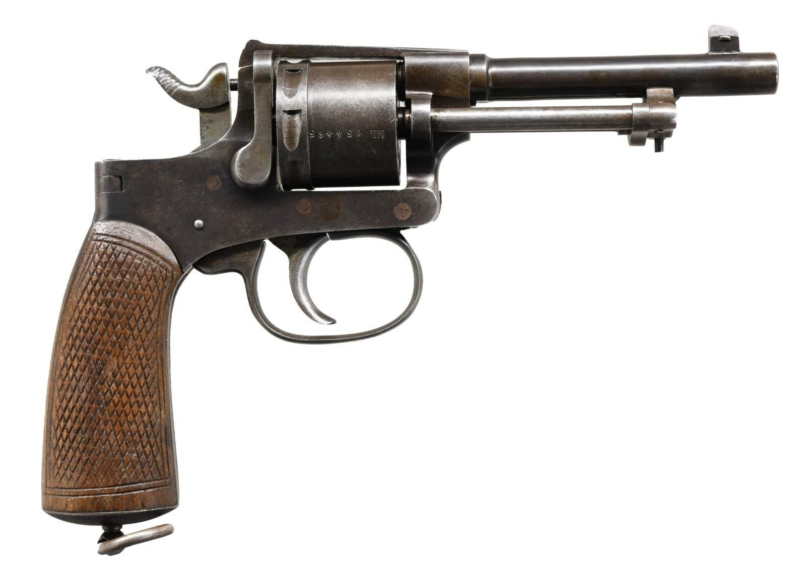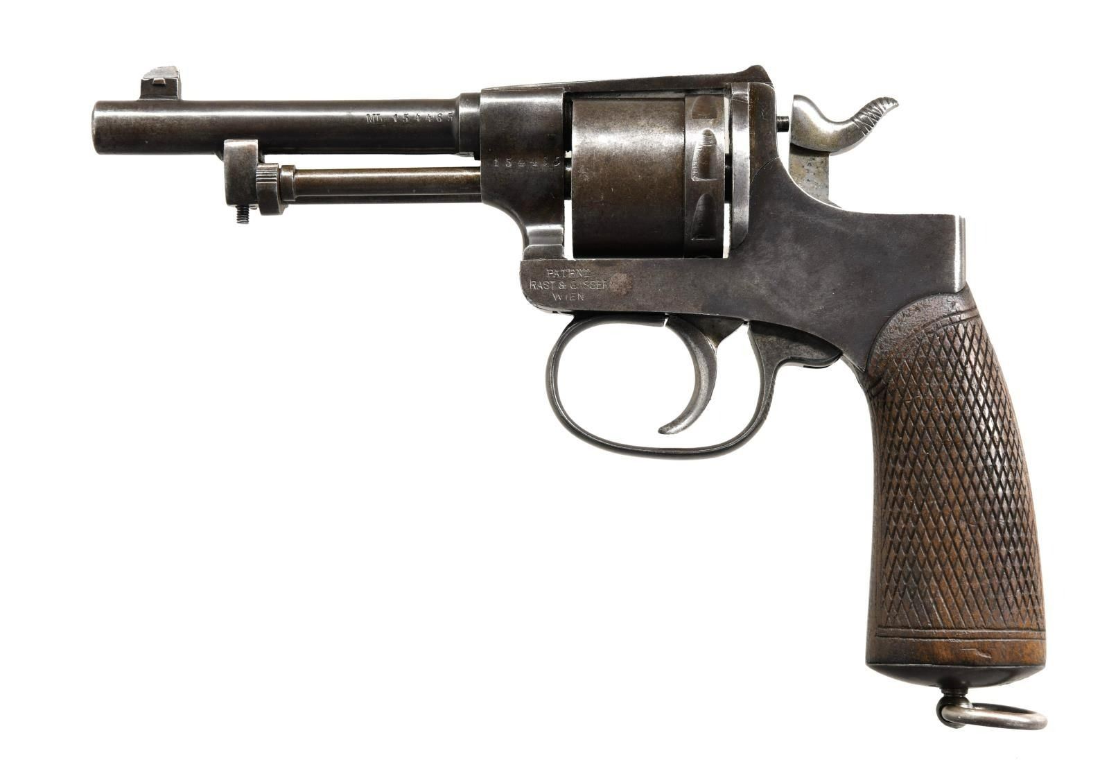 DOUBLE ACTION REVOLVER. Cal. 8mm Gasser. S# 154465. Bbl 4 5/8". Model 1898 double action revolver manufactured by Rast & Gasser in Wien Austria. Left side of frame sideplate is stamped "PATENT/ RAST & GASSER/ WIEN". Top strap bears an Austrian 1917 acceptance proof. Pommel is stamped "24" with a line over "21". Metal components are blued, with the frame being mounted with 2 piece checkered wood grips. Matching numbers are present on the frame, sideplate (interior), left grip panel (interior), cylinder, barrel, and ejector rod/cylinder pin lug. Dovetailed blade front sight with frame V-notch rear sight. CONDITION: metal components exhibit wear and thinning overall that shows through to a pleasant gray patina. Bright bore, exhibiting scattered areas of pitting and fair rifling throughout. Grips show some scattered marks from handling and storage, but are otherwise very good overall. PROVENANCE: Collection of Horst Kreiner. (23-5065/MLW). CURIO. $500-1,000.