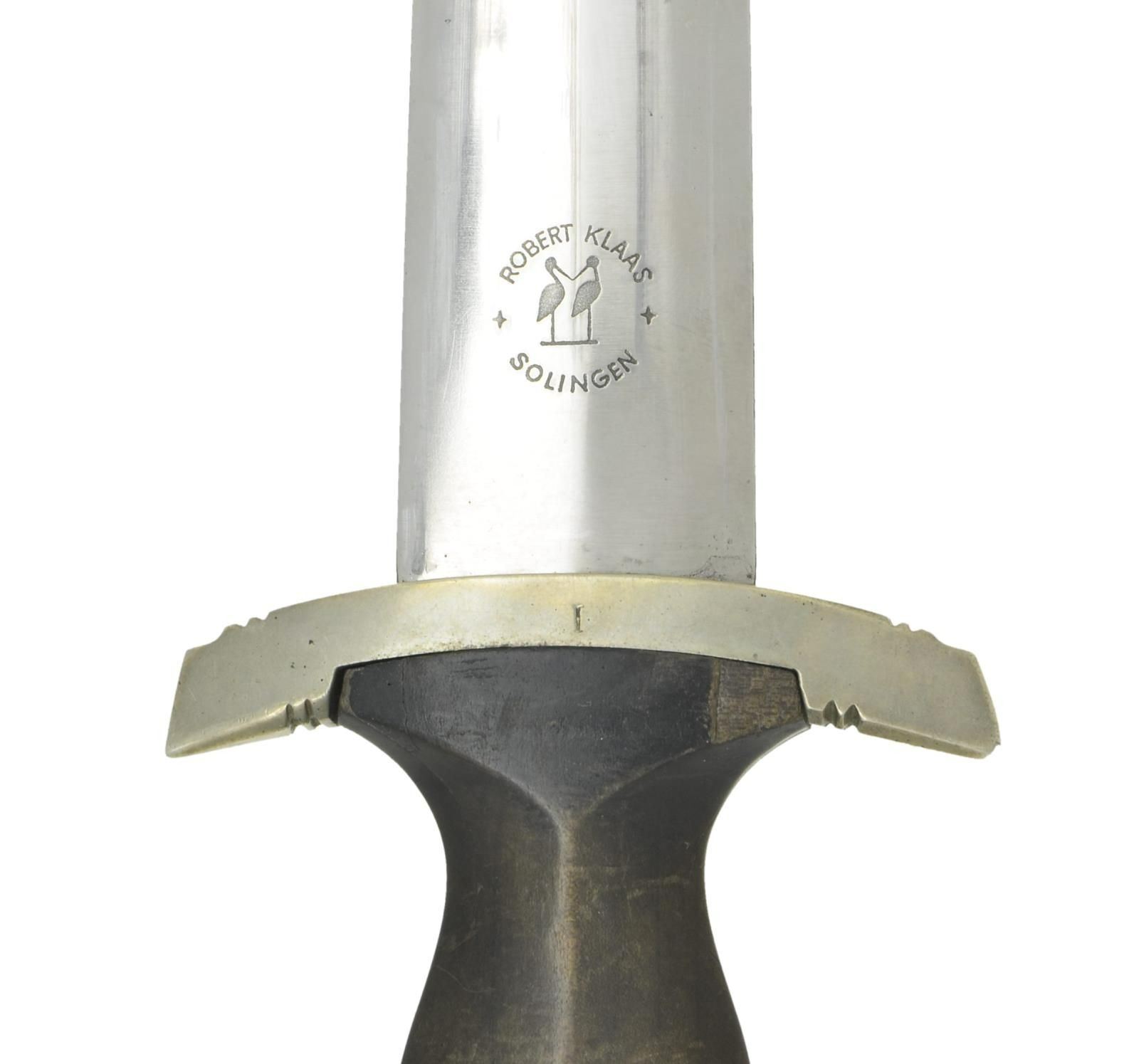Overall length 14 3/4”. Blade is etched on one side “Meine Ehre Heisst Treue” and is marked near the hilt on the other side “ROBERT KLAAS (logo) SOLINGEN”. Nickel silver cross guard & pommel with the rear of the cross guard stamped “I”. Black wood grip with plated eagle and black enamel SS button. Scabbard has plated mounts on a black enameled body. Hanger is complete and includes belt loop. CONDITION: blade shows notable scabbard wear. Hilt generally shows light wear, but the grip appears to be broken and reglued on the right top edge. Scabbard has minor wear to the finish. Hanger shows light to moderate wear, as does the belt loop. PROVENANCE: From the Lifelong Collection of Glen E. Mattox. (02-18262/BF). $2,500-3,200.