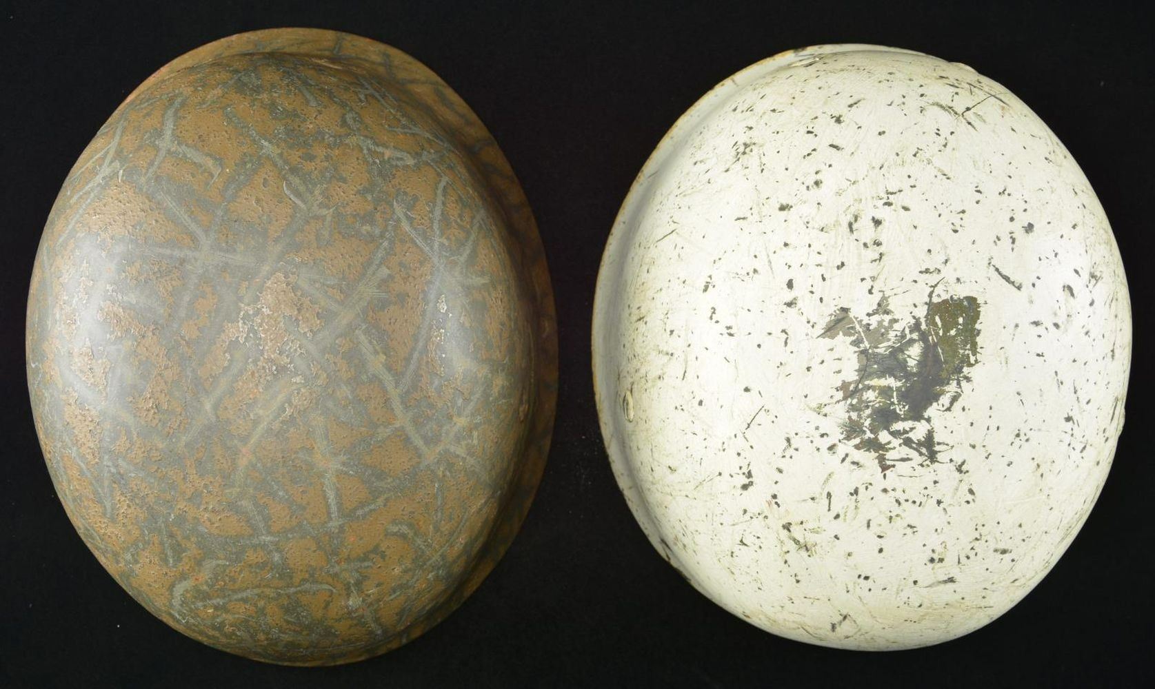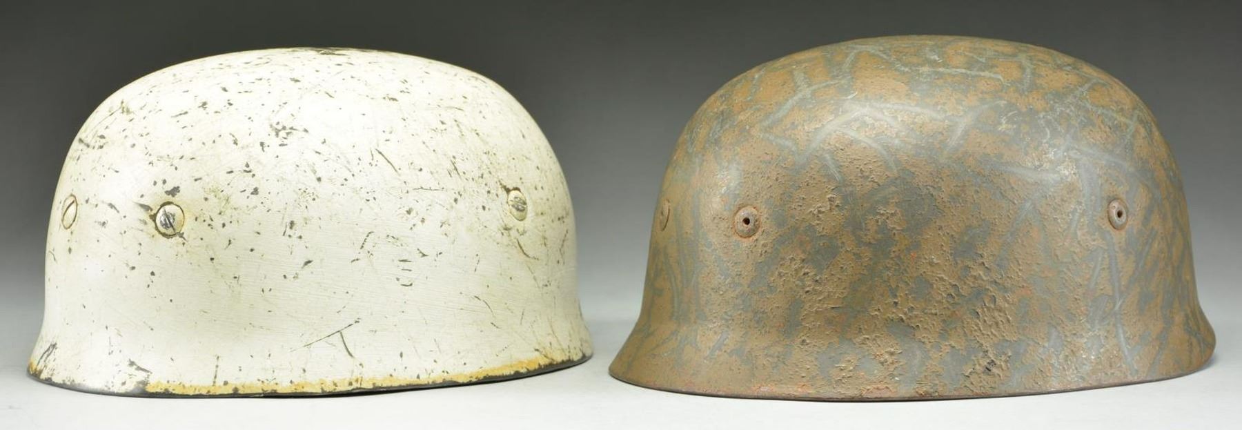 These two helmets are believed to be of post WWII production and were made for the collectors market. 1) This helmet has been overpainted in white winter camouflage. No decal or ghost of a decal is apparent. There are no visible stampings on the inside of the helmet. The leather liner is marked “Kopfweite: Gr. 58” & “Stahlhelm - Gr. 68”. The liner is further marked “Baumuster: Heisler, Berlin C2 Hersteller: F.W. Muller Jr.”. The harness appears to be a gray finished leather backed with dark brown sueded leather. CONDITION: helmet shows significant artificial use with minor areas of oxidation. Liner & harness show overall light wear. 2) This helmet has been overpainted with brown & gray in a camouflage pattern. There is a Luftwaffe decal clearly apparent on the left side. The inside left is stamped “ET71” and the inside rear is stamped “6667”. The brown colored liner is stamped “Kopfweite Gr. 59” & “Stahlhaube Nr. 71”. The harness appears to be gray finished leather backed with a brown sueded leather. CONDITION: helmet shows enhanced wear with very light oxidation around the lower rim. Harness & liner show light to moderate wear. (02-18114-3/BF). $800-1,200.