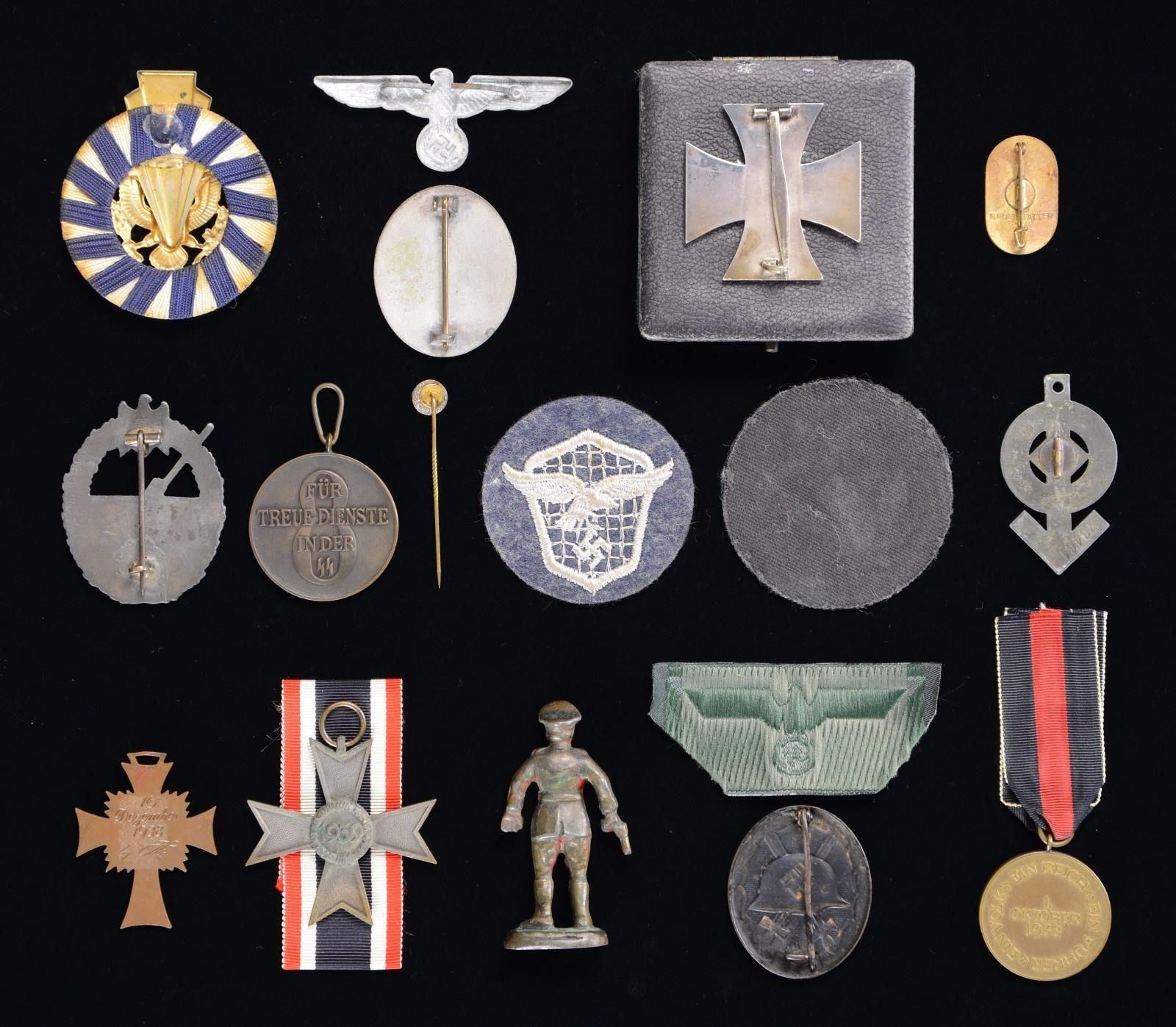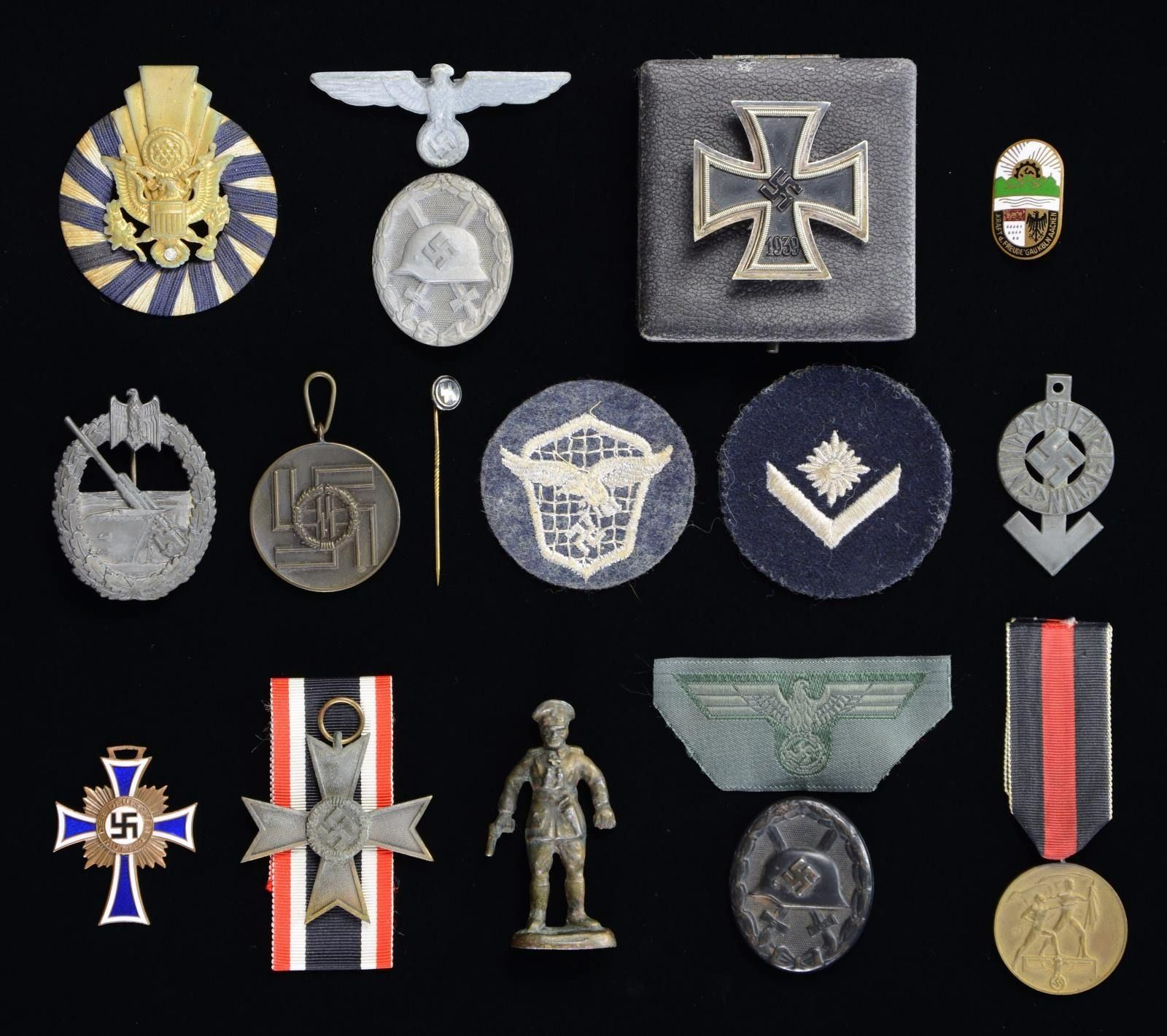 This lot includes 1 Sudetenland Medal with undersized ribbon. / 1 War Merit Cross without swords, with ribbon. / 1 Army metal cap eagle. / 1 Silver Wound Badge of solid construction. / 1 Bronze Mother’s Cross with no ribbon. / 1 Black Wound Badge. / 1 Bevo Army cap eagle. / 1 Luftwaffe specialty patch. / 1 HJ Proficiency Badge with no pin. / 1 German Youth Leaders Patch. / 1 Small metal figure of a German officer. / 1 Reproduction SS 8-Year Service Medal. / 1 Reproduction SS stick pin. / 1 Enamel pin that reads “KRAFT d. FREUDE’ GAU KOLN AACHEN”. / 1 Coastal Artillery War Badge of questionable age. / 1 WWII 1st Class Iron Cross in original issue case. Cross is unmarked but has a magnetic center. / 1 Unknown US Army Badge, possibly for a beret. CONDITION: all items show light to moderate wear. (02-19755/BF). $600-900.