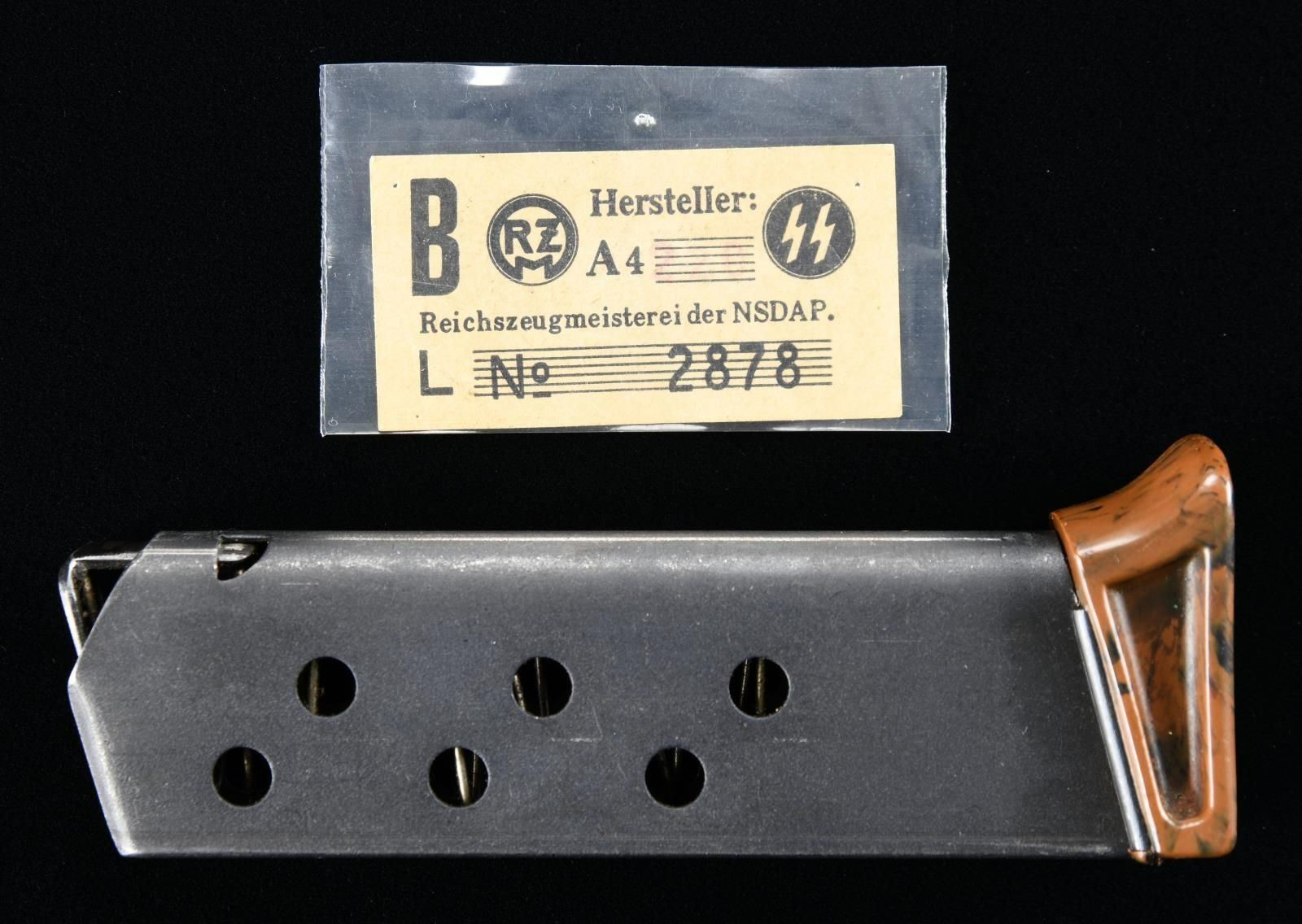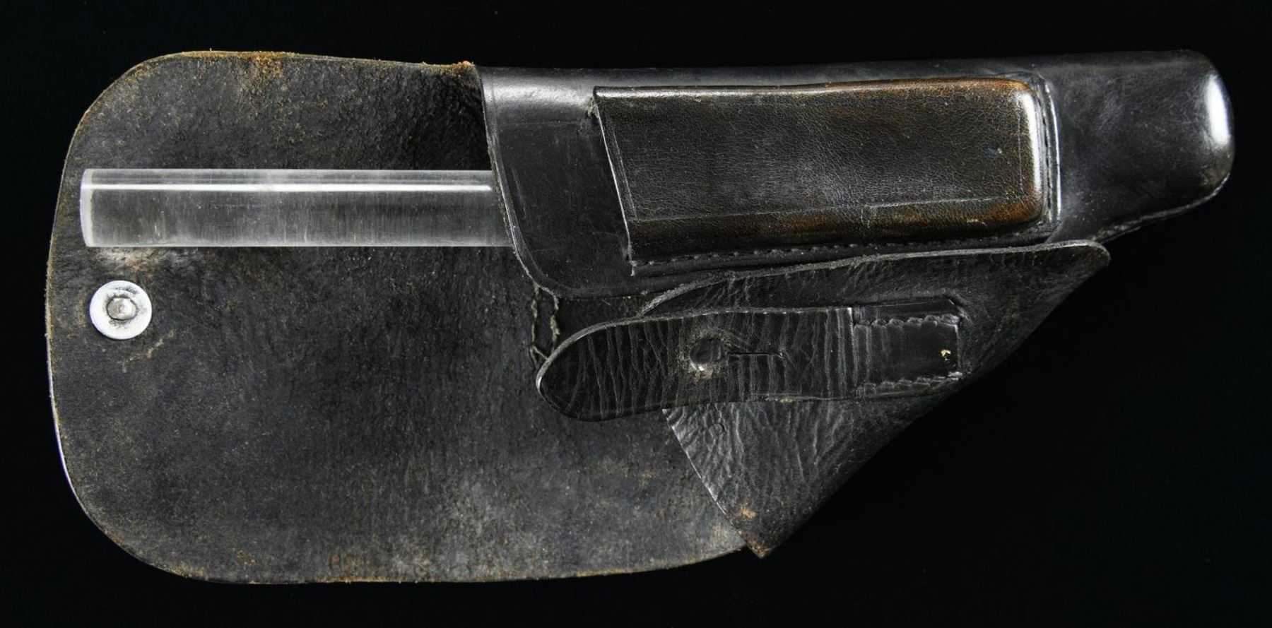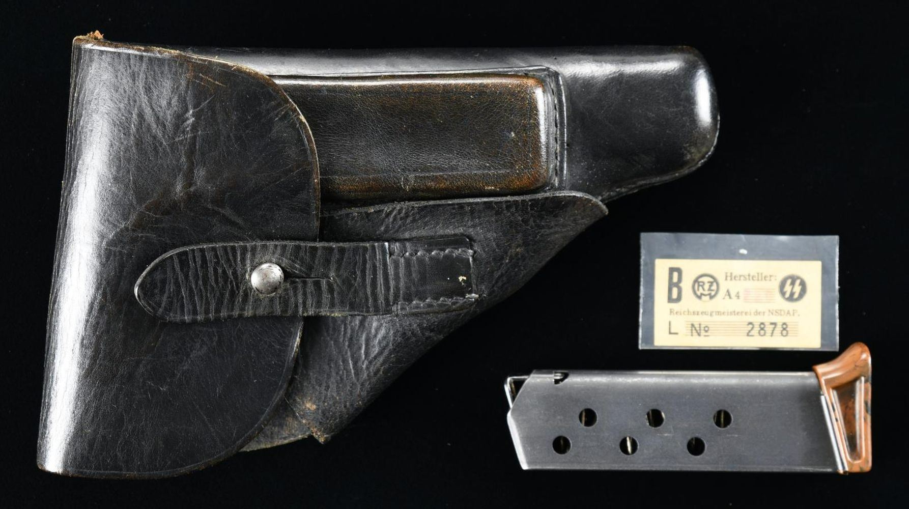 1) Dark brown leather PPK holster manufactured by D.R.G.M., with "D.R.G.M. stamped on the flap. CONDITION: holster remains malleable, exhibiting wear and marks from handling and storage, with some mild age related cracking. 2) Walther PPK magazine with brown/black grip extension. Walther banner logo on left side of magazine body. Housed within a small riker case with an RZM tag. CONDITION: magazine exhibits moderate superficial wear from use, exhibiting some areas of light silvering overall. Grip extension is very good. (02-19754/MLW). $300-500.