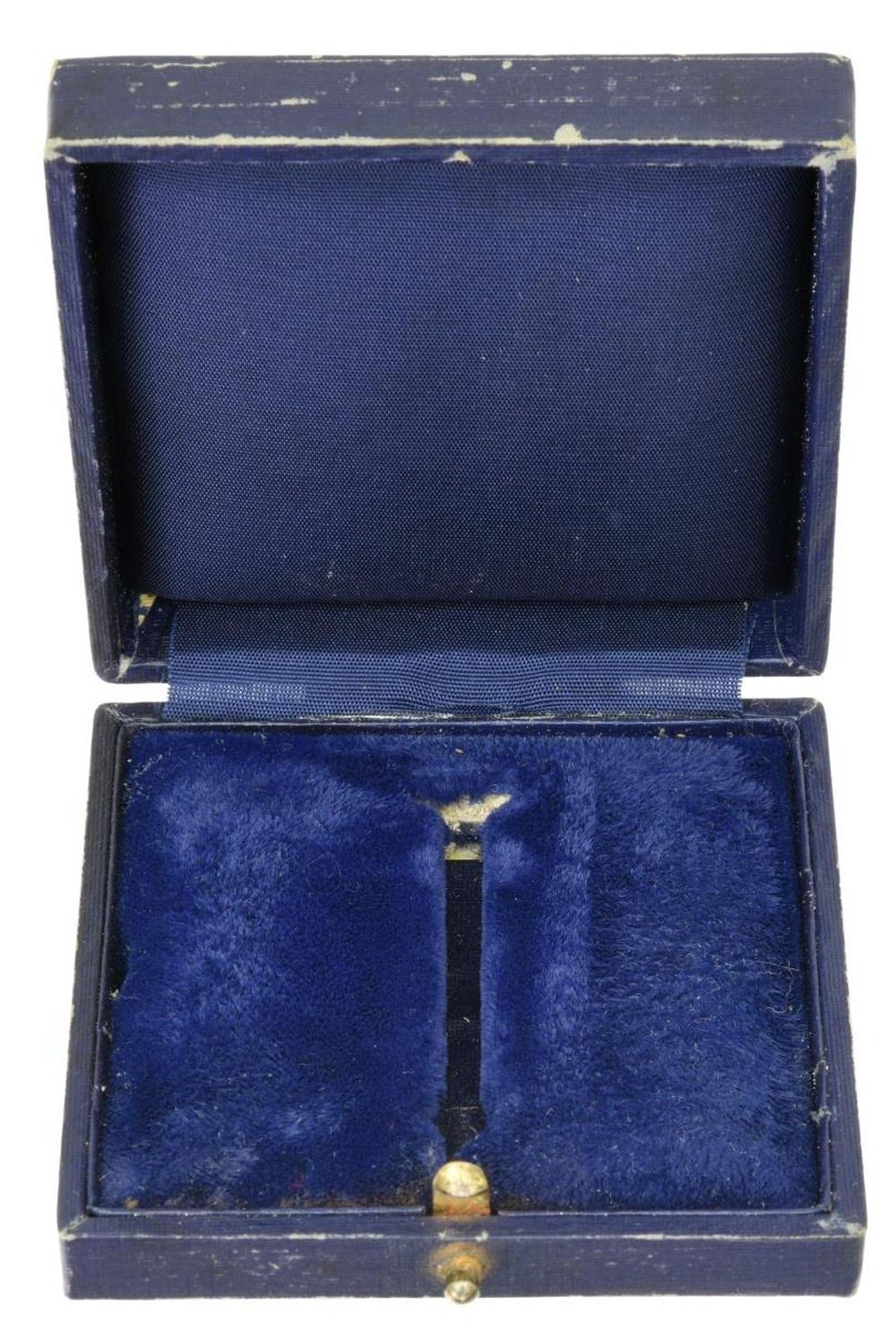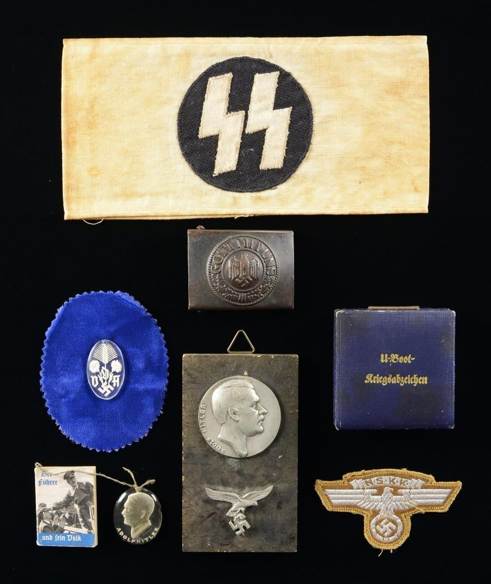 1) A small plaque measuring 4 3/4" x 2 1/4" with an Adolf Hitler medallion above an early Luftwaffe eagle. Medallion appears to be aluminum and is 2” in diameter with a neck-up view of the German leader. CONDITION: light wear. (02-19756/BF). 2) An army enlisted man’s belt buckle in dark finish with a disc on the front that reads “GOTT MIT UNS” with a central Wehrmacht eagle. CONDITION: light wear. (02-19757/BF). 3) Case only for a U-boat badge. Case has a black leatherette cover and is embossed on the front “U-Boot- Kriegsabzeichen”. The interior base is blue velvet with a rayon pad in the top. CONDITION: box shows light wear overall. (02-19758/BF). 4) NSKK Senior NCO breast eagle. Eagle is flat, silver bullion on brown with a tan backing. CONDITION: light wear. (02-19759/BF). 5) 3 WHW pieces including a small glass pendant with white reverse decoration for the VDA, and a glass pendant with a bust of Adolf Hitler attached to a miniature book titled “Der Fuhrer und sein Volk”. CONDITION: light wear. (02-19760/BF). 6) A WWII style SS armband reported to be for medical personnel. Armband is white with stitched “SS” runes on a black sewn background. We believe this to be of post-WWII production. CONDITION: armband is solid but stained. (02-19761/BF). $300-500.