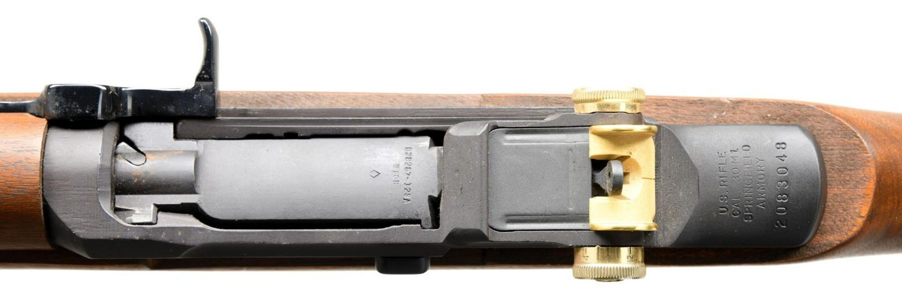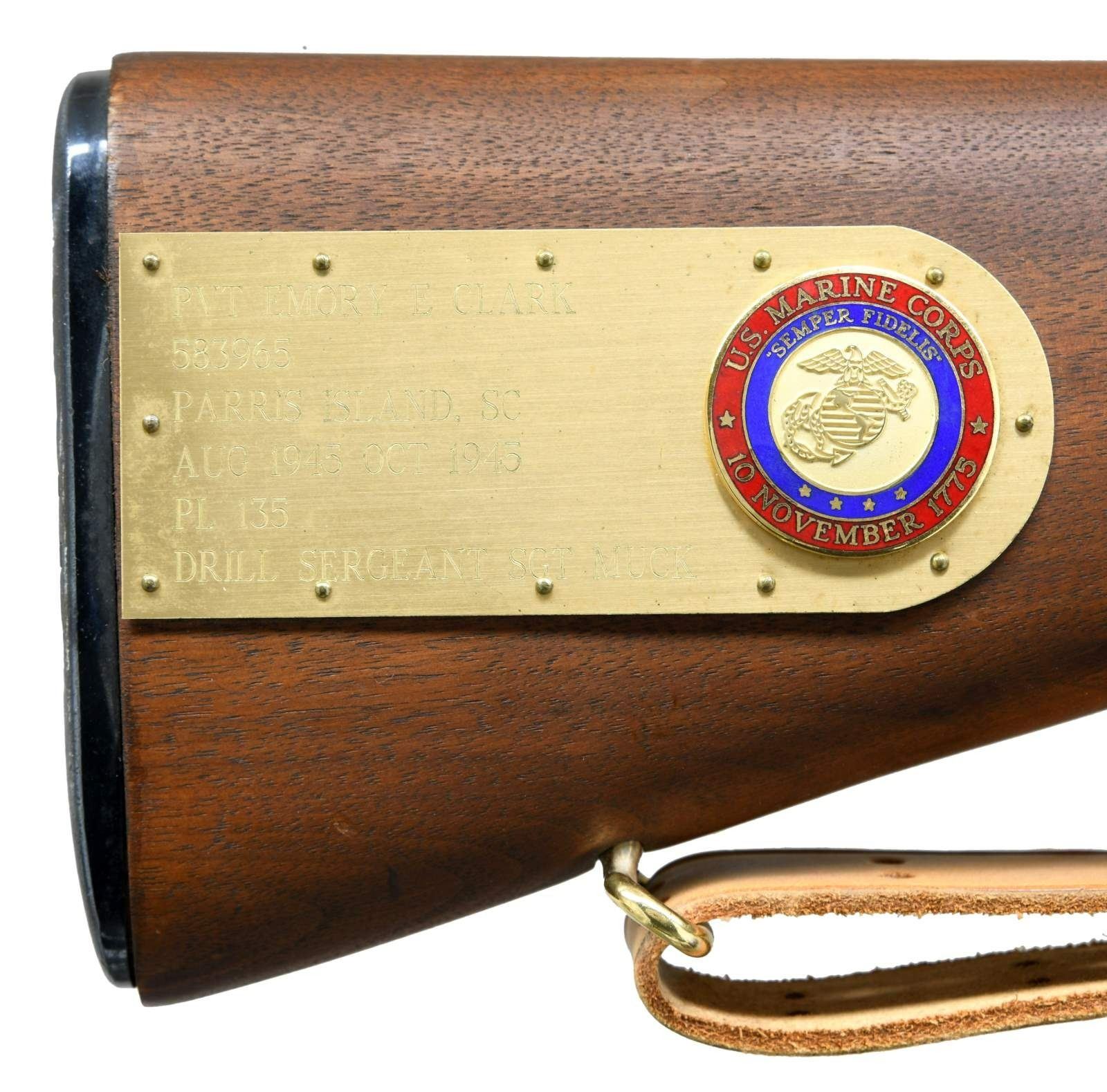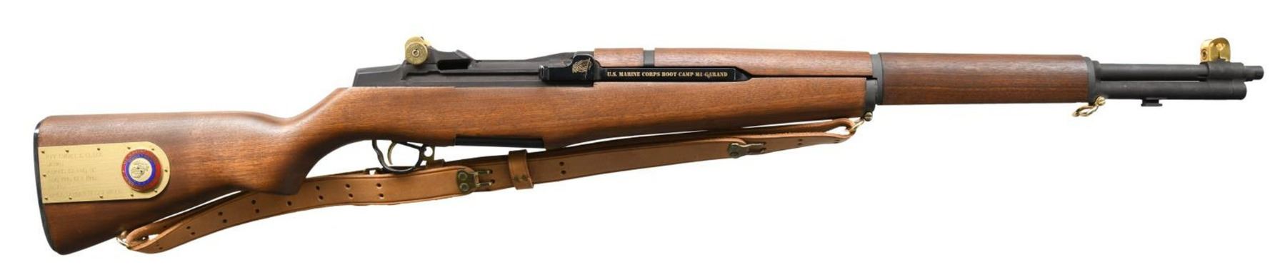 RIFLE. Cal. 30-06. S# USMC032. Bbl. 24" marked "1-56 AY". Blade front sight w/ protective ears. Aperture rear sight. 1944 mfg. Springfield receiver. Number 32 of 500 Garands assembled by the American Historical Foundation to commemorate Marine Corps boot camp. Balance of metal has parkerized finish w/ blued buttplate, operating rod & trigger guard. Gold trigger, safety, rear sight knobs, sling swivels & front sight. Right side of operating rod has gold American flag & the words "U.S MARINE CORPS BOOTH CAMP M1 GARAND". Walnut stock set w/ bottom mounted sling swivels & repro M1907 sling. Right side of stock has gold plaque w/ USMC emblem. Right side of stock also marked "PVT EMORY E CLARK 583965 PARRIS ISLAND SC AUG 1945 OCT 1945 PL 135 DRILL SERGEANT SGT MUCK". CONDITION: stock set shows a couple light dings & some handling marks. Metal retains nearly all of its finish w/ some sparse light oxidation & edge wear. Very good bore w/ some light frosting. (23-2556/MJC). CURIO. $1000-2000.