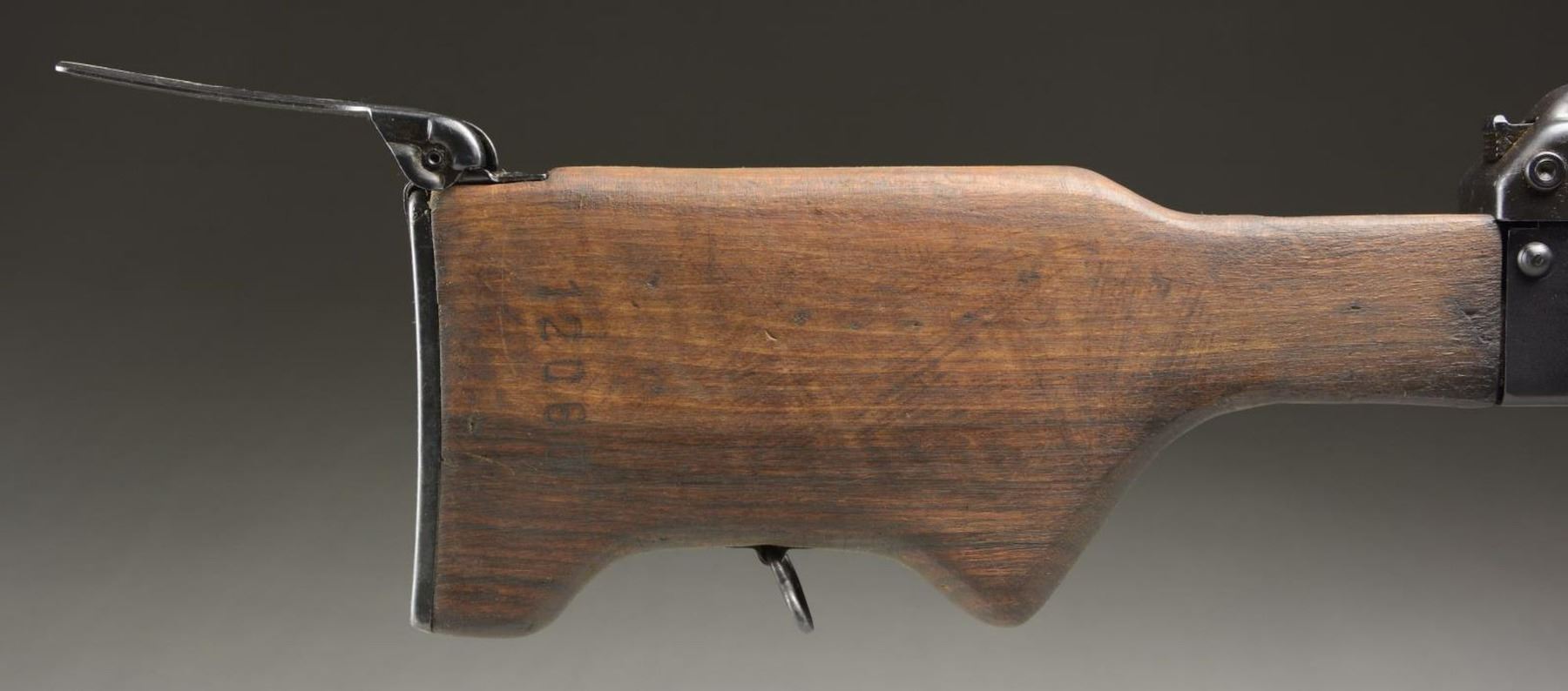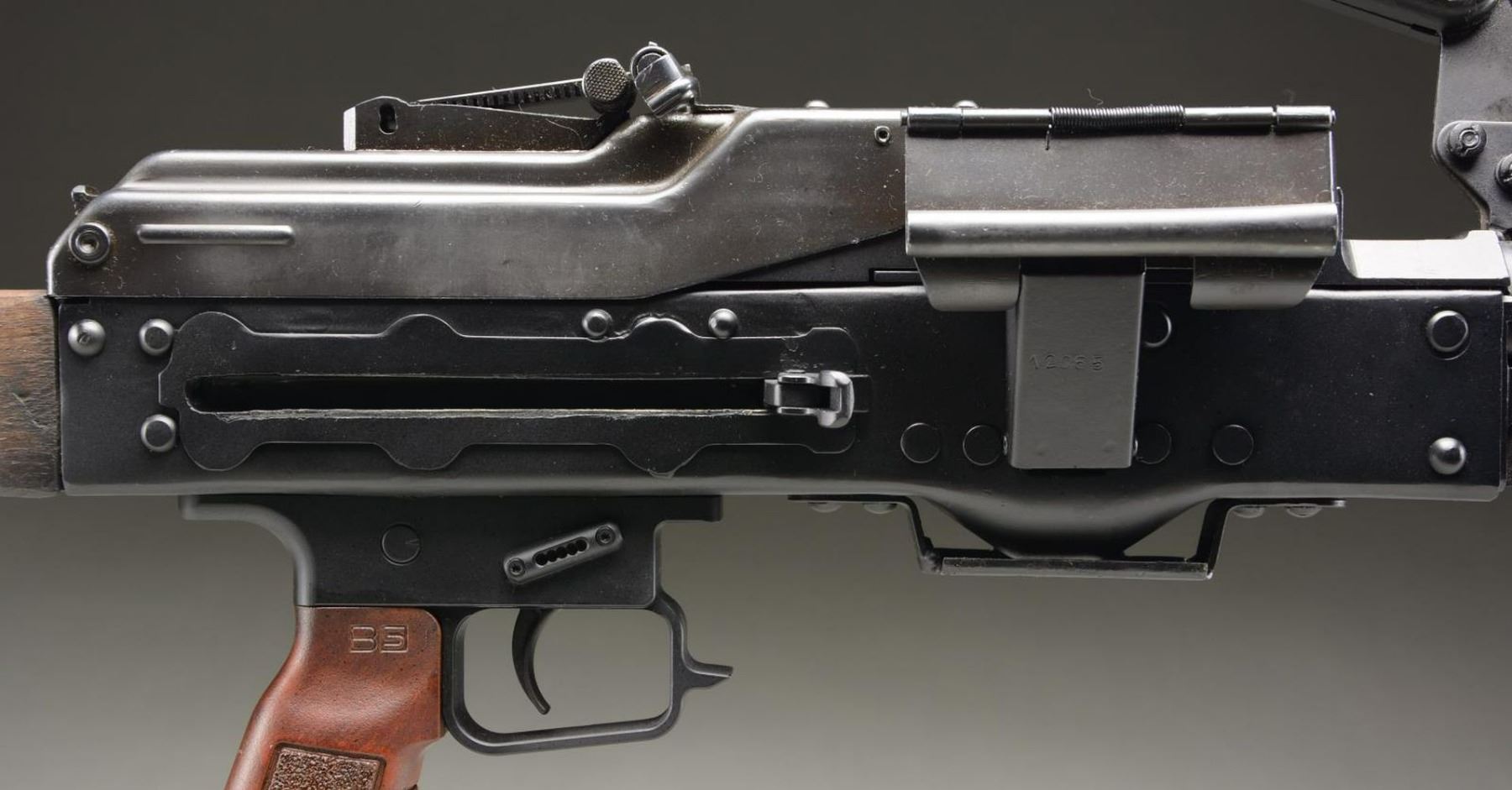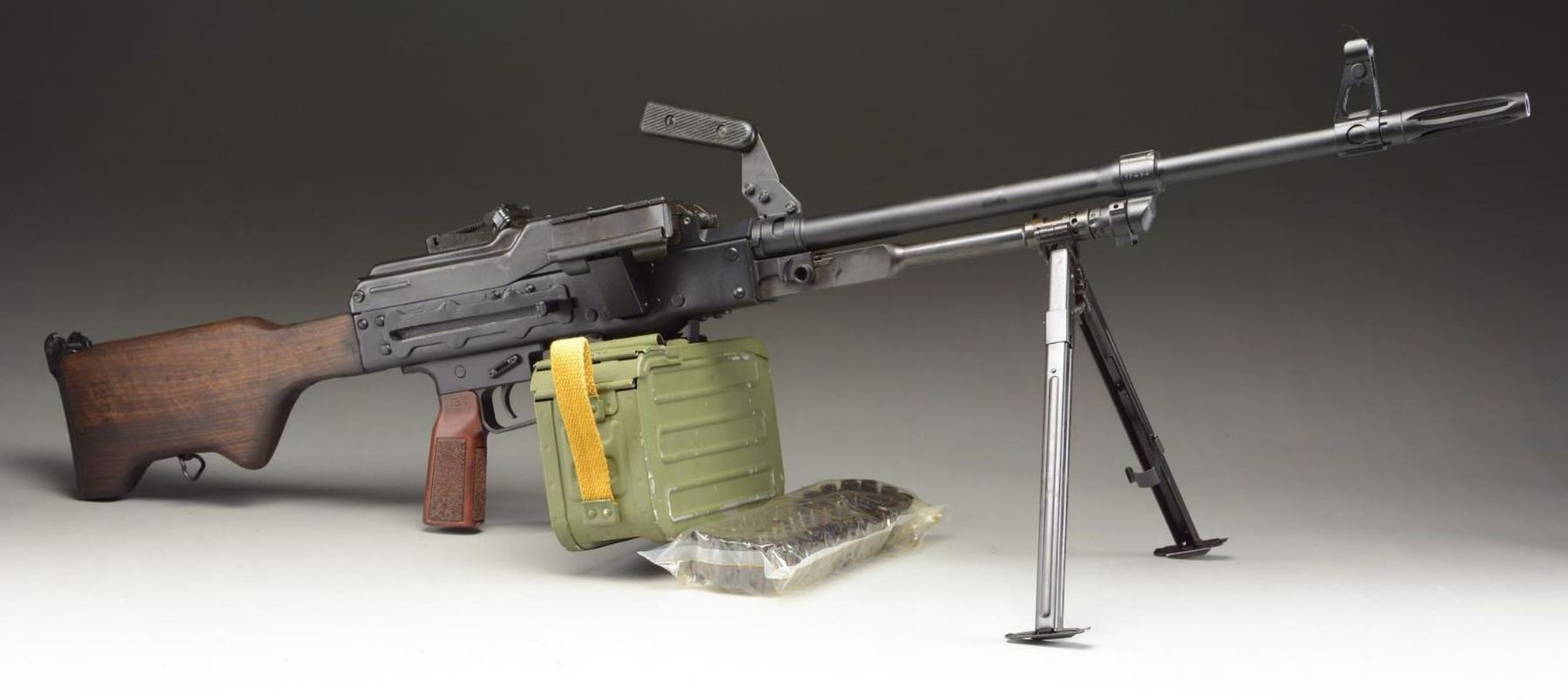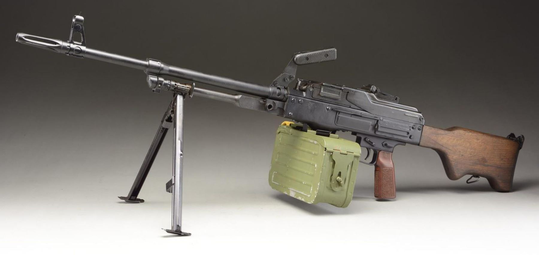 Cal. 7.62x54R. S# 12065. Bbl. 23.75". The Zastava Arms M84 is a variation of the Russian PKM Light Machine Gun intended for infantry units, also excelling at long distance precision. This particular example was built by Visionary Arms as a semiautomatic only version & utilizes a modified AR-15 type trigger group. Closed bolt, gas operated mechanism, charged w/ right side reciprocating charging handle. Dark matte black finish on all exposed metal surfaces. Barrel is terminated w/ correct M60 style flash hider. Protected post front sight. Tangent rear sight adjustable to 1500 meters as well as windage adjustable. Folding bipod attaches rear of gas regulator below barrel. Left side folding carry handle forward of front trunnion w/ black plastic handle. Left side safety selector. Red/brown dyed pistol grip to match wood finish. Solid, hardwood shoulder stock w/ flip up shoulder support. Sling swivels front & rear. Left side receiver scope mount. Left side spring loaded dust cover. MAGS: 1 original 100 rd belt. UNATTACHED ACCESSORIES: 100 round belt box, green w/ tan canvas strap. CONDITION: finish coverage is complete & consistent. Only thinning is in areas of mechanical intervention & a few high spots. It doesn't appear to have been used much, if at all. Pistol grip looks beautiful & wood shoulder stock only has a few typical impressions. Bore is bright w/ strong rifling. Fire control mechanism appears to function correctly when cycled by hand. (23-2360/JZ). MODERN. $7,000-9,000.