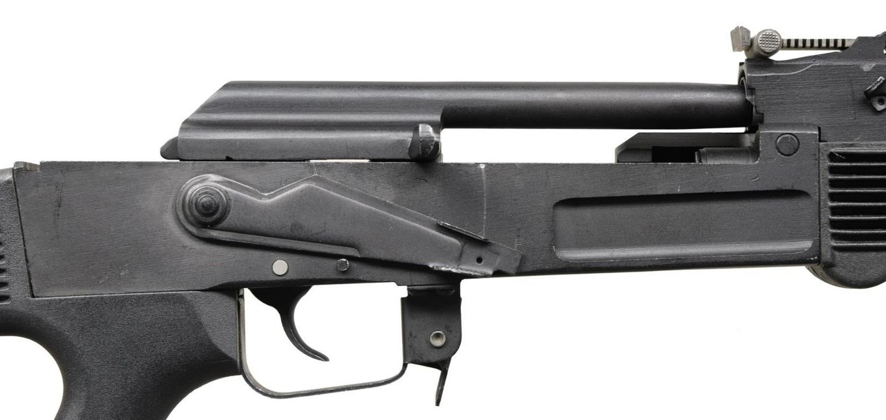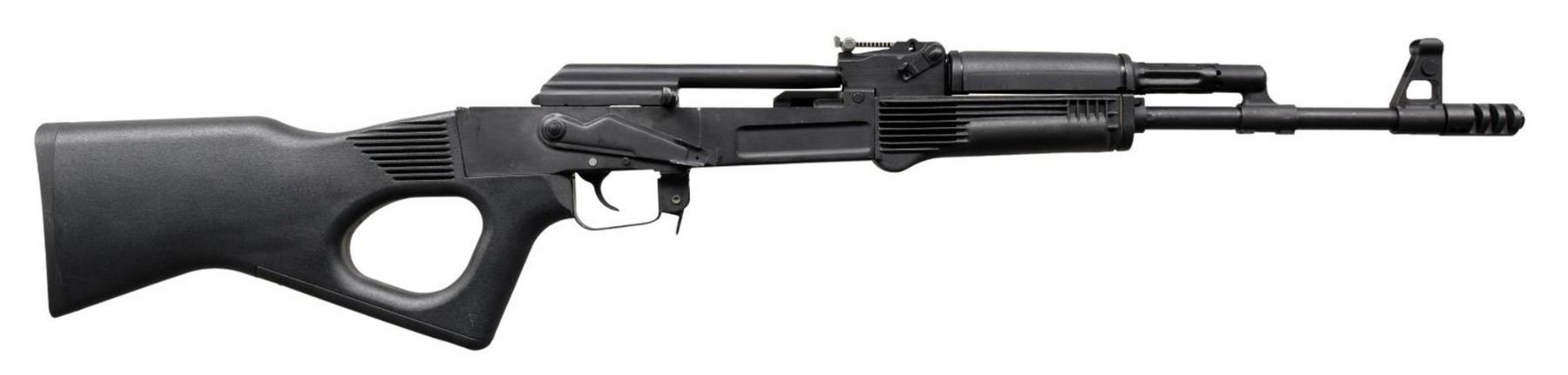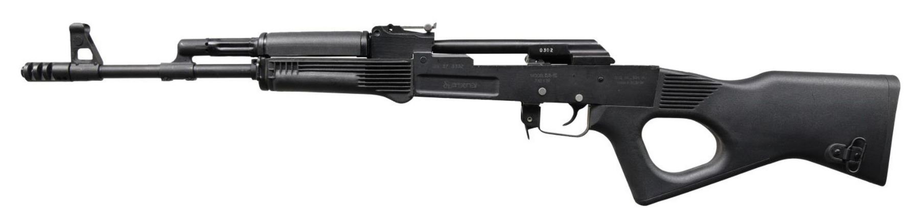 Cal. 7.62x39mm. S# BA370302. Bbl.16". Mfg.1994-1998. Bulgarian milled receiver AK variant. Flat black painted finish. Black plastic furniture. Protected post front sight. Tangent rear sight marked to 800 meters. Barrel terminated w/ pinned muzzle brake. Right side reciprocating charging handle. Right side safety / selector. Thumbhole, sporter shoulder stock. Imported by Dominion Investment Group of Virginia Beach, VA. UNATTACHED ACCESSORIES: Green canvas sling & cleaning kit. CONDITION: Aside from a small scratch where the safety contacts the receiver there is very little sign of prior use. No typical carbon buildup on fire control group parts. Top cover is absent. Bright bore w/ strong rifling. Fire control mechanism appears to function correctly when cycled by hand. (23-1442/JZ). MODERN. $ 800-1,200.