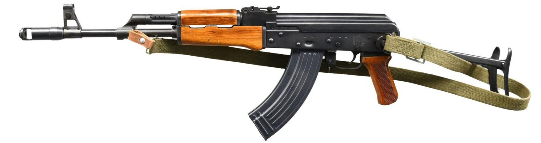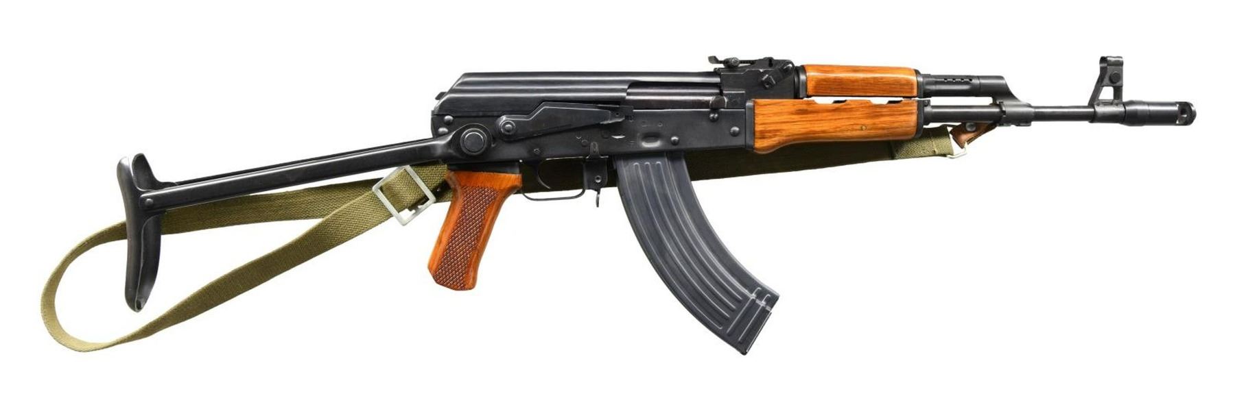 Cal. 7.62x39. S# MSO11461. Bbl. 16". The ultimate in early 1990s gun culture were the Chinese mfg. AK47 variants that were once so plentiful & inexpensive. As the H.W. Bush import bans started up in the late 1980s, the familiar designs, started to have different model designations. In this case, the prior AKS models morphed into the model NHM before being branded as “assault weapons” & eventually heavily restricted. One of the first new restrictions regarding the semi automatic versions to go into effect was mandated by executive order w/out legislative involvement & banned the importation of guns that didn’t qualify as having a sporting purpose. This particular example is a textbook transitionary piece w/ its reddish hardwood furniture, stamped receiver & under-folding stock. Protected front sight post & rear sight adj. in elevation to 800m. No bayonet lug. Safety selector on right side of receiver. Threaded muzzle brake. Arsenal stamp Triangle "66". Left side of receiver stamped; "NHM90 / 7.62X39MM / MADE IN CHINA / BY NORINCO". Currently sporting green canvas sling. MAGS: (2 total) 1 steel 30 rd. & 1 steel 5 rd. CONDITION: all outward appearances indicate that this particular example may not have been used very much, if at all. Finish coverage is complete & consistent w/ only noticeable thinning a line on receiver from mechanical intervention w/ safety / selector. Stock locks tightly in all positions. Fire control mechanism appears to function correctly when cycled by hand. Bore is shiny w/ strong rifling. (23-5030/JZ). MODERN. $1,000-1,500.