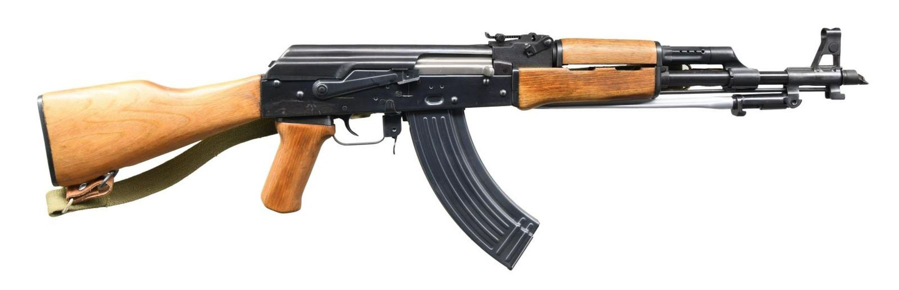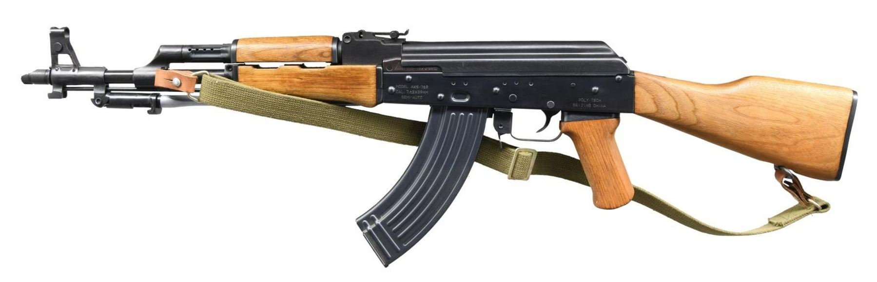 Cal. 7.62x39. S# PW85-762-05543. Bbl. 16". ”. The ultimate in 1980s gun culture were the Chinese mfg. AK47 variants that were once so plentiful & inexpensive. The highest quality & most sought after variants were mfg. by Polytech & imported in numerous configurations. As their popularity increased in the United States w/ shooters, collectors & the availability of the once rare 7.62x39mm ammunition improved, we were faced w/ the first of numerous pieces of legislation dealing w/ the propaganda push of the day & firearms w/ similar attributes were branded “assault weapons” & eventually heavily restricted. One of the first new restrictions regarding the semi automatic versions to go into effect was mandated by executive order w/out legislative involvement & banned the importation of guns that didn’t qualify as having a sporting purpose. This particular example is a textbook piece w/ its blond hardwood furniture. Stamped receiver. Hooded front sight post & rear sight adj. in elevation to 800m. Safety selector on right side of receiver. Complete w/ its folding spike bayonet, threaded bbl. & slanted muzzle brake. Blued finish. Arsenal marked w/ triangle "416". Left side of receiver stamped; "AKS-762 / 7.62X39MM / SEMI-AUTO" above mag well, & marked "POLY TECH / BEIJING, CHINA" above pistol grip. Lower receiver channel, forward of mag well marked; "IMPORTED BY / KFS / ATLANTA, GA". Currently sporting green canvas sling. Shoulder stock trap door. MAGS: 1 Poly Tech 30 rd. factory. CONDITION: Blued finish is complete & consistent w/ some light thinning on right side of receiver above pistol grip & small mark on top cover on left side. Bright bore w/ strong rifling. Fire control mechanism appears to function correctly when cycled by hand. (23-5032/JZ). MODERN. $1,750-2,500.