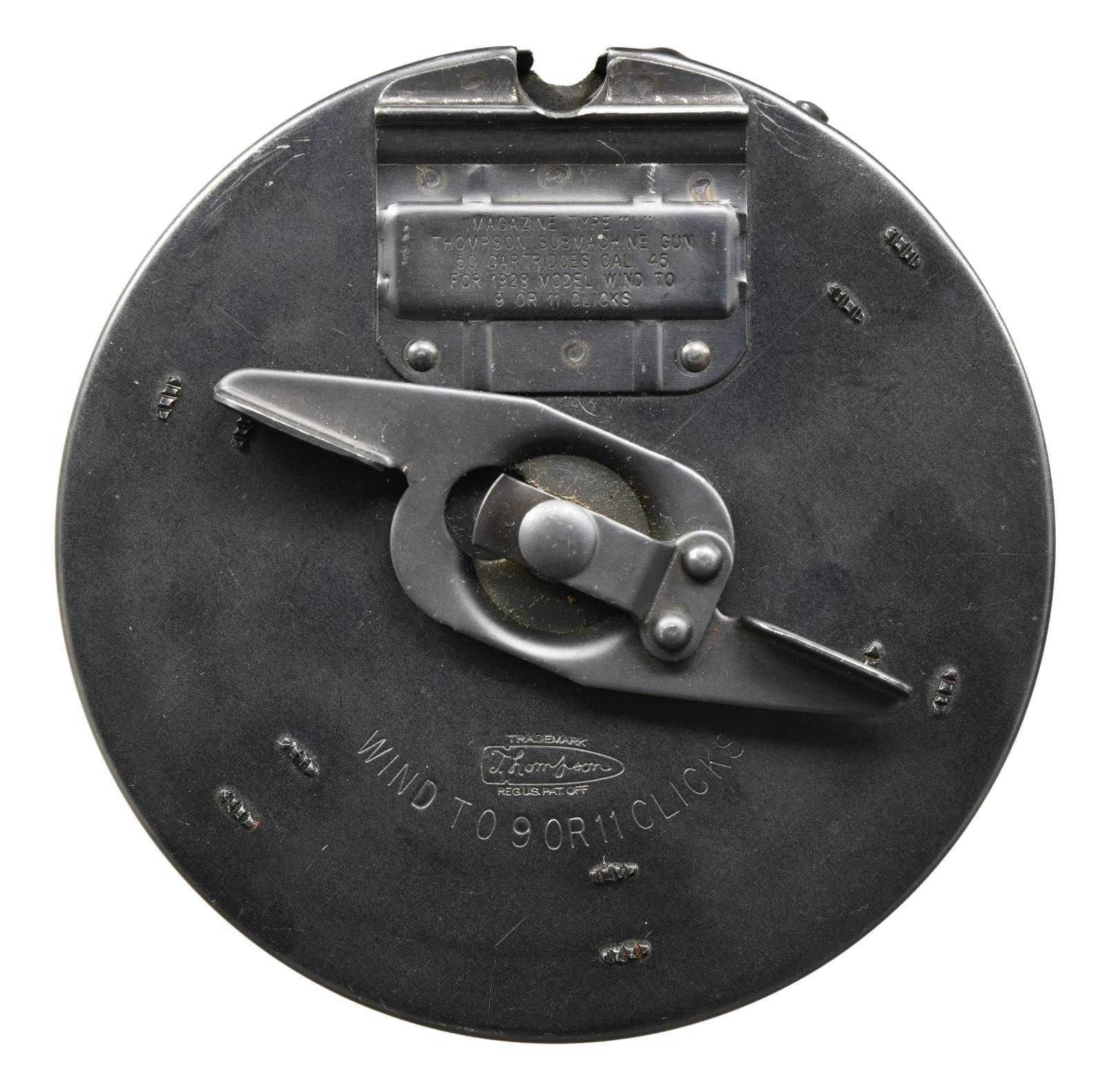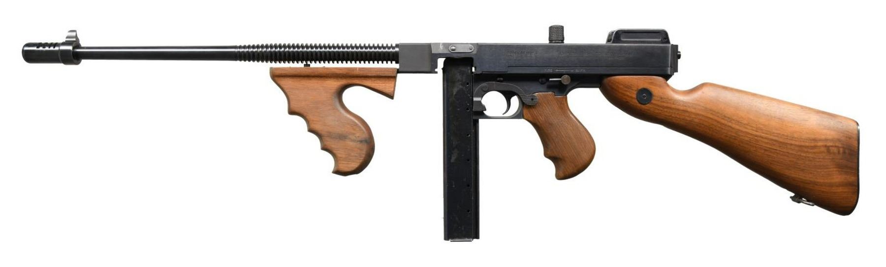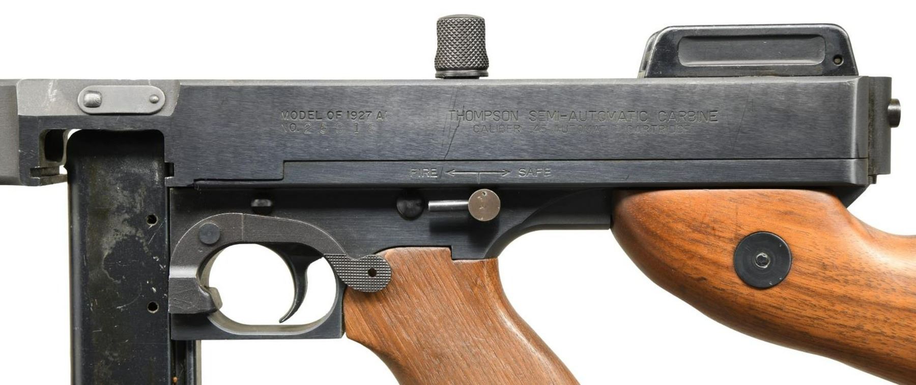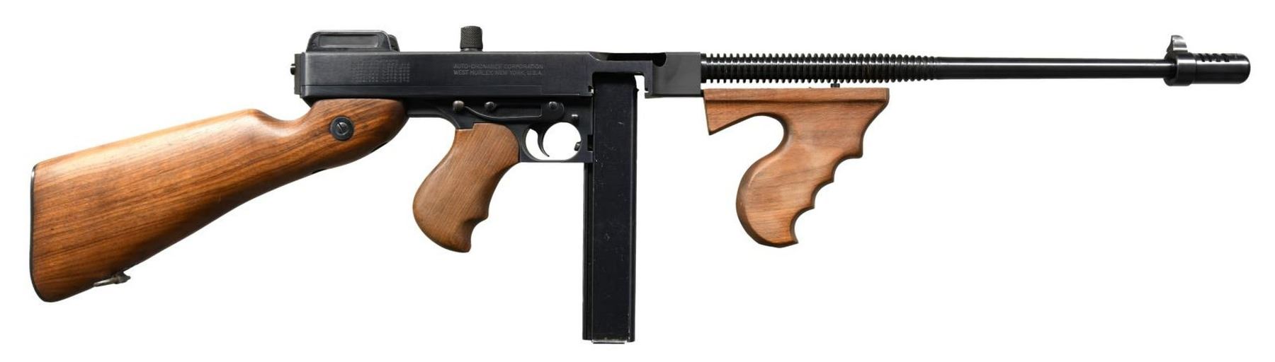 Cal. 45 ACP. S# 25916. Bbl. 16 1/2". There are very few firearms as recognizable as the Thompson sub-machine gun. With its characteristic vertical foregrip, heavily finned bbl. & popular drum magazine, the "Tommy gun" or "Chicago Typewriter" may only have a reputation in real life exceeded by Hollywood portrayals. Here we have the 1927-A1 version which is the semi auto carbine variant of the famous SMG. Blued finish receiver, grip frame & bbl. The 16 1/2" bbl. boasts 35 cooling fins above the wooden vertical grip & a Thompson bullet logo marked, 4-slot, Cutts compensator front sight combination just like the original. A slotted & knurled charging handle sits atop the receiver & provides a clear path from the folding rear sight to the front pin. Matching wooden rear pistol grip w/ the left side safety. Full length wood shoulder stock w/ trap door. Left side receiver markings include "MODEL OF 1927 A1"/ "NO. 25916"/ "THOMPSON SEMI-AUTOMATIC CARBINE"/ "CALIBER. 45 AUTOMATIC CARTRIDGE". Right side receiver markings "AUTO-ORDNANCE CORPORATION"/ "WEST HURLEY, NEW YORK, U.S.A." w/ traditional US Patent block. Magwell accepts Thompson drums & modified SMG stick mags. MAGS:(2 total) 1 Crosby Co. 30rd. & 1-50 rd. "L" drum marked on front data plate "MAGAZINE TYPE 'L'"/ "THOMPSON SUBMACHINE GUN"/ "50 CARTRIGES CAL. 45"/ "FOR 1928 MODEL WIND TO"/ "9 OR 11 CLICKS". Front body marked w/ trademarked Thompson bullet logo & "WIND TO 9 OR 11 CLICKS". On rear data plate "AUTO-ORDNANCE CORP."/ "NEW YORK"/ "REGISTERED IN THE"/ "US PATENT OFFICE". CONDITION: finish on all exposed metal surfaces complete & consistent w/ some very light scratches & high surface thinning, indicative of typical use. Shoulder stock & wooden pistol grips free of any noticeable blemishing aside from a few light impressions. Bright bore w/ strong rifling. Fire control mechanism appears to function correctly when cycled by hand. (23-1446/JZ). MODERN. $1,000-1,500.