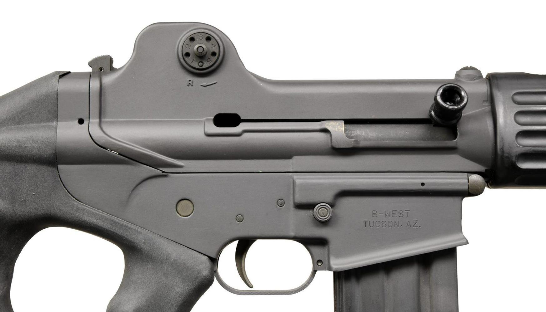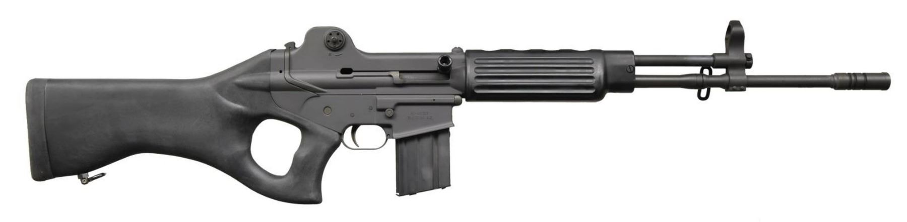Cal. 223. S# 431462. Bbl. 19.5" over brake. Matte black finish on all exposed metal parts. Long stroke gas piston operated self loading rifle. Post ban configuration of the DR-100 rifle. Utilizes traditional AR-15 style magazines. Barrel terminated w/ non ported brake. No bayonet lug. Adjustable gas system integral w/ hooded blade front sight. Black plastic furniture. Rotating sling swivel on front, below barrel & rear mounted swivel below shoulder stock. Left side selector / safety & bolt release. Right side mag release & reciprocating charging handle. Elevation & windage adjustable rear peep sight. Imported through B-West of Tucson, WZ. Thumbhole style shoulder stock w/ factory rubber recoil pad. MAGS: (5 total). 1 steel 20 rd., 2 aluminum 30 rd. & 2 steel 40 rd. UNATTACHED ACCESSORIES: Owners manual. CONDITION: Finish is complete & consistent w/ very little sign of prior use. Only some light brass marking from ejection. Bright bore w/ strong rifling. Fire control mechanism appears to function correctly when cycled by hand. (23-1447/JZ). MODERN. $700-1,100.