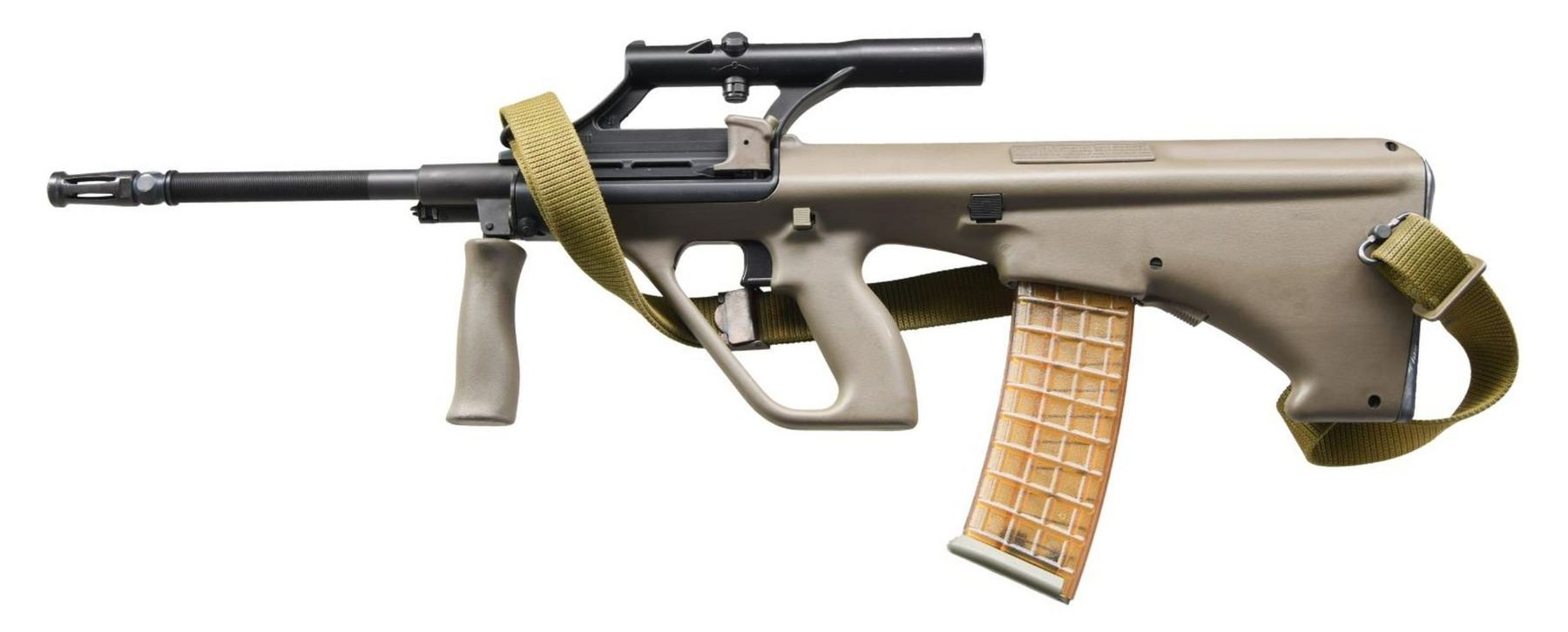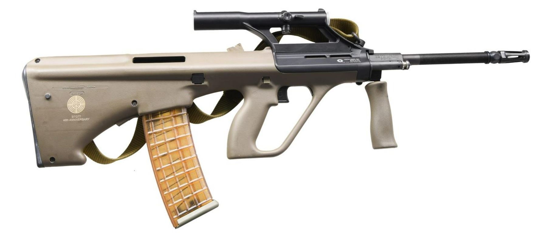 Cal. 223. S# STG77181. Bbl. 20". Limited edition variant to commemorate the 40th Anniversary of the original AUG rifle. Manufactured by Steyr Arms, Inc. at Bessemer , AL in the United States. The receiver currently sports the original 1.5x sight w/ circle reticle & top mounted battle sights. Olive Drab Green chassis. Bolt & barrel is numbered to receiver. Correct green folding vertical foregrip. Left side non reciprocating charging handle. Dark black finish. Barrel has almost 5" of micro fluting rear of tulip style flash hider. Left side mounted tan canvas sling. MAGS: (3 total) 1 - 42 rd. & 1 - 30 rd. original Steyr waffle pattern. 1 42 rd. MSAR. UNATTACHED ACCESSORIES: Original box & paperwork.. CONDITION: All aspects indicate as new. No visible blemishing of any kind or any sign of wear. Glass is clear w/ fine reticle. Bore is bright w/ strong rifling. Fire control mechanism appears to function correctly when cycled by hand. (23-2076/JZ). MODERN. $2,000-3,000.