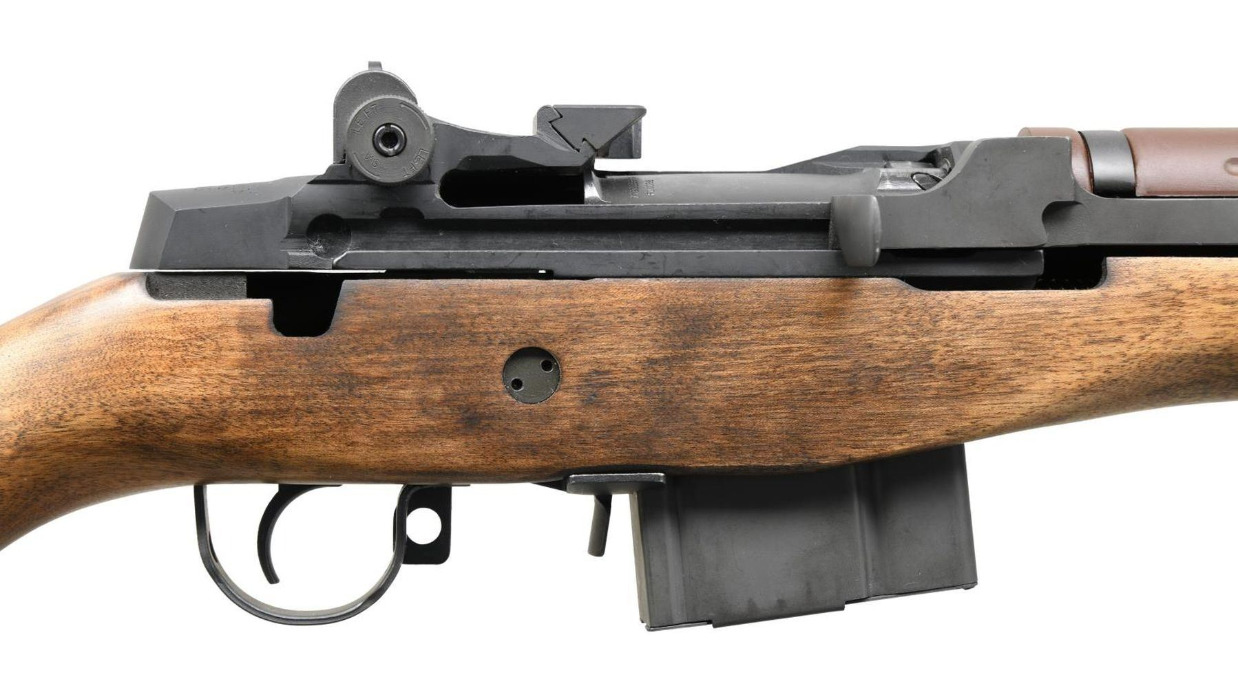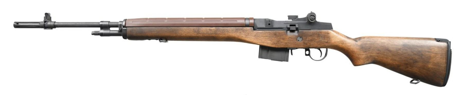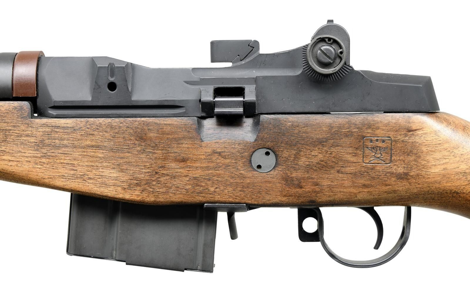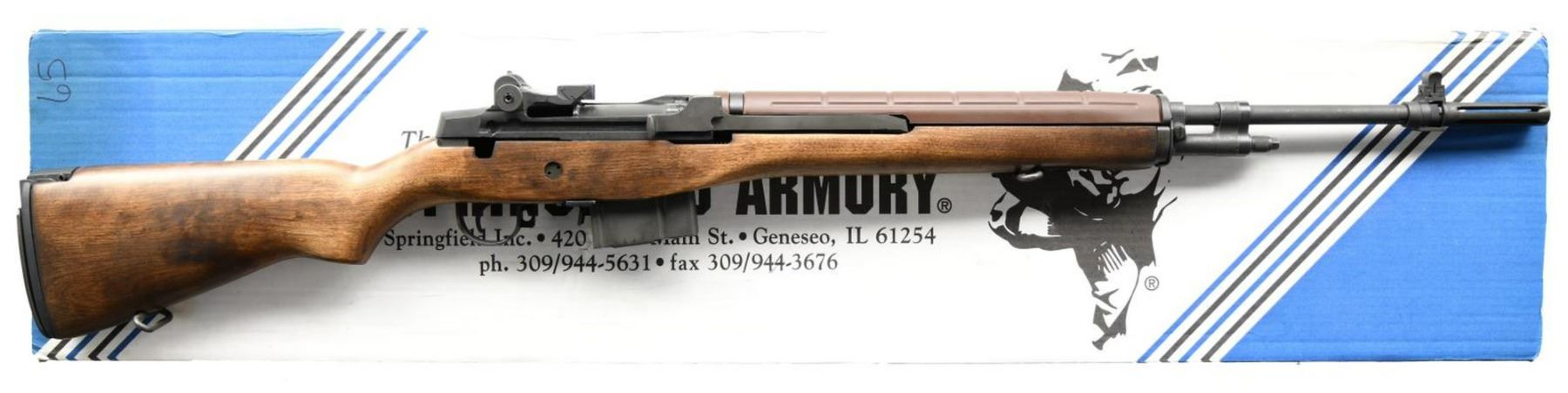 BOX. Cal. 308 Win. S# 159722. Bbl 21 1/2". M1A semi-automatic rifle manufactured by Springfield Armory. Standard markings on receiver, with faux Department of Defense cartouche on left side of the buttstock. Metal components exhibit a parkerized finish. Wood buttstock, with brown polymer handguard. MAGS 1 10 rnd, 1 20 rnd. UNATTACHED ACCESSORIES: matching factory box containing factory paperwork and a green canvas web sling. CONDITION: very good overall, with metal components retaining the vast majority of their original factory parkerized finish, exhibiting some superficial marks from handling and storage. Brilliant mirror bore, exhibiting well defined rifling throughout. Stock shows few superficial marks from storage and handling overall. Box shows some light exterior wear and some mild staining, with a hole at one corner, but otherwise remains sturdy and serviceable. (23-2607/MLW). MODERN. $1,000-1,500.