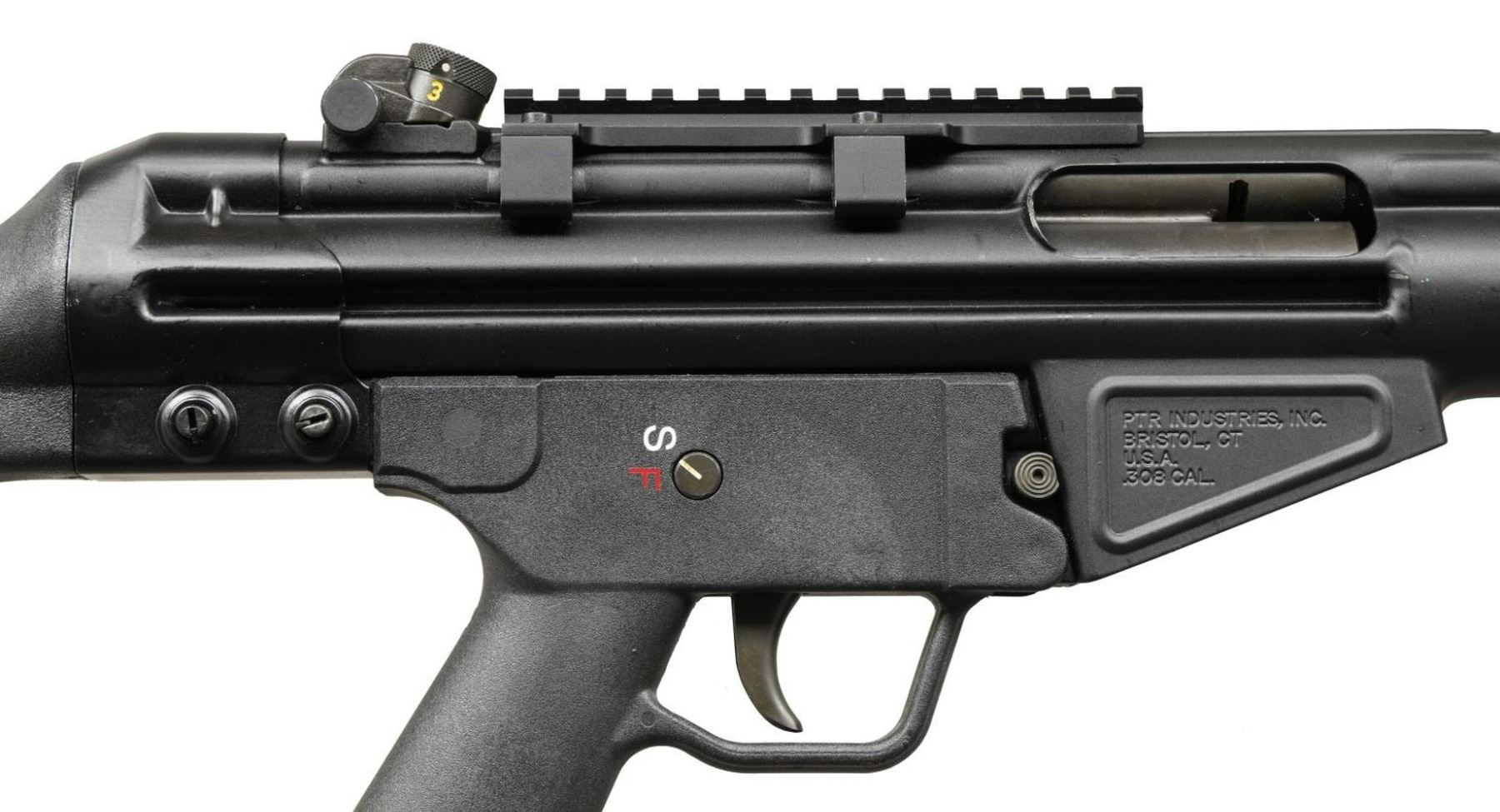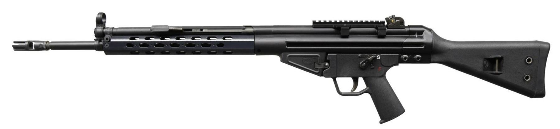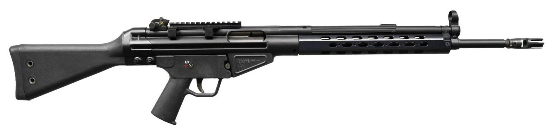 Cal. 308. S# AW15457. Bbl. 18.5". US manufactured rifle built on original HK tooling. Roller locked delayed blowback action. Matte black finish. Hooded post front sight w/ 4 position drum rear sight. Currently sporting 5.5" picatinny rail for optic mounting. 11" aluminum handguard w/ cooling slots. Left side, non-reciprocating charging handle. Plastic S-F trigger group. Black plastic A2 shoulder stock. Push button mag release. MAGS: 4 aluminum 20 rd. CONDITION: Finish coverage complete & consistent. Bright bore w/ strong rifling. Fire control mechanism appears to function correctly when cycled by hand. (23-2690/JZ). MODERN. $800-1,200.
