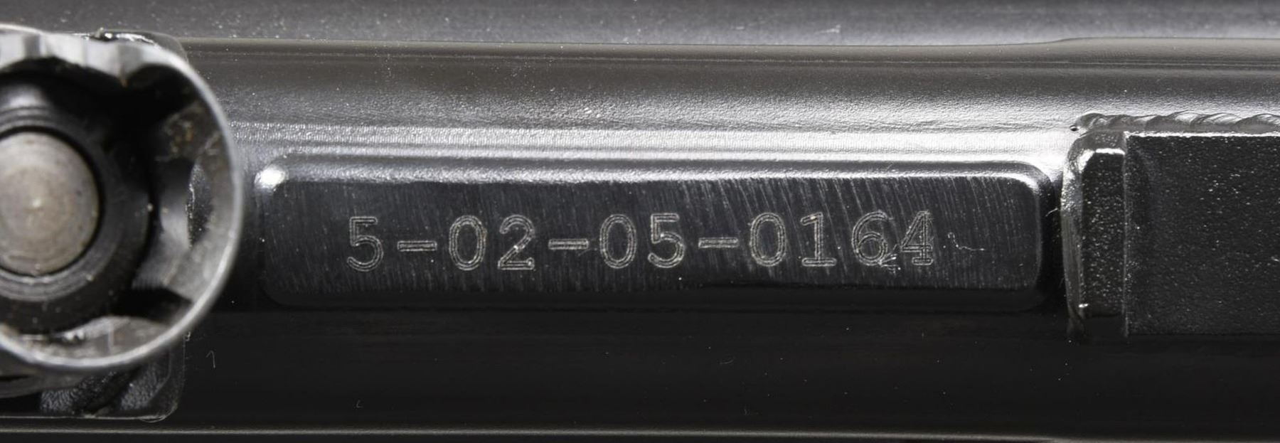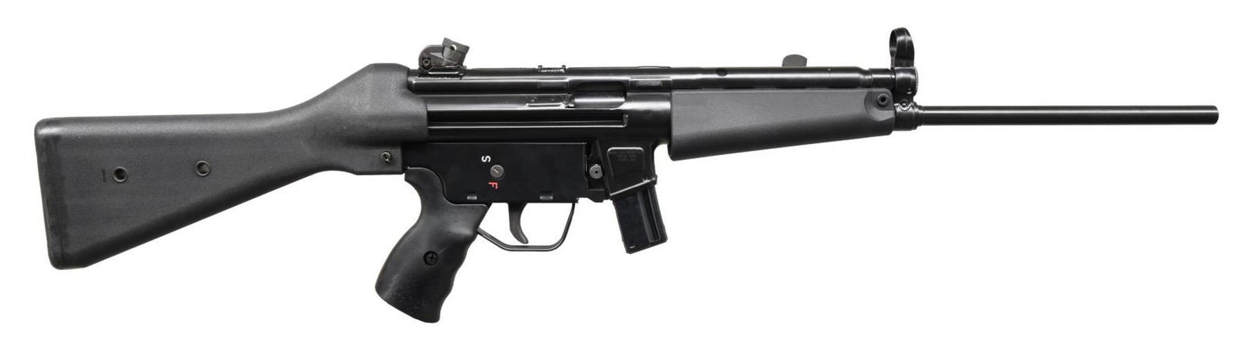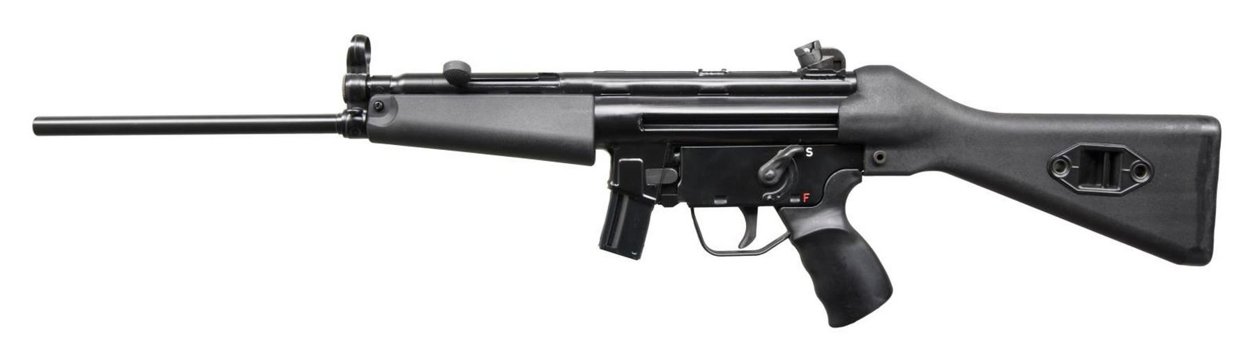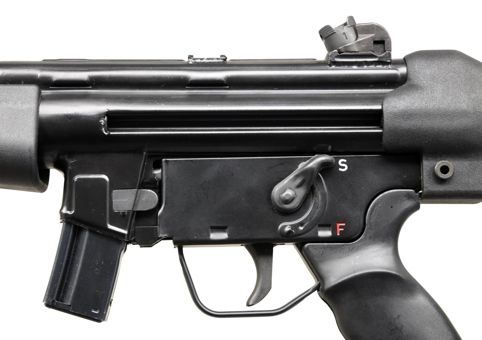 Cal. 9mm. S# 5-02-05-0164. Bbl.16.75". American clone of the popular semiautomatic MP5 variant, the HK94, manufactured in Pine, AZ. Stamped receiver. Roller locked, delayed blowback operation. Matte black finish. Hooded post front & 4 position drum rear sights. Metal "S-F" trigger pack. A2 full shoulder stock. Push button mag release. Sling loop on front left. Accepts unmodified MP5 / HK94 magazines. MAGS: 1 steel 10 rd. CONDITION: Black painted finish complete & consistent w/ little overall sign of prior use. Bright bore w/ strong rifling. PROVENANCE: The Collection of Gun Sport Ltd. owned by Jon R. Thomas. (23-3479/JZ). MODERN. $1,500-2,000.