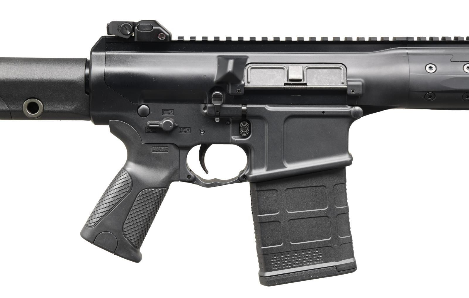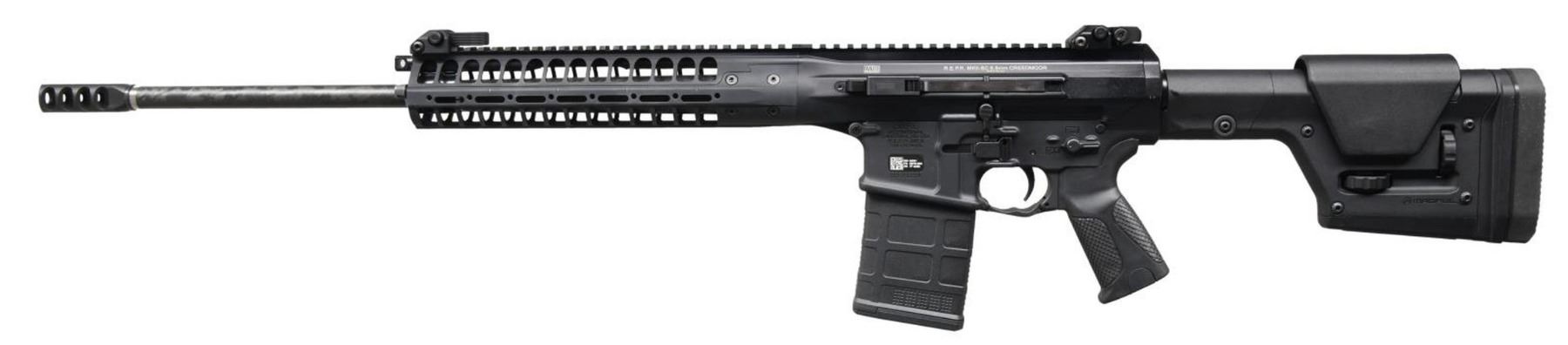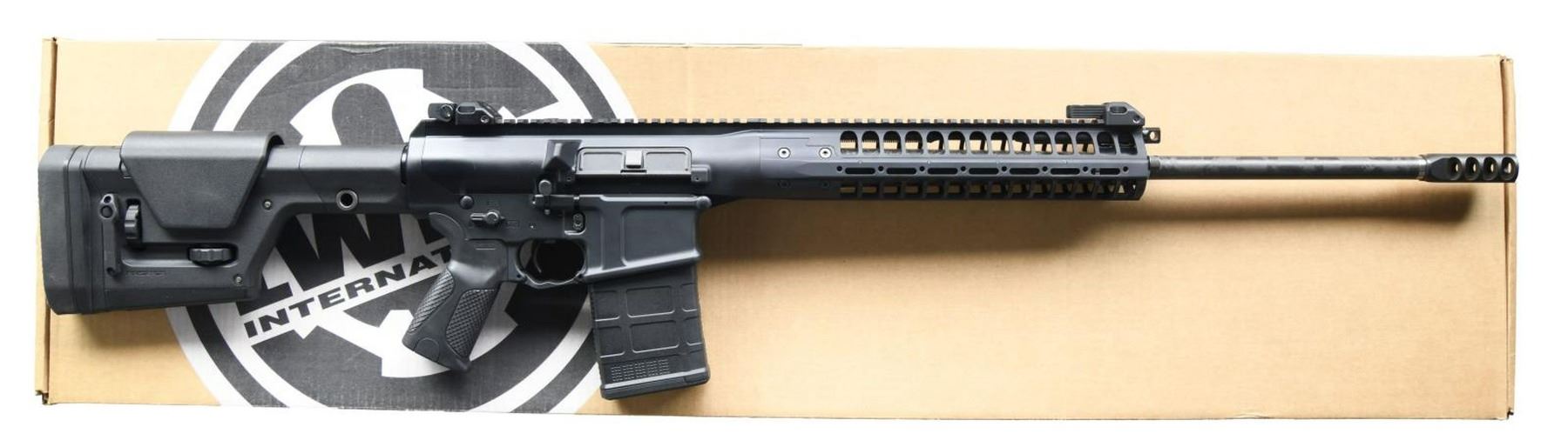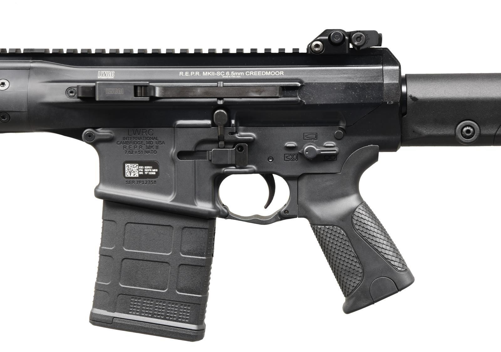 Cal. 6.5 Creedmoor. S# 7P12358. Bbl. 22". Magazine fed, self loading, closed bolt rifle, inspired by the LWRC build for the US Military CSASS Solicitation Program. Short-stroke gas piston operating system. Monoforge upper receiver w/ integrated rail base, providing 21" of optic mounting real estate. Black nitride treated LWRC heavy profile barrel w/ 1:8 twist. Threaded muzzle w/ factory muzzle brake. LWRC Skirmish Flip up protected post front sight forward of folding, dual aperture protected peep sight. Ambidextrous controls. Left side, non reciprocating charging handle. Brass deflector. Magpul PRS adjustable shoulder stock. Magpul MOE+ pistol grip. MAGS: 1 Pmag 20 rd. UNATTACHED ACCESSORIES: Factory box, REPR Rail accessories & paperwork. CONDITION: As new in box. Never sold retail. Still retains factory chamber flag. No noticeable blemishing of any kind. Bright bore w/ strong rifling. PROVENANCE: The Collection of Gun Sport Ltd. owned by Jon R. Thomas. (23-3458/JZ). MODERN. $3,500-4,500.