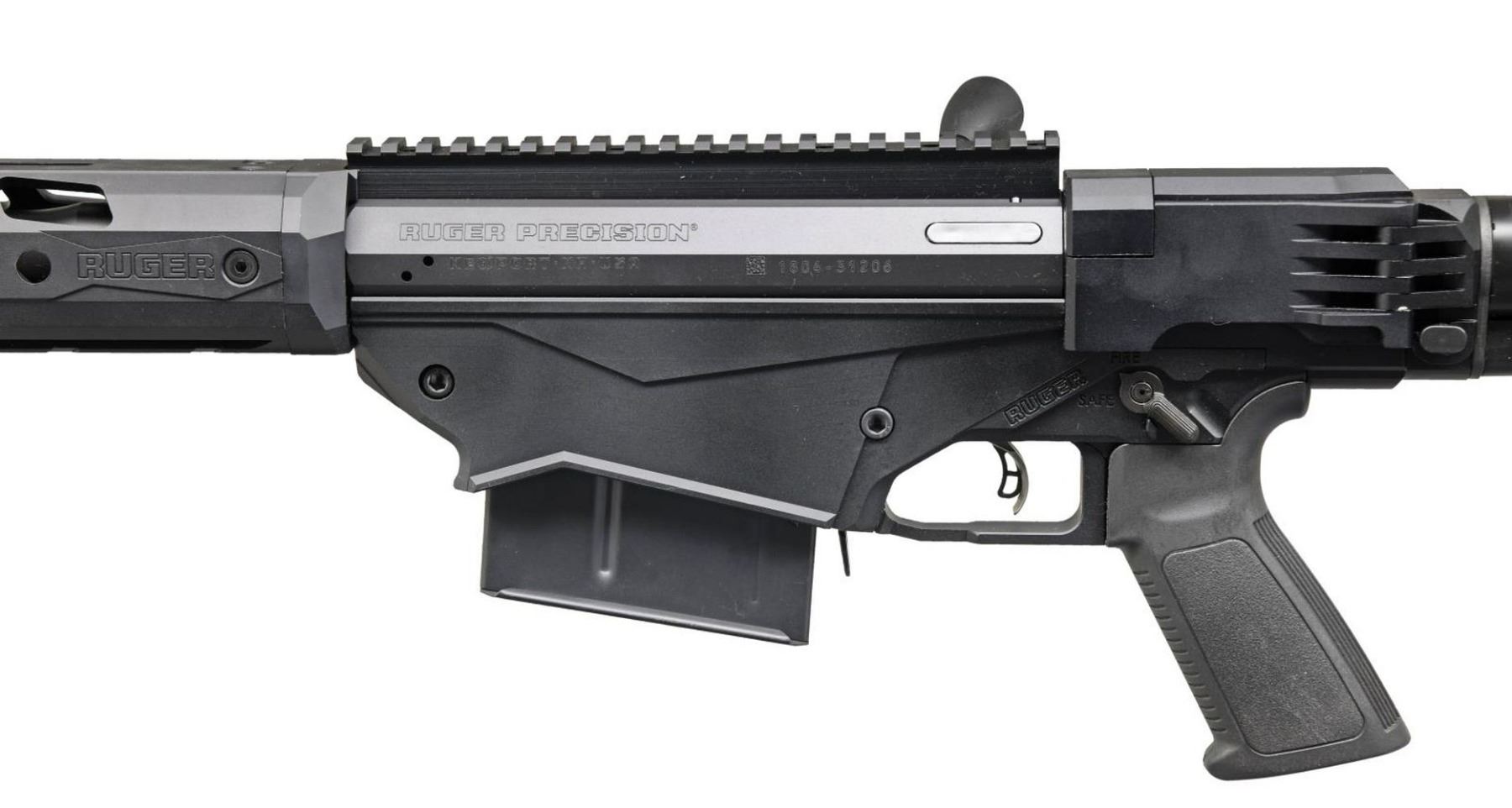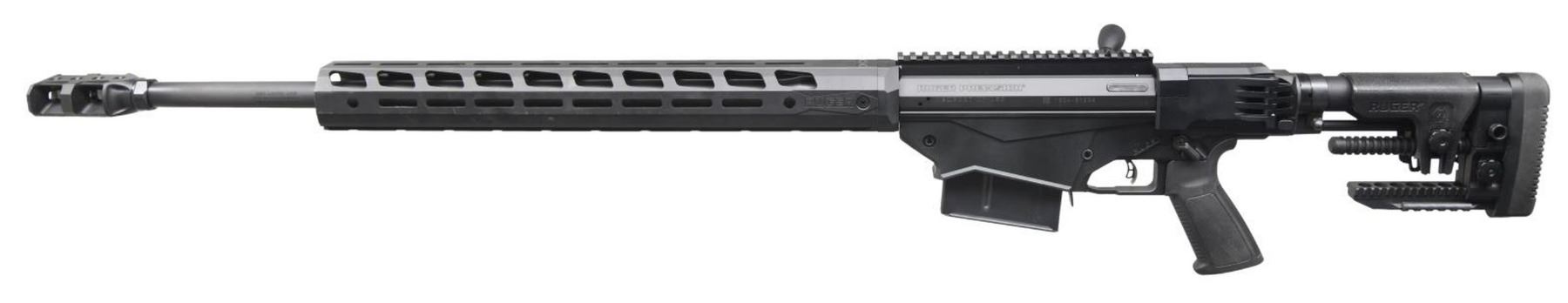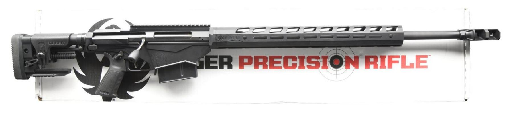 RIFLE. Cal. 338 Lapua Mag. S# 1804-31206. Bbl. 26". Matte black finish. Magazine fed, precision bolt action rifle. Cold hammer-forged, chrome-moly steel barrel with 5R Rifling. 18" aluminum free-float handguard is black hard-coat anodized aluminum and features M-LOK slots on all four sides. 8" picatinny rail for optic mounting. Enlarged bolt handle. Ambidextrous safety. Left side folding, adjustable shoulder stock w/ adjustable cheek piece & length of pull. Ruger Marksman adjustable trigger. MAGS: 2 steel 5 rd. UNATTACHED ACCESSORIES: Factory box & paperwork. CONDITION: As new in box. Never sold retail. Bright bore w/ strong rifling. PROVENANCE: The Collection of Gun Sport Ltd. owned by Jon R. Thomas. (23-3222/JZ). MODERN. $1,000-2,000.