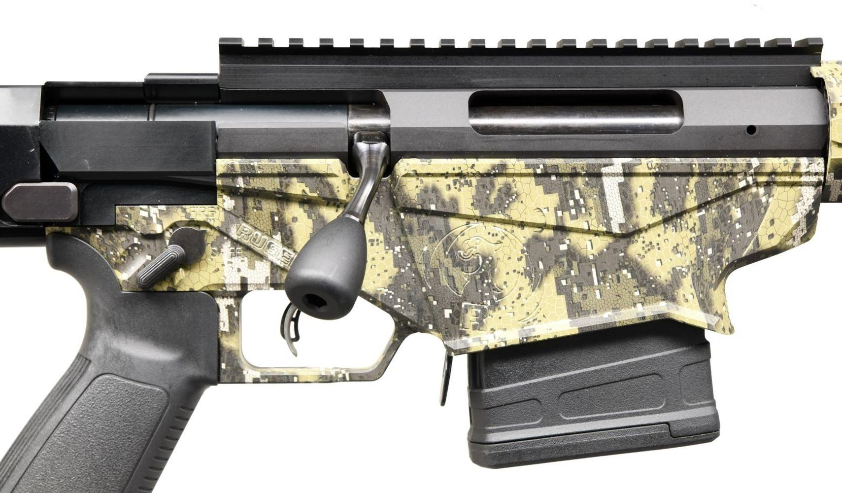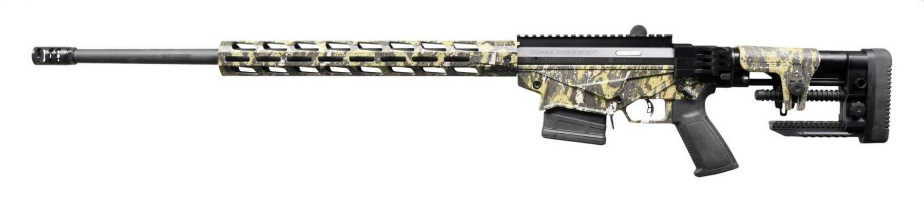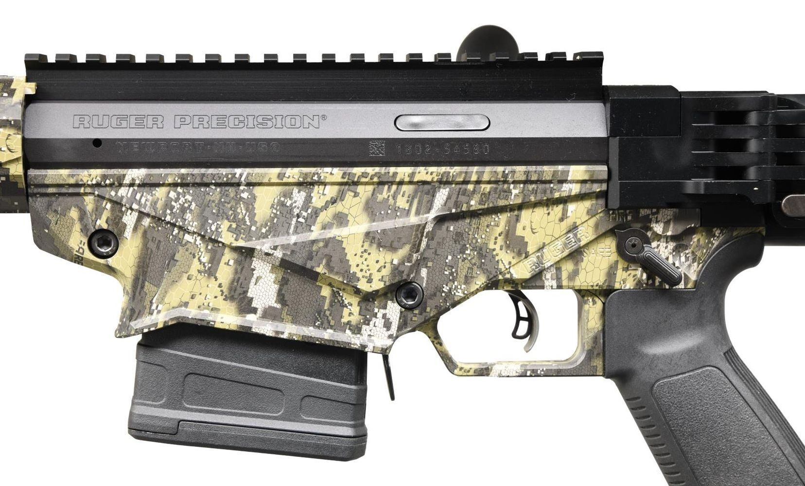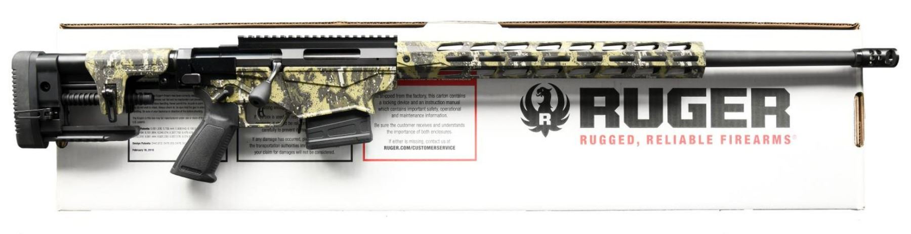 EXCLUSIVE RUGER PRECISION RIFLE. Cal. 6.5 Creedmoor. S# 1802-54580. Bbl. 24". Desolve Bare Reduced Camo finish. Magazine fed, precision bolt action rifle. Cold hammer-forged, chrome-moly steel barrel with 5R Rifling. 15" aluminum free-float handguard features M-LOK slots on all four sides. 8" picatinny rail for optic mounting. Enlarged bolt handle. Ambidextrous safety. Left side folding, adjustable shoulder stock w/ adjustable cheek piece & length of pull. Ruger Marksman adjustable trigger. MAGS: 2 new 10 rd. Pmags. UNATTACHED ACCESSORIES: Factory box & paperwork. CONDITION: As new in box. Never sold retail. Bright bore w/ strong rifling. PROVENANCE: The Collection of Gun Sport Ltd. owned by Jon R. Thomas. (23-3451/JZ). MODERN. $1,200-1,800.