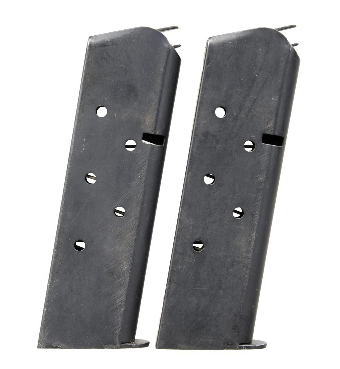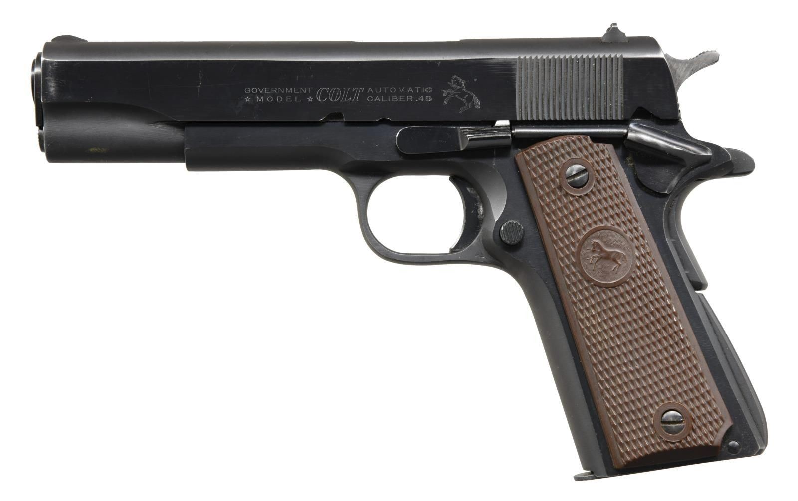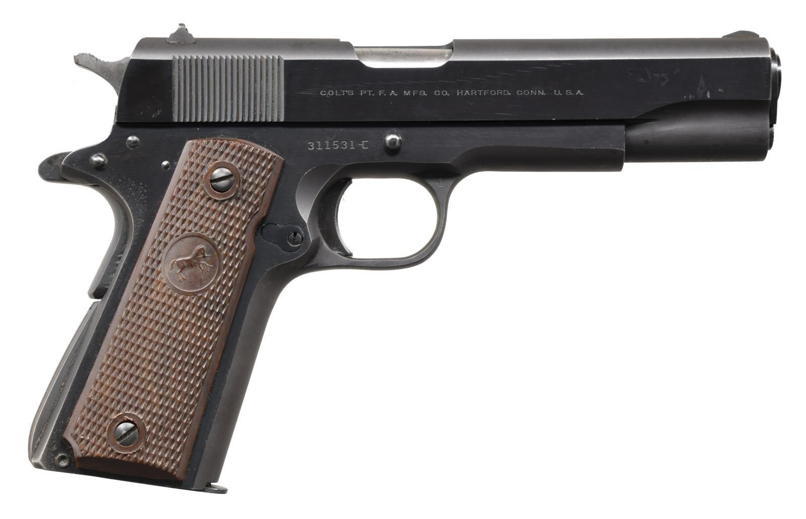 PISTOL. Cal. 45 ACP. S# 311531-C. Bbl 5". Model 1911A1 Government Model manufactured by Colt in 1967. Left side of slide exhibits standard roll stamp markings, with the right side exhibiting Colt's single line address. Metal components are blued, with the frame being mounted with 2 piece Colt checkered brown plastic grips. MAGS: 3 7 rnd. CONDITION: metal components retain the vast majority of their original factory blue finish, exhibiting some scattered superficial marks form handling and storage, with a few spots of mild wear, and some scattered spots of mild surface oxidation. Barrel exhibits pinprick discoloration over the chamber. Brilliant mirror bore, exhibiting well defined rifling throughout. Grips show some smoothing and a few marks from handling and storage, but are otherwise sturdy and serviceable. (23-2398/MLW). CURIO. $1,200-1,800.