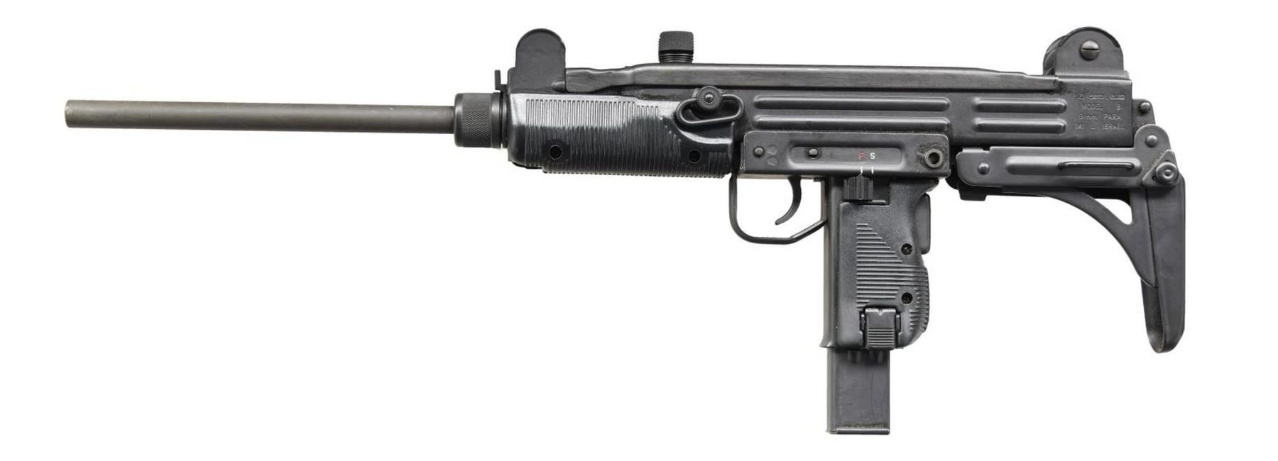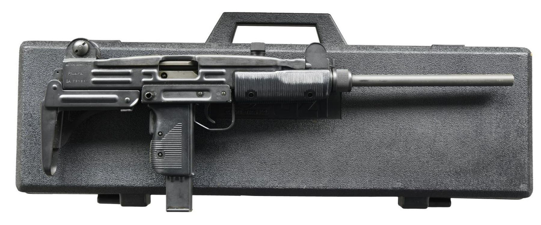 Cal. 9mm. S# SA73121. Bbl. 16". A closed bolt semi automatic version of the world-famous SMG. Fitted w/ factory collapsible stock & including a 3.5" bbl. blank, almost resembling the SMG to a "T". Front sight elevation adj. protected post. Windage adj. dual aperture rear sight, marked "1" & "2". Classic black painted finish on exposed metal parts. F-S trigger group. Rotating sling swivel on left side of receiver. Black plastic furniture. MAGS: 1-25 rd. IMI. UNATTACHED ACCESSORIES: 3.5" factory bbl. display blank, factory black plastic fitted transport case,tan canvas sling & paperwork. CONDITION: All aspects appear this firearm is as new. No noticeable blemishes on finish of any exposed area. Consigner had a tag on it claiming it was "unfired" which doesn't seem unrealistic given the condition. Bore is shiny w/ strong rifling. Fire control mechanism appears to function correctly when cycled by hand. (23-2426/JZ). MODERN. $1,000-1,500.