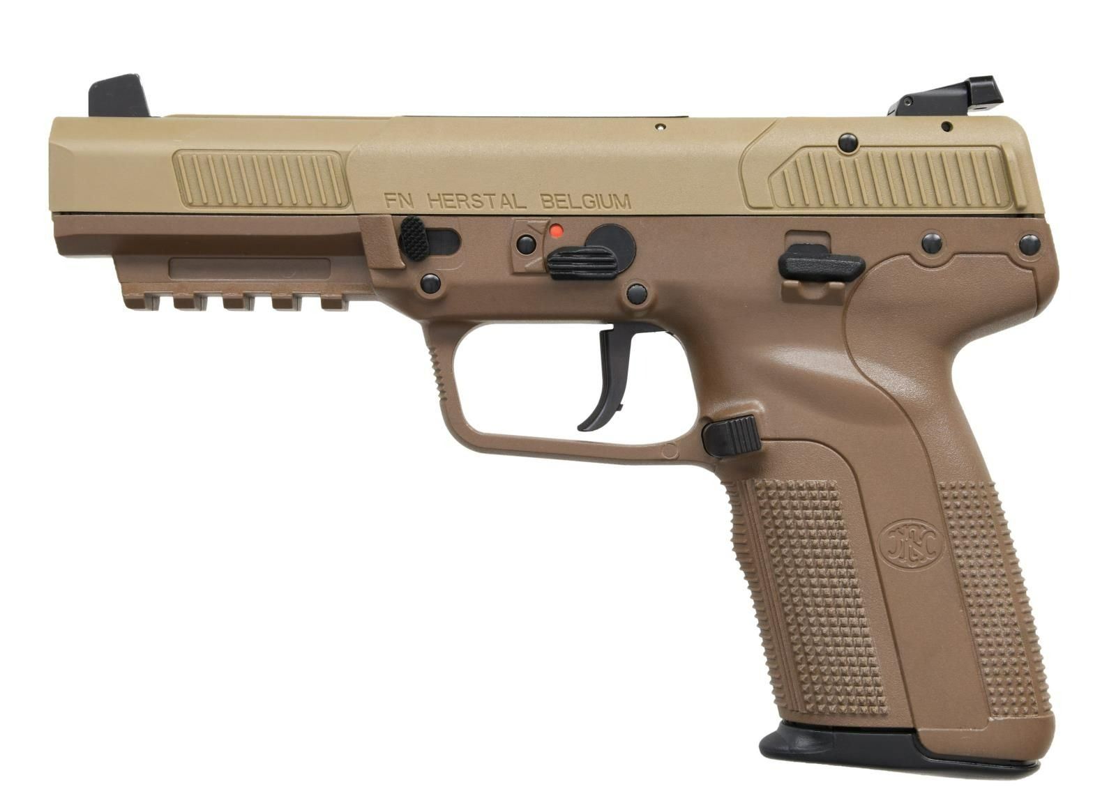 Cal. 5.7x28mm. S# 386422111. Bbl. 4 3/4". Three dot sights w/ adjustable rear. FDE finish. Checkered frame w/ picatinny rail. Factory sticker present on top of slide. MAGS: 2-20 rd. UNATTACHED ACCESSORIES: matching numbered factory hardcase w/ manual & cable lock. CONDITION: all aspects near excellent. PROVENANCE: The Collection of Gun Sport Ltd. owned by Jon R. Thomas. (23-4277/MJC). MODERN. $1,250-1,750.