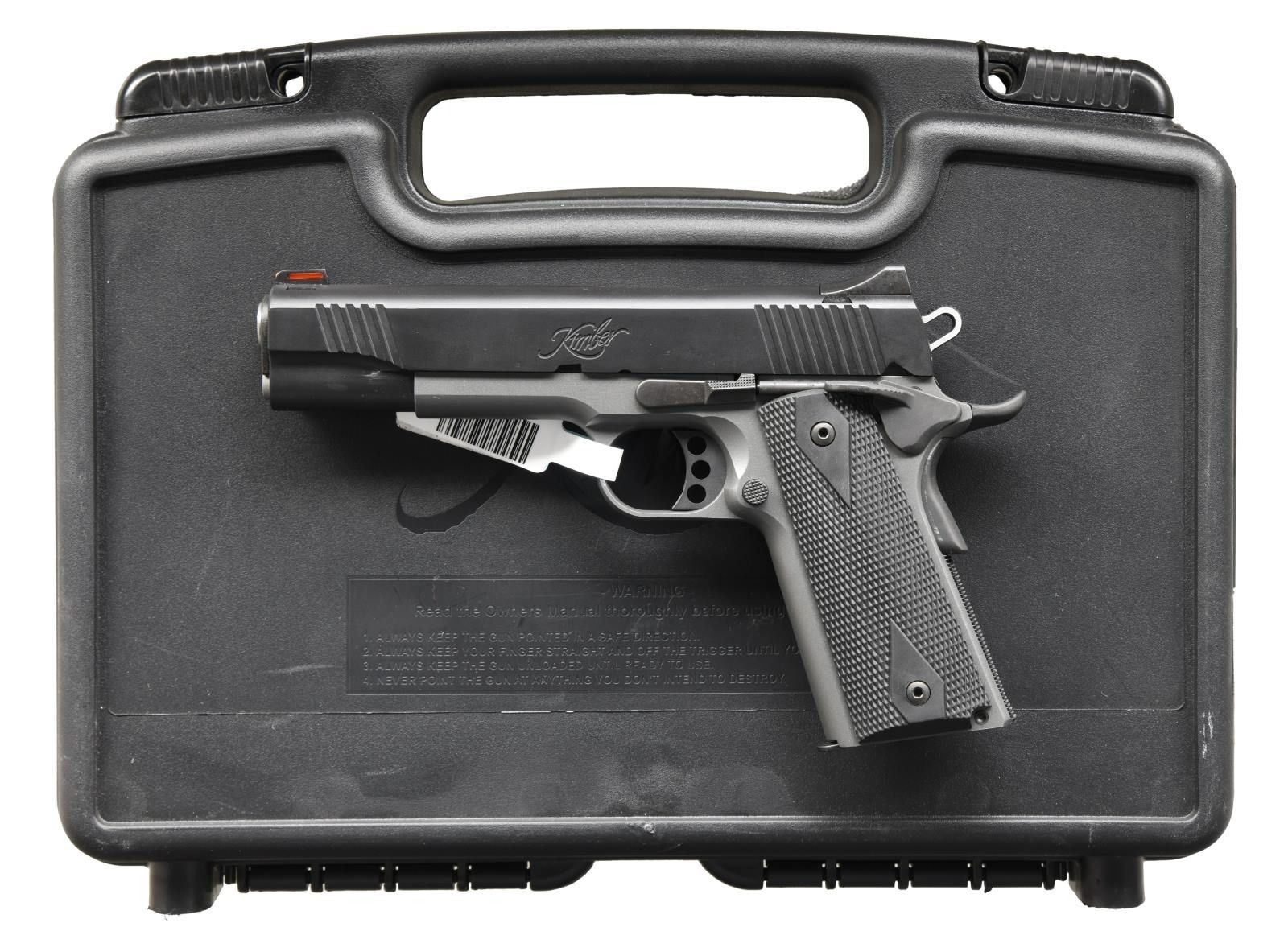 Cal. 45 ACP. S# K845543. Bbl. 5”. Three dot sights. Extended safety. Extended beavertail grip safety. Front & rear slide serrations. Matte black slide. Gray finished frame. Factory hang tag present on trigger guard. Checkered black hard rubber grips. MAGS: 1-7 rd. factory. UNATTACHED ACCESSORIES: factory hardcase matching numbered to gun w/ foam inserts, manual, paperwork, bushing wrench, cable lock, sample of FP-10 CLP lubricant, chamber flag & Kimber sticker. CONDITION: all aspects near new in box. PROVENANCE: The Collection of Gun Sport Ltd. owned by Jon R. Thomas. (23-2782/MJC). MODERN. $600-900.