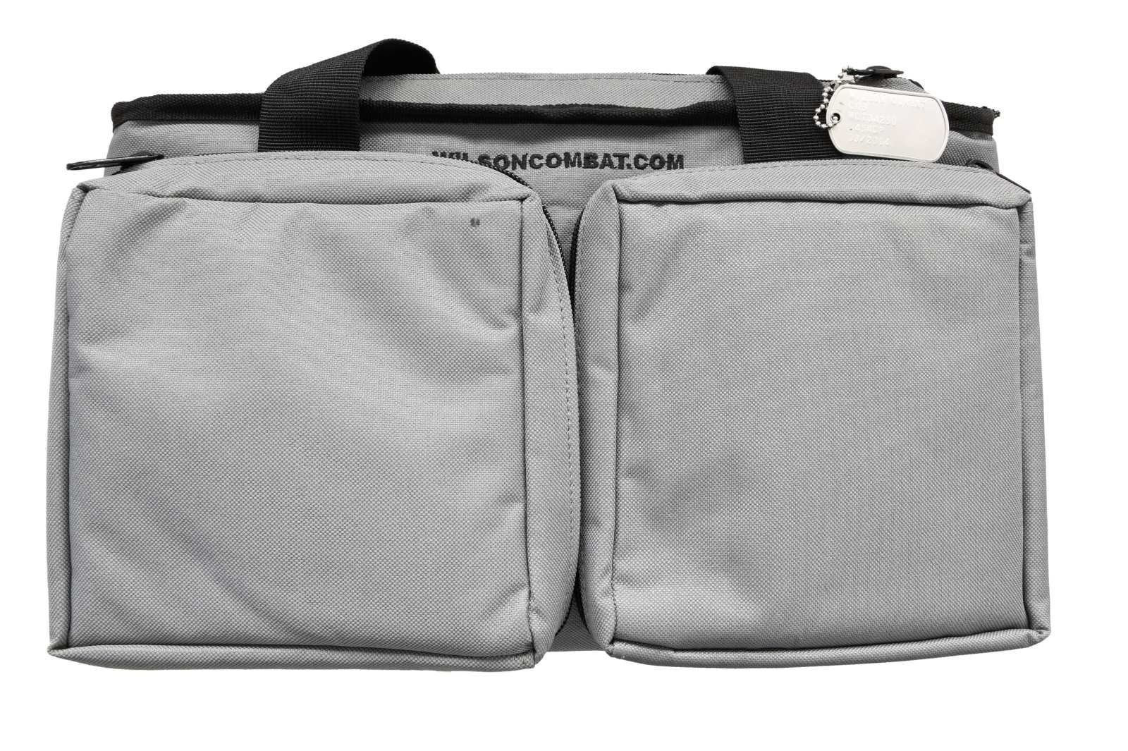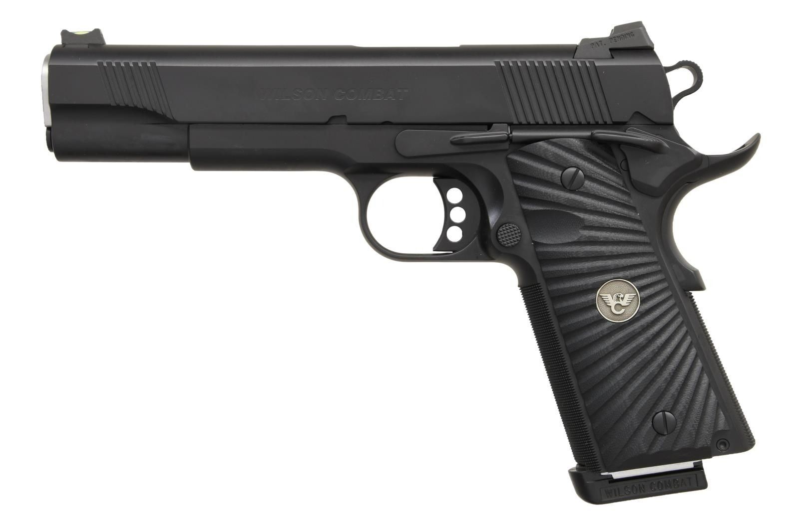 Cal. 45 ACP. S# WCT34250. Bbl. 5" stainless. High end custom 1911 style pistol. 0Red fiber optic front sight. Ramped Wilson Combat rear sight. Extended safety. Extended beaver tail grip safety. Stippled front strap. Matte black finish. Front & rear slide serrations. G10 starburst grips w/ silver Wilson medallions. MAGS: 2-8 rd. factory. UNATTACHED ACCESSORIES: factory softcase w/ matching numbered dog tag, cable lock, manual, paperwork, test target & bushing tool. CONDITION: all aspects near excellent. PROVENANCE: The Collection of Gun Sport Ltd. owned by Jon R. Thomas. (23-3073/MJC). $2,000-3,000.