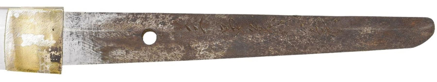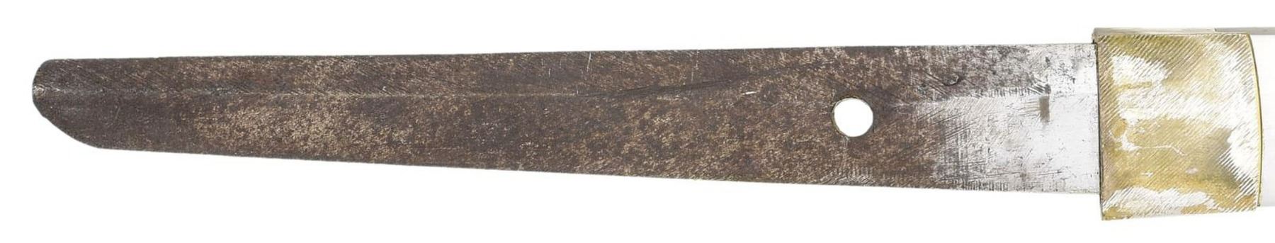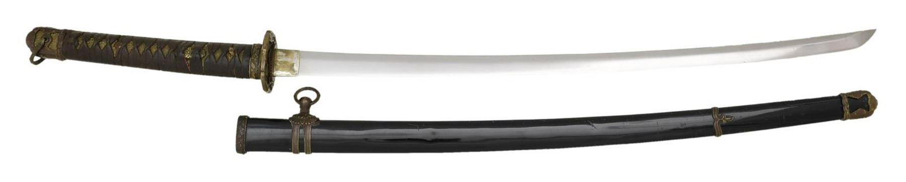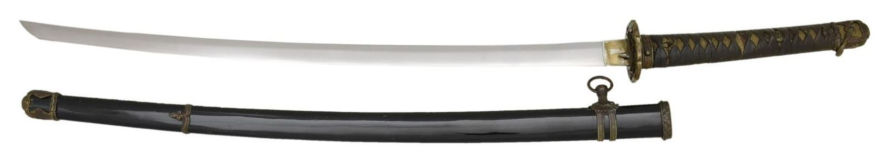 Overall length: 39 1/2”. Blade length: 27”. Blade has an irregular hamon. The habaki has a reeded finish and is silver plated brass. There are 4 seppa above & below the tsuba. The tsuba is standard gilded brass with 4 cherry blossoms at the corners on the top & underside. The nakago has a 6-character signature on one side and a single mekugi-ana. The tsuka has a brown tsuka-ito over white same. Matching kabuto-gane & fuchi. The menuki are standard 3-cherry blossom design on both sides. Black enameled metal saya with typical gunto. CONDITION: blade has a good polish with no major flaws. The tsuka shows moderate wear but is complete. The saya generally shows light wear. (02-19765/BF). $800-1,300.