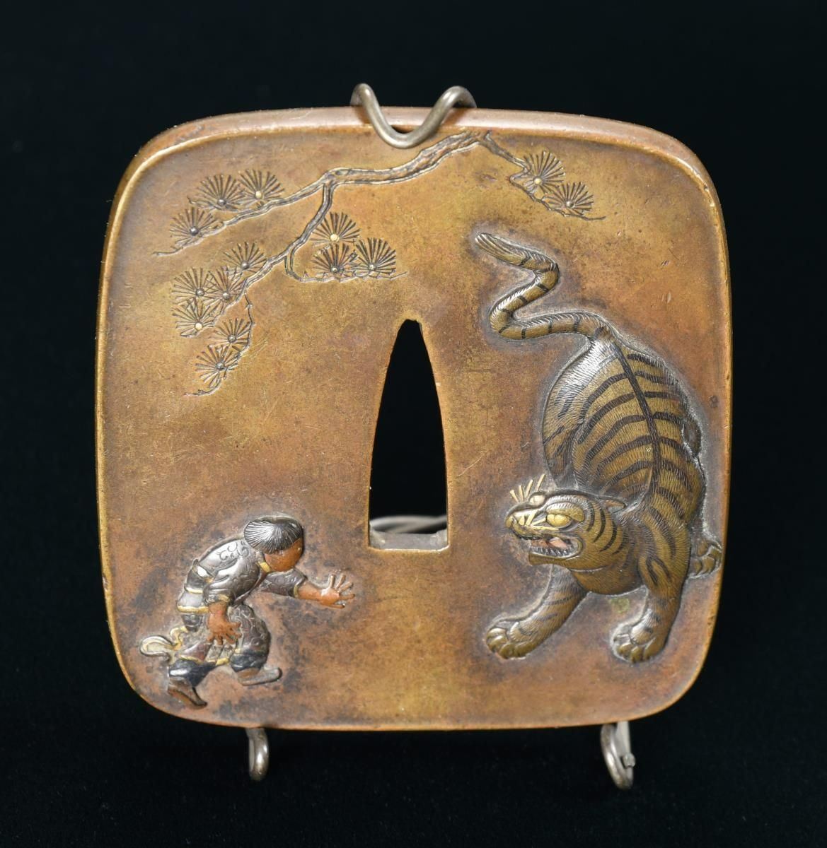 This brass/bronze rectangular tsuba has shows an applied tiger with black stripes and gold inlaid eyes & whiskers. It also appears to have a red enameled mouth interior. The same side also shows a gold inlaid person with hand out stretched opposite the tiger. Over the tiger & person is a gold inlaid pine branch. The reverse side of the tsuba shows an exceptionally well-articulated trunk of a pine tree, along with a gold inlaid spindly branch. The forest floor has a few rocks & gold highlighted flowers. CONDITION: tsuba has a wonderful rich mellow patina with no damage. PROVENANCE: From the Lifelong Collection of Glen E. Mattox. (02-18442-1/BF). $600-800.