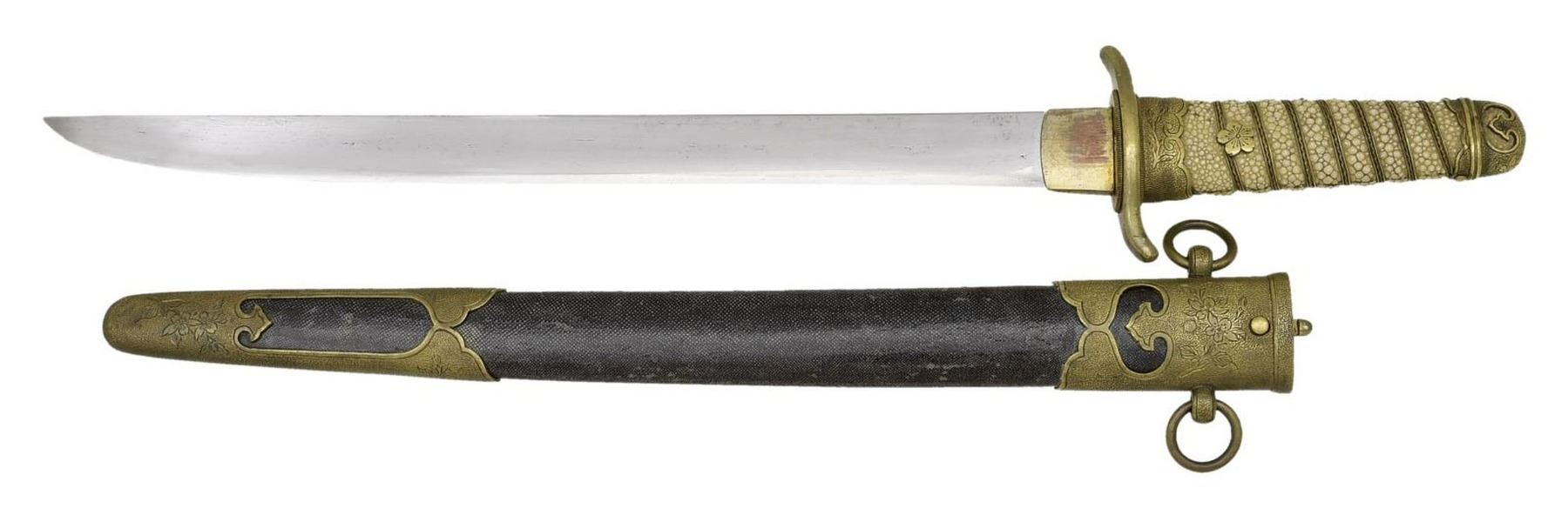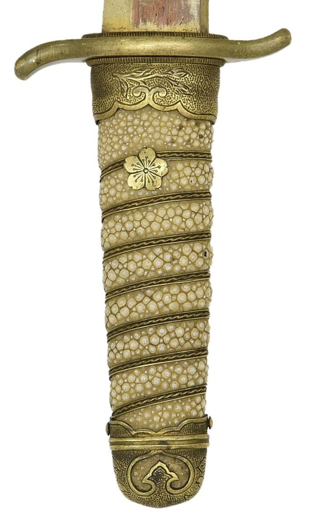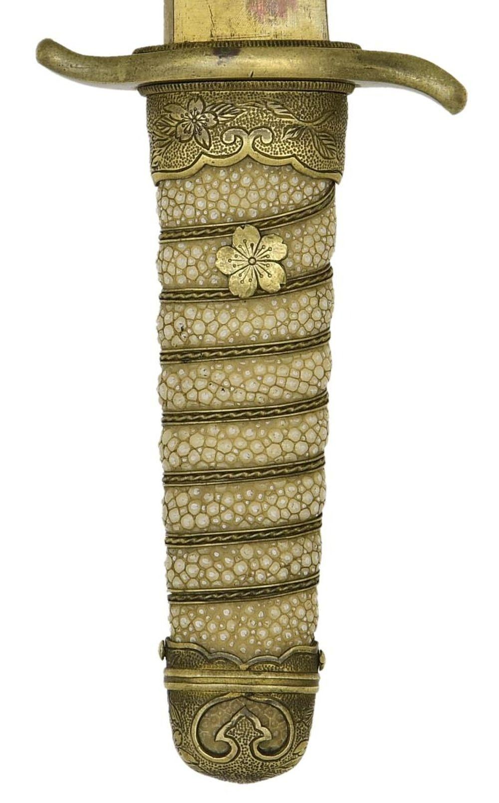 Overall length: 16 3/4". Blade length: 11 1/4”. Blade has a slightly irregular hamon. There is a short hi on one side. The consignor states that the blade is signed “Yoshi Nori” circa 1550. Gilded copper habaki with a gilded, slightly S-shaped tsuba. White same grip with gilded wire wrap. 5-Petal cherry blossom on each side of the grip. Gilded kashira with engraved cherry blossoms on either side. Saya is gilded brass mounted sharkskin. Mounts have an engraved cherry blossom design. CONDITION: blade has a finely done polish. Dagger shows light overall wear. Saya also shows light wear with some scuffs to the body. PROVENANCE: From the Lifelong Collection of Glen E. Mattox. (02-18425/BF). $1,250-1,750.