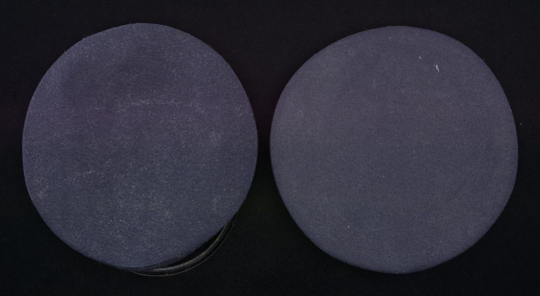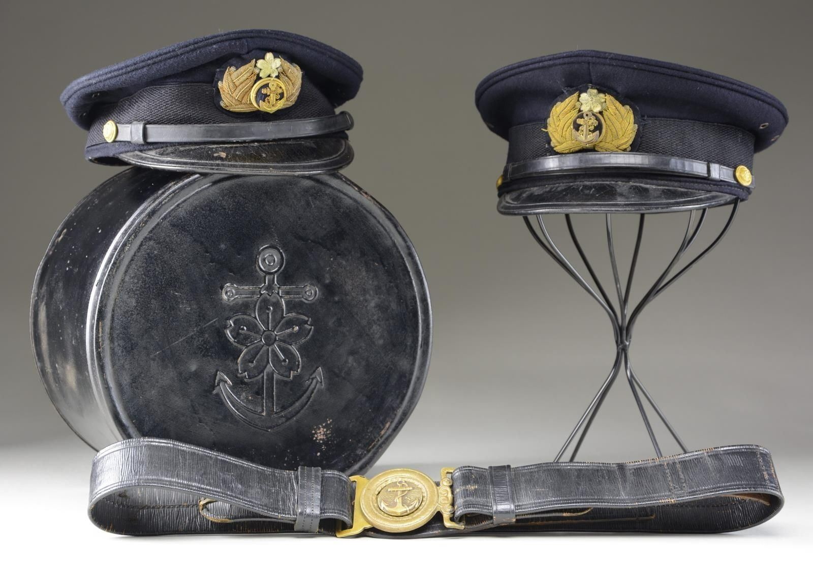 OFFICERS’ VISOR CAPS IN A TIN CONTAINER. This interesting lot consists of 1 Naval officer’s visor cap with a black crown & black mohair band. The front of the cap has a gold bullion Naval insignia with a silver cherry blossom above. Black leather visor & chinstrap terminated by Naval buttons. Black sweatband with purple silk liner & sewn-in nametag. / 1 Naval officer’s visor cap with a black crown & black mohair band. The front of the cap has a gold bullion Naval insignia with a silver cherry blossom above. Black leather visor & chinstrap terminated by Naval buttons. Black sweatband with brown polished cotton liner & sewn-in nametag. / 1 Naval NCO belt with a 2-piece fouled anchor buckle. / 1 Tin hat box with impressed Japanese Naval insignia on the lid. CONDITION: hats generally show light wear with slightly more wear to the interior. Belt & buckle show light wear. Tin box shows light to moderate wear with minor dents. PROVENANCE: From the Lifelong Collection of Glen E. Mattox. (02-18438/BF). $800-1,200.
