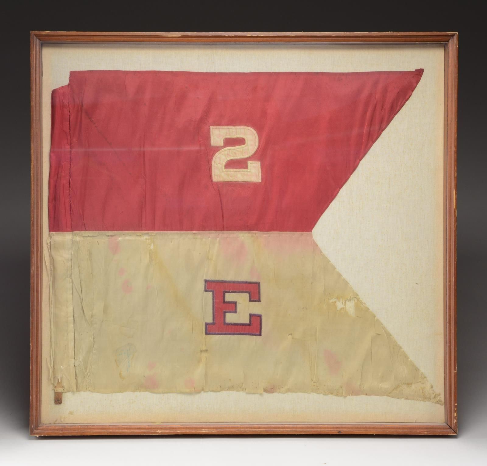 OF THE 2nd CAVALRY. A fine & seldom encountered, full-sized cavalry guidon measuring approx. 31 1/2" at the points, and 22” at the center. The height of the guidon is approx. 27”. The top half is red with a large central sewn “2”. The lower half of the guidon is white with a large sewn “E”. The 2nd US Cavalry was exceptionally active in the West during the Indian Wars era. They served in nearly all corners of the Western theater. Most notably, on 17 March 1876, Company E was part of a regiment under Colonel Joseph Reynolds engaged the Cheyenne & Lakota during the ill-fated Big Horn Expedition. Company E participated in the Battle of Powder River, as well as the Battle of Rosebud on 17 June 1876. A few days after Rosebud, Custer’s 7th Cavalry was annihilated at the Battle of Little Bighorn. The guidon is housed in a 3” deep frame measuring 33 3/4" x 35 3/4". CONDITION: the guidon shows scattered losses & separations, but remains substantially solid. Colors are vivid, and the display factor is extraordinary. (02-20185/BF). $2,000-3,000.