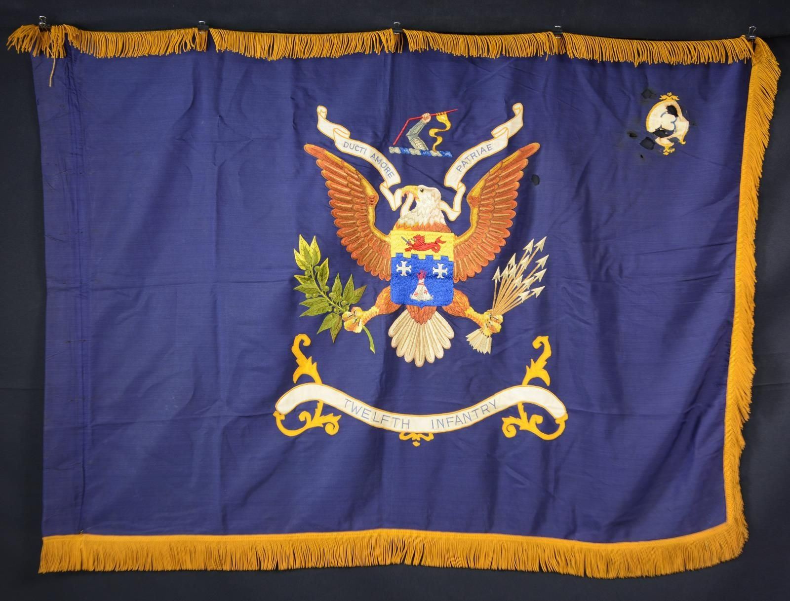 FLAG. 3’ x 4’ regulation November 22, 1965 dated inspection label, double applique hand and machine embroidered eagle and crest on a blue field, gold fringe. Motto: “DUCTI AMORE PATRIAE” which translates: “Led by Love of Country.” The 12th Infantry is known as the “Warrior Regiment”. The 3rd Battalion are known as the “Braves” The 12th US infantry has long military history starting during the Civil War with the firing on Fort Sumter in 1861, Indian wars, Spanish American war, WW1, WW2. The 12th regiment was the only regiment to send five battalions to Vietnam. The 3rd battalion was deployed September 1966 to Vietnam and stayed four years till December 1970. The 3rd battalion had 268 KIA and died from wounds, earned 2 Presidential Unit Citations for “Peiku” & “Dak To”. Seven soldiers of the regiment were awarded the Congressional Medal of Honor. The flag is Army blue and features the regimental crest within the Eagle. Part of the shield is blue, the color of the infantry branch. The two crosses represent the loss of 50 per cent of the unit at Battle of Gaines’ Mill in 1862, while the Teepee represents their actions in post-Civil War Indian campaigns. The battlements stand for the capture of a Spanish blockhouse at El Caney in Cuba and the Sea Lion is from the Coats of Arms of the Philippines. Above the Eagle is a mailed arm holding a Spanish flag which represents the capture of Spanish colors at El Caney. CONDITION: very good overall other than five or six large bullet sized holes in the upper quadrant of the fly around the 3rd Battalion Insignia. (02-19982-30/JS). $300-500.