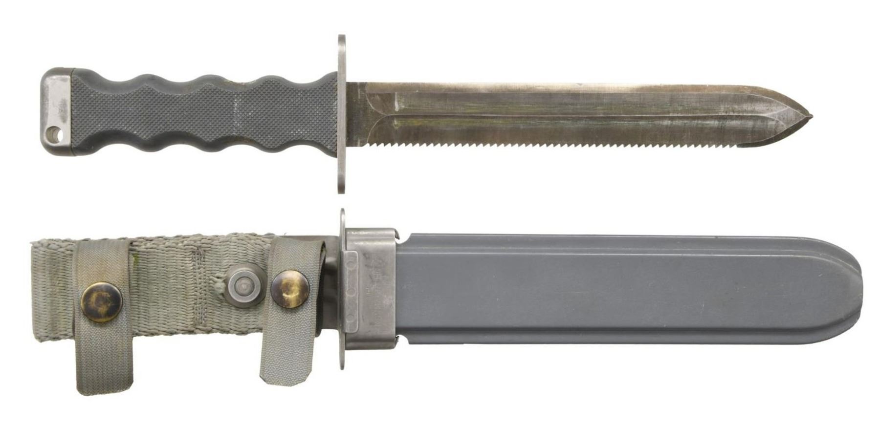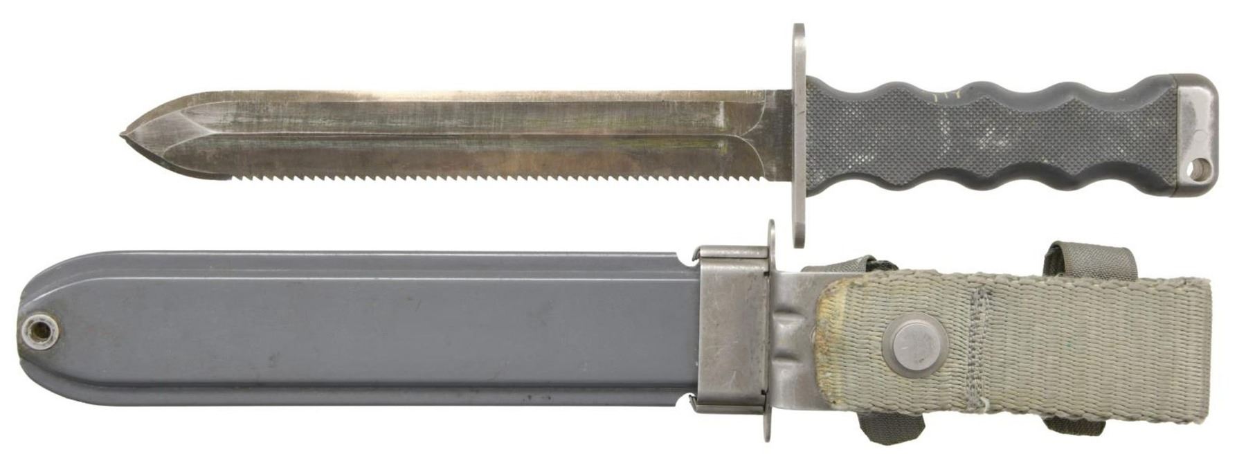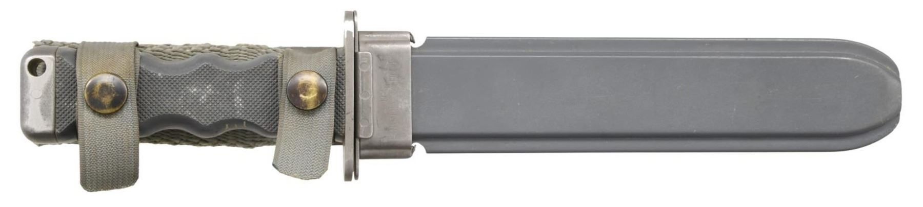 UNDERWATER KNIFE MADE FOR U.S. NAVY. These unique knives were contracted for the United States Navy for use by the elite UDT & SEAL Teams in 1962. There were a total of only 1,156 manufactured by Imperial Knife Company. All the metal parts are nonmagnetic, manufactured in a stain resistant non-ferrous alloy. The partially serrated blade was made from a Special Haynes Alloy #25, and parkerized in a gray finish. The sheath & handle were constructed of a gray, glass fiber material. The blade is 7.5" in length and the OAL is 12". The back of the blade is cut w/ aggressive saw teeth, 9 teeth per inch. The pommel has a .25" diameter lanyard hole. The sheath attaches to web gear w/ 2 gray straps & snaps, on a 4.25" folded gray canvas strap. The guard of the knife is marked; "U.S. / NONMAGNETIC / SERAIL NO 633/61 / IMPERIAL". The sheath is marked; "U.S. NONMAGNETIC / IMPERIAL". The handle has a hand engraved "2-78" below an unreadable marking, possibly initials. CONDITION" Original blade finish has thinned to its natural coloring. Saw teeth stil remain very sharp. Blade retains a sharp edge w/ a few small dings in the tip. PROVENANCE: From the Lifelong Collection of Glen E. Mattox. (02-18664/JZ). $400-600.