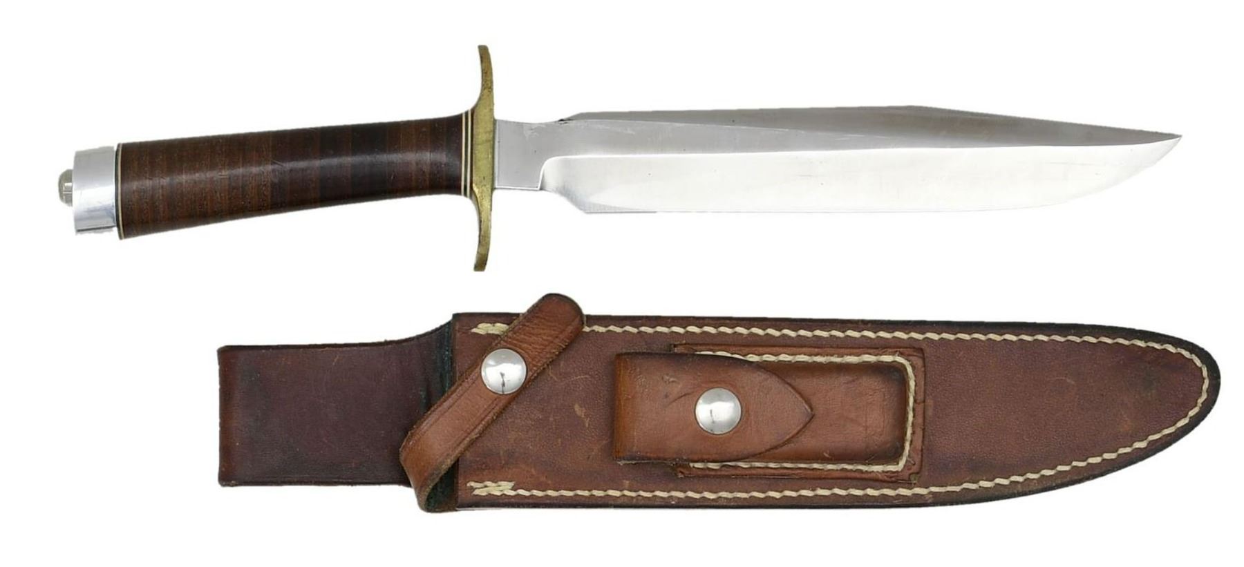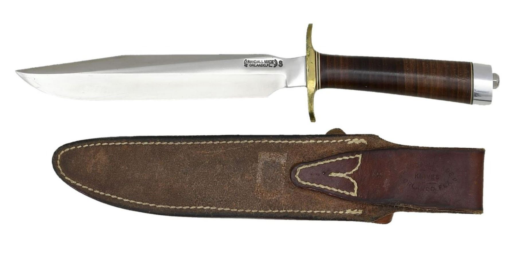 Overall length 13". Blade length 8". Consignor states this knife was mfg. in 1993. Brass crossguard. Leather washer handle. Duralumin buttcap w/ hex butt nut. UNATTACHED ACCESSORIES: Randall leather holster w/ sharpening stone. CONDITION: handle shows some light scratches & handling wear. Brass crossguard is turning dull yellow w/ some oxidation. Blade & butt cap remain mostly bright w/ some scratches & light oxidation specks. PROVENANCE: From the Lifelong Collection of Glen E. Mattox. (02-18663/MJC). $500-800.