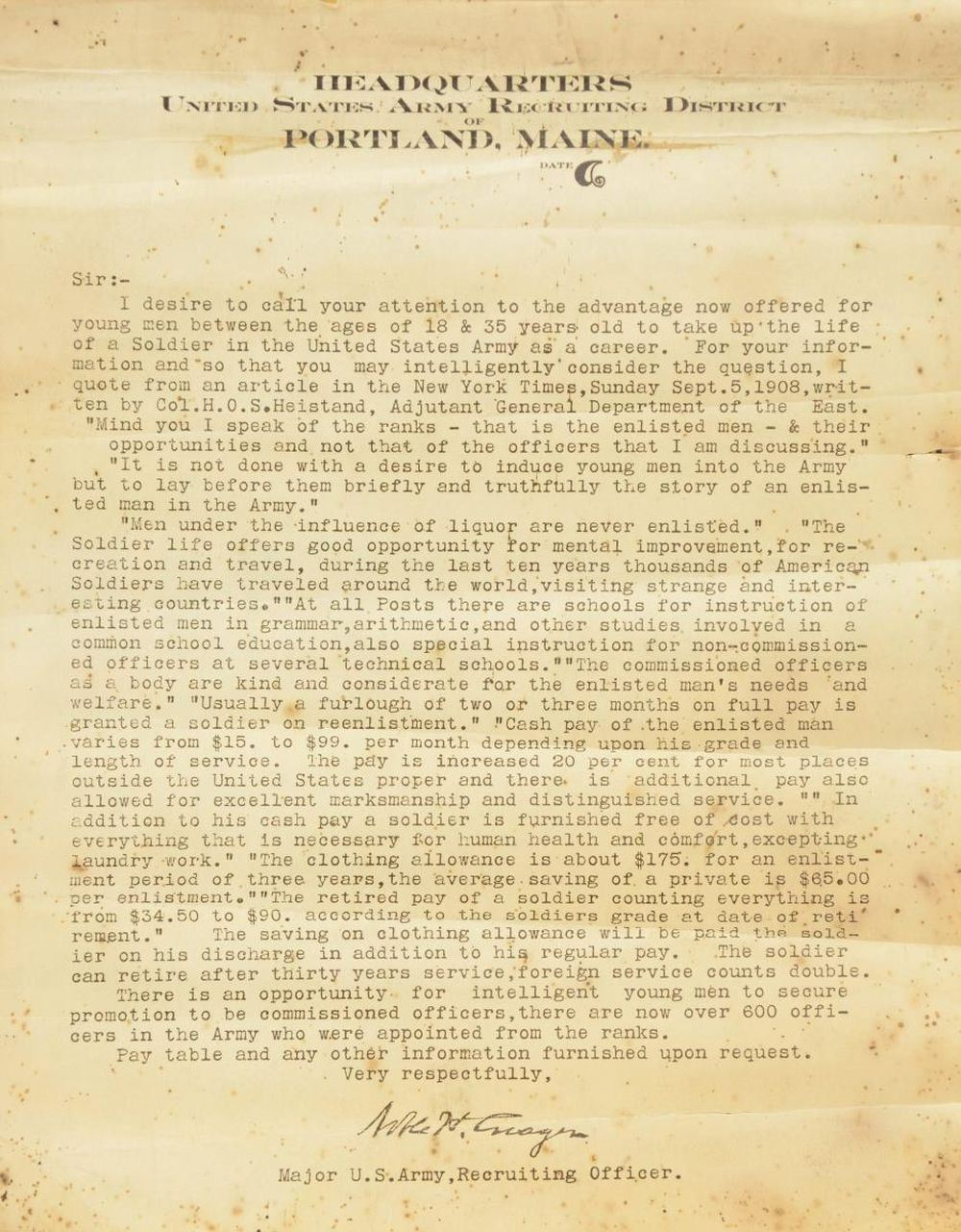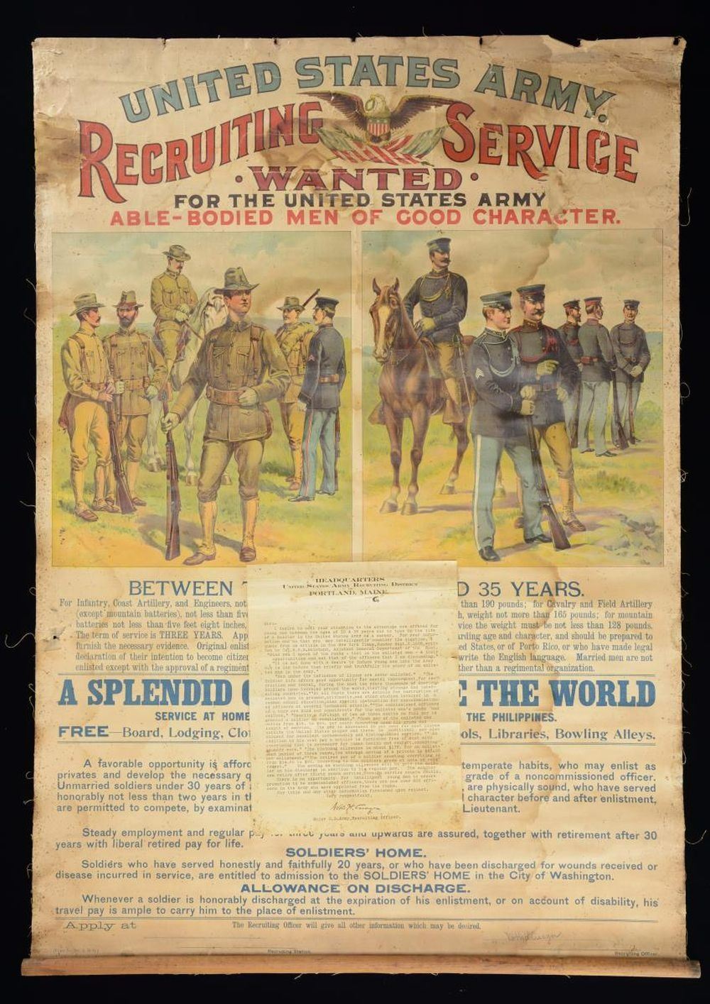 This early polychromatic poster measures 35 1/2" x 24 1/2" and is constructed of paper laid down on linen cloth. The title reads “UNITED STATES ARMY RECRUITING SERVICE WANTED FOR THE UNITED STATES ARMY ABLE-BODIED MEN OF GOOD CHARACTER.” The poster shows an image of soldiers wearing the khaki field uniforms of the Spanish-American War alongside a group of soldiers wearing the 1902 service dress uniforms. Below the images, is lengthy text extolling the virtues of service in the US Army. The poster goes on to read, “A SPLENDID CHANCE TO SEE THE WORLD SERVICE AT HOME STATIONS AND IN ALASKA, HAWAII, AND THE PHILIPPINES.” & “FREE-Board, Lodging, Clothing, Baths, Gymnasiums, Schools, Libraries, Bowling Alleys.” The final paragraphs explains the opportunities for promotion, the excellent pay & retirement, the allowance given at discharge, and the opportunity to reside in a soldier’s home at retirement. There is an 8” x 10 1/2" letter affixed to the front of the poster with the heading “HEADQUARTERS UNITED STATES ARMY RECRUITING DISTRICT OF PORTLAND, MAINE.” CONDITION: the poster does exhibit staining & wear to the edges, but is substantially intact and the colors remain vivid. This rare poster is an excellent candidate for a professional restoration. (02-19771/BF). $1,000-2,000.