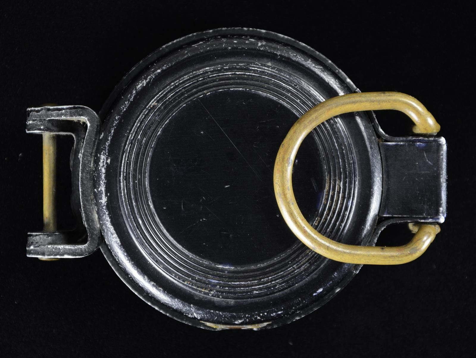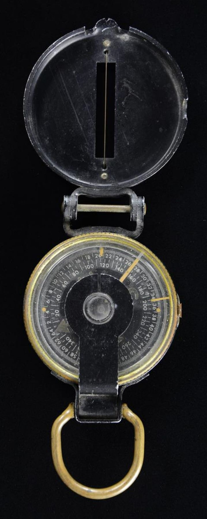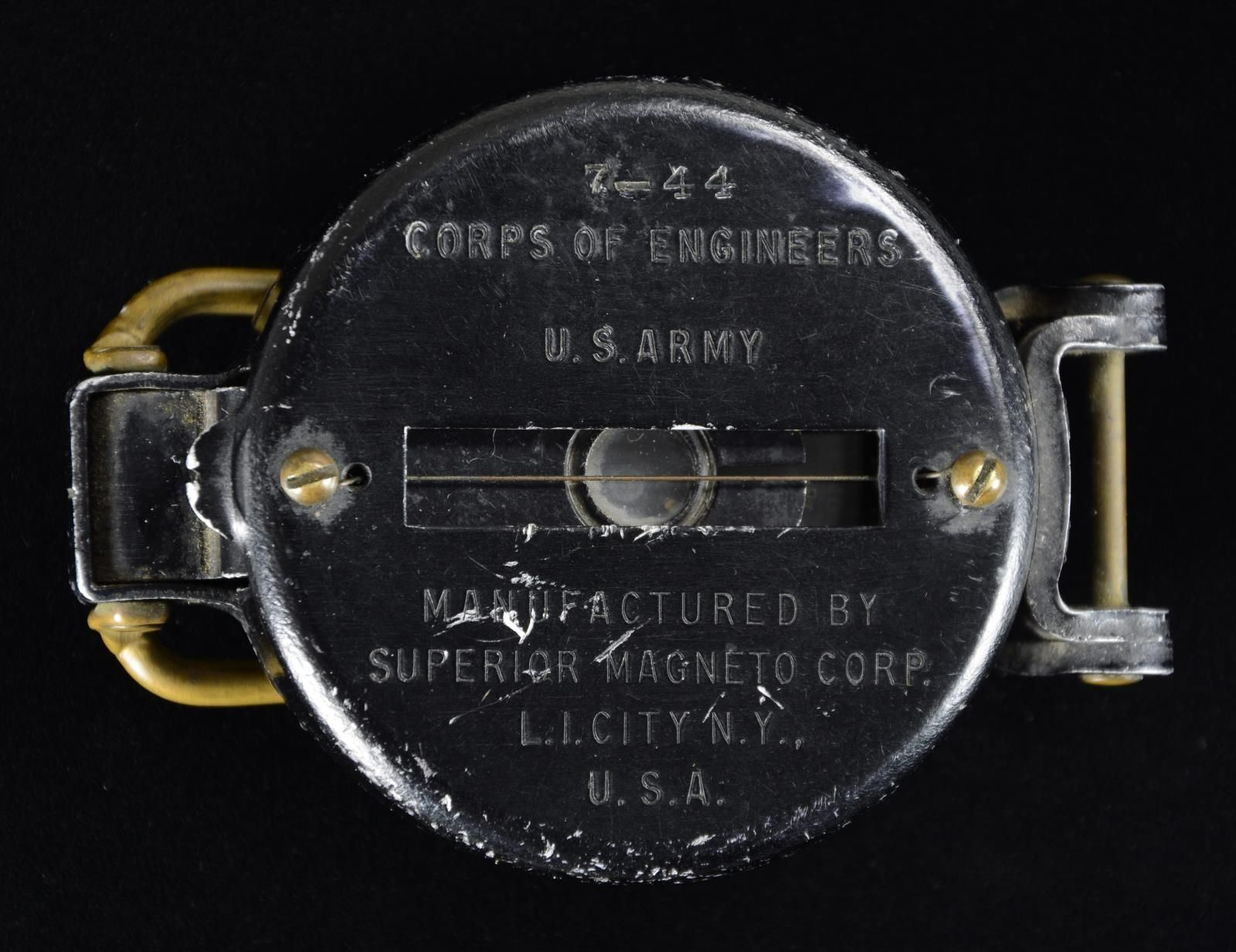 A WWII era US Army compass with a black enameled finish and brass carrying ring. The outside of the compass reads “7-44 CORPS OF ENGINEERS US ARMY MANUFACTURED BY SUPERIOR MAGNETO CORP. L.I. CITY N.Y., U.S.A.”. CONDITION: compass shows light use. (02-19763/BF). $50-100.