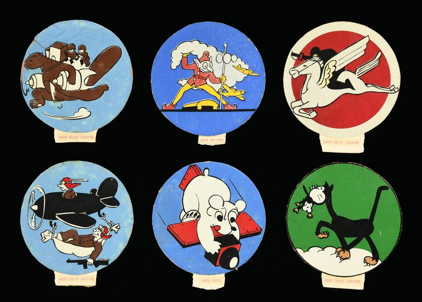 WALT DISNEY STUDIOS IN CALIFORNIA. These hand painted patch designs on cardstock were created for the leather patches on flight jackets of the Air Corps and related entities. They were designed & painted at The Walt Disney Studios in California during WWII. The patch designs were to be disposed of but were rescued by a construction crew working at the Disney Studios. They were in turn sold to the foreman Frank Fitzgerald, who in turn sold them to Ron Fisher & John Holt. The collection was purchased from Mr. Holt in 1996 by Donald Denninger. This group of 6 patch designs include the 54th Troop Carrier Squadron, the 20th Weather Squadron, the 60th Troop Carrier Squadron, the 46th Troop Carrier Squadron, the 16th Photo Squadron, and the 41st Troop Carrier Squadron. All the patch designs seem to utilize the same blue, yellow, white, red, and black color pattern. CONDITION: all patch designs are in solid condition with some showing mild craquelure. The patch designs were at one time pasted into an album but have been removed. (02-19853-3/BF). $750-1,000.