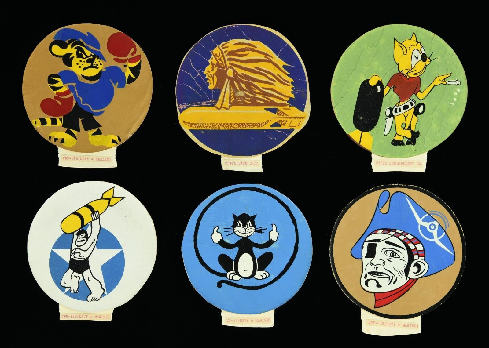 WALT DISNEY STUDIOS IN CALIFORNIA. These hand painted patch designs on cardstock were created for the leather patches on flight jackets of the Air Corps and related entities. They were designed & painted at The Walt Disney Studios in California during WWII. The patch designs were to be disposed of but were rescued by a construction crew working at the Disney Studios. They were in turn sold to the foreman Frank Fitzgerald, who in turn sold them to Ron Fisher & John Holt. The collection was purchased from Mr. Holt in 1996 by Donald Denninger. This group of 6 patch designs include the VMF-224 Navy & Marine Squadron, the 224th Base Unit, the 818th Bombardment Squadron, the VPB-129 Navy & Marine Squadron, the VC-13 Navy & Marine Squadron, and the VMF-512 Navy & Marine Squadron. All the patch designs seem to utilize the same blue, yellow, white, red, and black color pattern. CONDITION: all patch designs are in solid condition with some showing mild craquelure. The patch designs were at one time pasted into an album but have been removed. (02-19853-5/BF). $750-1,000.