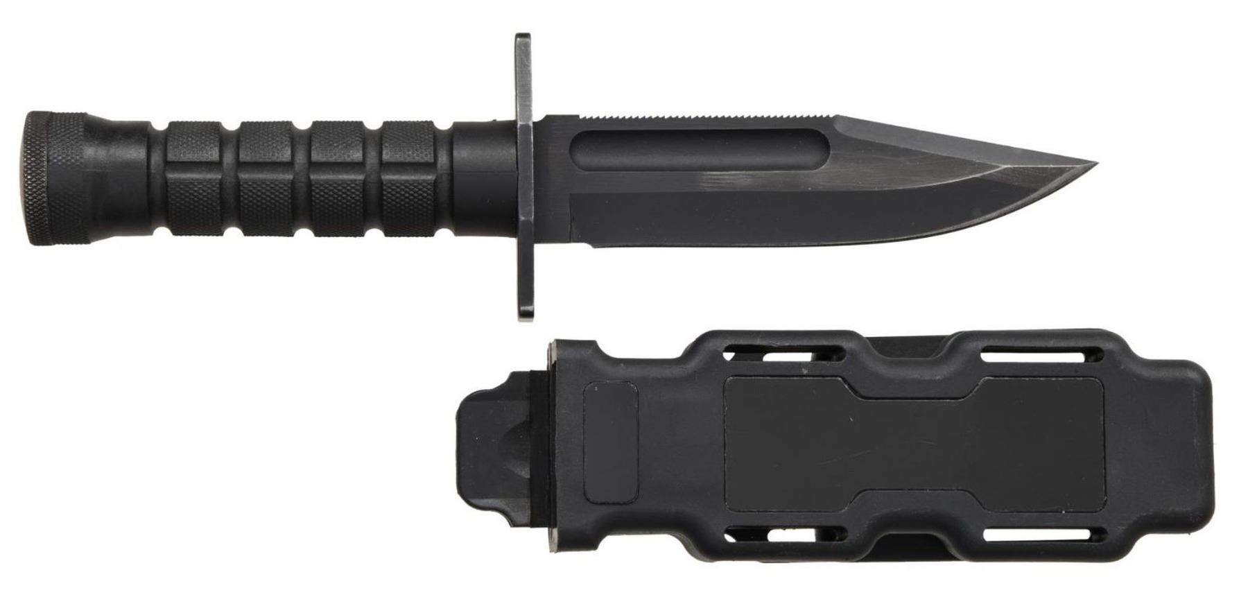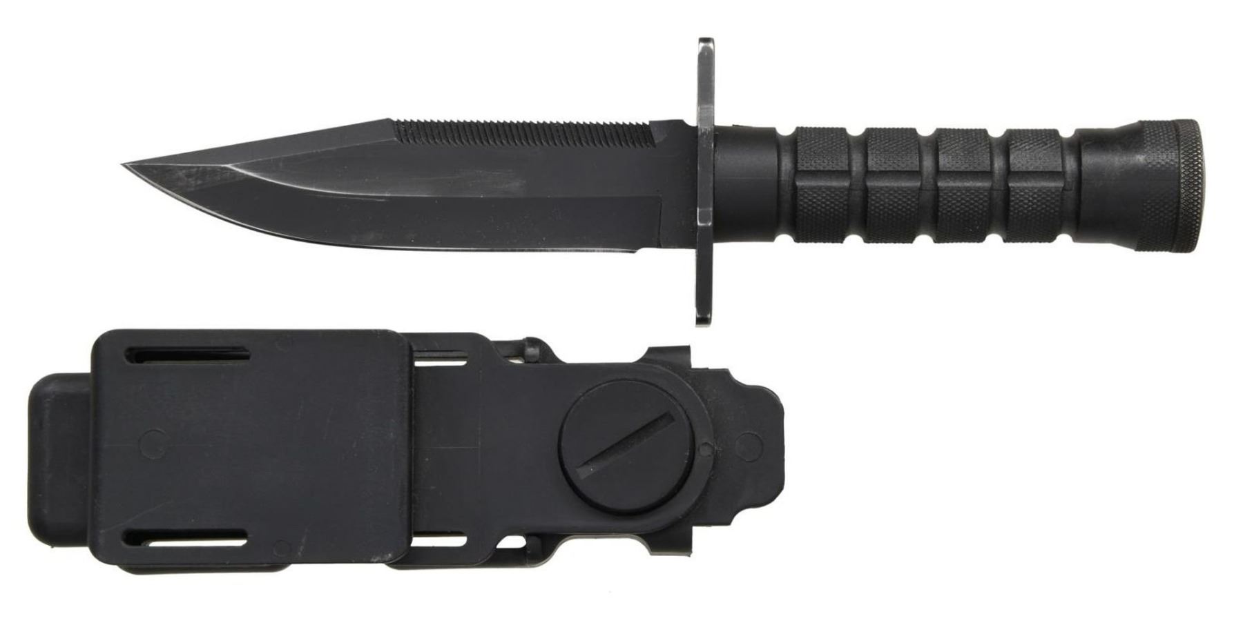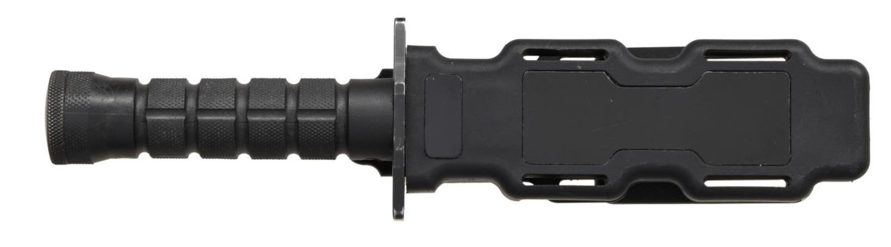 PROVENANCE TO CDR D. T. COULTER OF USN SEAL TEAM THREE. Approx. 458 mfg. from Sept. 1991 to Sept. 1992. Less than 250 were sold to Naval Special Warfare Command & issued to Seal Team Three & to a few East Coast Teams. Overall: 10". The 425M Stainless steel, 57 plus RD hardness 5 3/8" blade has a tall double bevel false edge & sawblade spine. Zytel grooved & checkered handle. Black Zytel sheath. UNATTACHED ACCESSORIES: copied pages from "M9 BAYONET The Authorized history" by Richard Neyman pertaining to this style of knife. A memorandum for the Record from Phrobis Inc. dated 1 December 2014 detailing the history of D. T. Coulter's involvement with Charles Finn in finding a new knife for the USN Seal teams to replace the Ka-Bar knife. Also included is a signed photo of the knife & Navy brochure. CONDITION: Blade & crossguard have very good black oxide finish w/ finish loss consistent with contact points to scabbard. Scabbard very good showing light marks. PROVENANCE: From the Lifelong Collection of Glen E. Mattox. (02-18467/MD). $700-1,000.