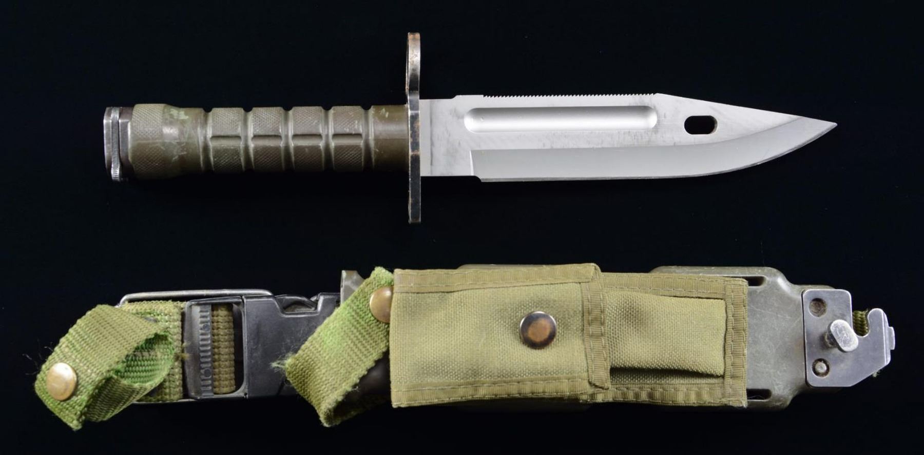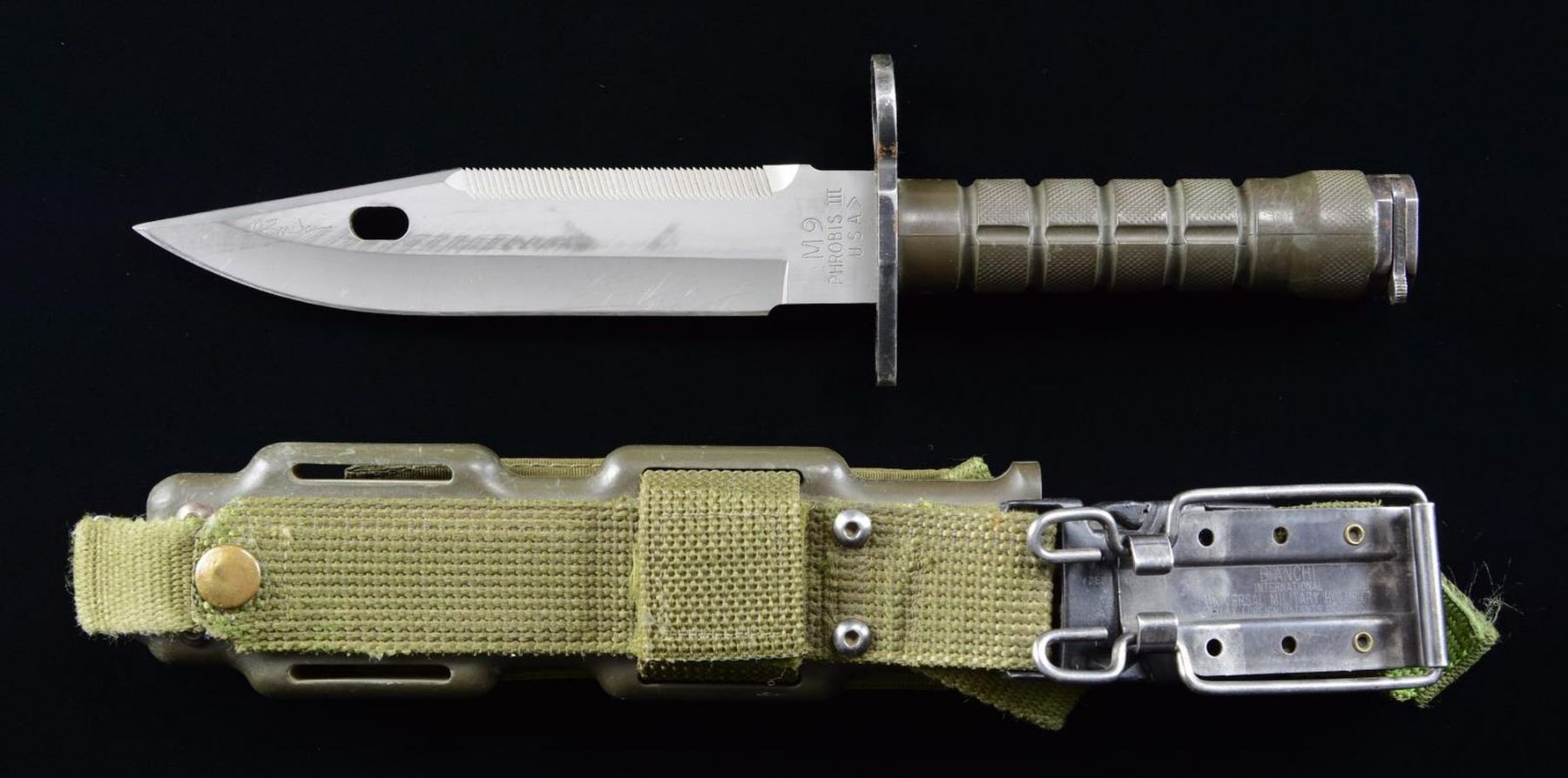 BAYONET SIGNED BY CHARLES T BUCK, OWNED BY GLENN MATTOX & RICHARD NEYMAN. Per "M9 BAYONET AN AUTHORIZED HISTORY" by Richard Neyman, In 1986 Phrobis III won the U.S. Army's XM9 trial for new wire cutting bayonet/cutting knife. In October 1986, the contract was officialy awarded in the newly adopted bayonet was designated the "M9". This was the first new US bayonet since the M7 of Vietnam The first 50 5X M9 bayonets that Phrobis delivered to the Army Trials at Fort Benning were virtually handmade on machine tools, not manufactured on the production line. Buck was a subcontractor to Phrobis for variety of middle parts including blades for the Army's new bayonet. Despite given the Army's Technical Data Package (TDP), Buck, with out consulting or notifying Phrobis, applied the company's "CHEVRON" stamp with it's point facing to the right of the "U.S.A." marking ( > ). This error went unnoticed by the inspector's at Phrobis as the majority of the initial 1,200 shipment went the US Army. The Army quickly replied on January 16, 1987 with a Material Review Report notifying Buck & Phrobis of the production discrepancy "Unauthorized marking on the blade" despite the report also saying "Marking does not affect form, fit or function". Buck quickly corrected the error on all military blades, while the chevron could be kept on all commercial M9 bayonets under a licensing agreement with Phrobis. This production "error" is first & rarest model of the M9's bayonets delivered to the US Army. This bayonet is 12 1/4" overall. The blade is 7 1/8" overall of 425M Stainless steel with 57 plus RC hardness & coated in a "Media Blasted" finish. The left ricasso is stamped "M9 / PHROBIS III / USA >". Magnesium Phosphate finished crossguard, latches & latch plates. Top side of crossguard has small Phrobis logo stamp. Underside of crossguard has scratched Serial Number "126". OD Green Zytel handle. OD Green Zytel scabbard w/ black label with Serial Number "126". Green web front pouch, web frog, Bianchi belt hook & FA Stex buckle. Sharpening stone present under web latch. UNATTACHED ACCESSORIES: a signed photo of the Phrobis XM9 bayonet by Douglas Olsen of Quac-A-Tec, Charles T Buck, & others. Copies of pages pertaining to this bayonet & scabbard from the M9 Bayonet book. CONDITION: bayonet blade has very good appearance showing wear from scabbard contact. Crossguard shows wear from scabbard contact, wear from contact of web straps of frog & spots of oxidation. Handle very good w/ scattered marks. Latch has good fading finish. Scabbard body has wear & numerous marks throughout, but appears intact. Webbing shows wear in contact areas. PROVENANCE: From the Lifelong Collection of Glen E. Mattox. (02-18468/MD). $500-1000.