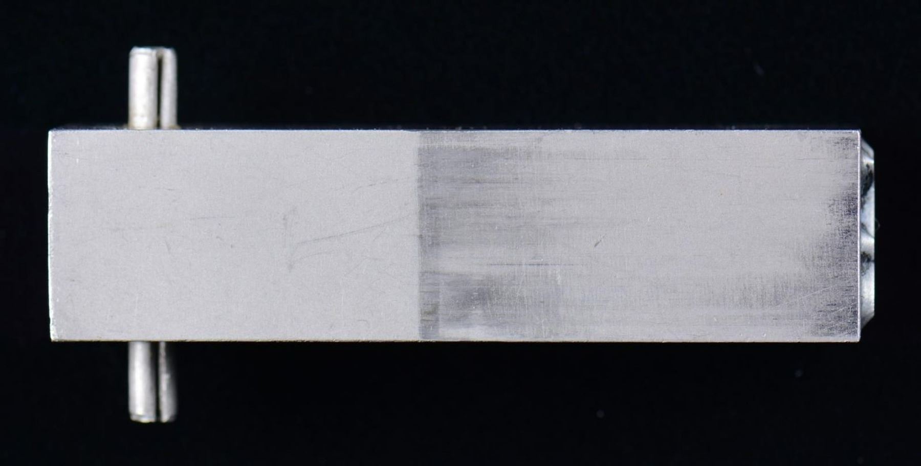 Rectangular 2 1/4" x 5/8" x 5/8" steel stamp w/ 2 roll pins for mounting. The Small Phrobis stamp was used on early knives & bayonets. CONDITION: near excellent overall showing marker & wear streaks. PROVENANCE: From the Lifelong Collection of Glen E. Mattox. (02-18475/MD). $100-200.