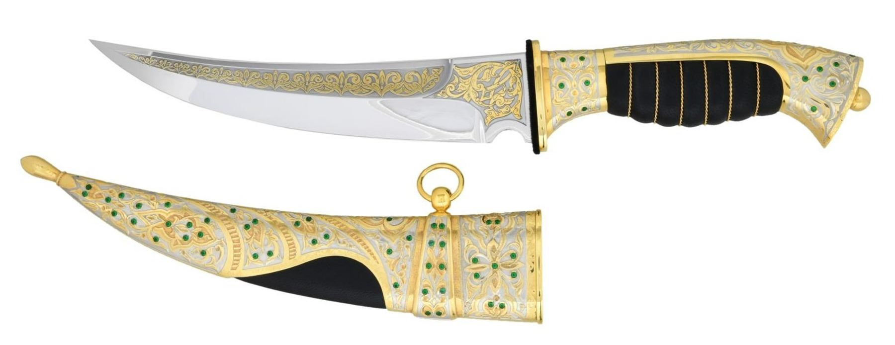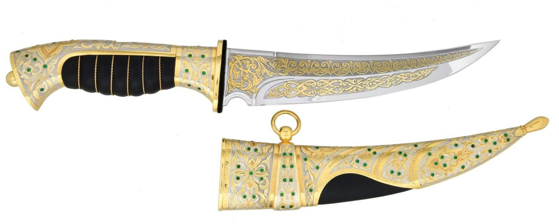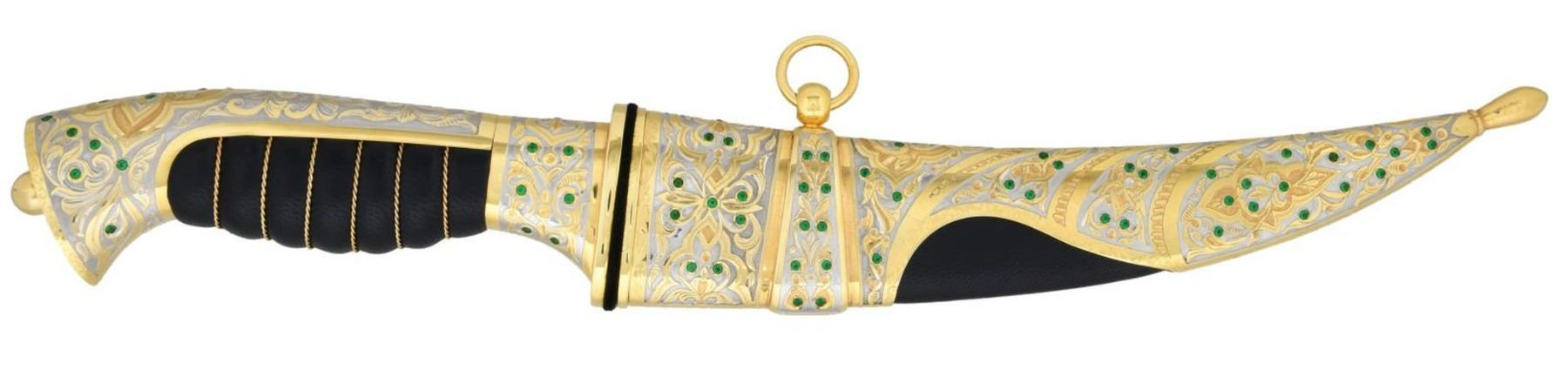 DAGGER IN THE STYLE OF A JAMBIYA. 21st century. Zlatoust Arms Company. The handle with shaped butt and pommel joined to the swelled leather grip wrapped in gold twist wire and framed within foliate gold and silver overlaid spine. The bolster guard with gold foliate overlay and embellished with green emerald color baguettes overall. The curved 8" blade with medial ridge and panels of foliate gold overlay. The sheath with intricate dense foliate gold and silver overlay, embellished with emerald green baguettes with pommel tip and brown leather insert. The 14 1/4" dagger is accompanied by its presentation box with hinged lid. UNATTACHED ACCESSORIES: Certificate of Authenticity. CONDITION: as new. Excellent untouched condition. (02-19653/TG). $4,000-6,500.