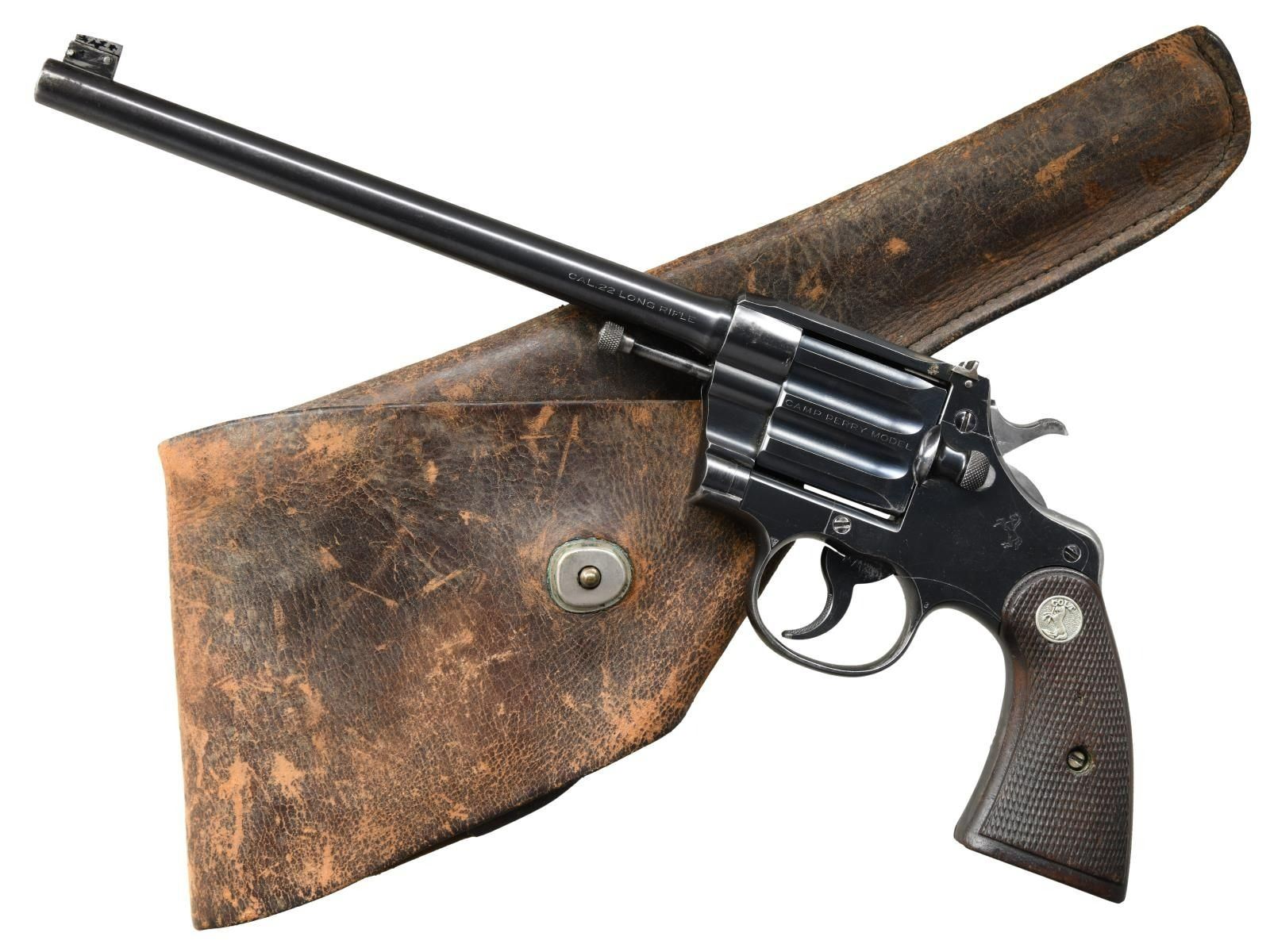 HOLSTER. Cal. 22LR. S# 2021. Bbl 8 1/4". Camp Perry single shot target pistol manufactured by Colt in 1932. The left side of the barrel is stamped with the caliber designation, with Colt's 2 line address stamped across the top. Left side of "breechblock" is stamped "CAMP PERRY MODEL". Left side of frame bears the Rampant Colt logo and "VP" proof. Metal components are blued, with the frame being mounted with 2 piece Colt silver medallion checkered wood grips. Replacement blade front sight, with modified adjustable square notch rear sight. Matching numbers are present on the frame, breechblock, and grips. UNATTACHED ACCESSORIES: unmarked period brown leather grip. CONDITION: metal components retain the majority of their original factory blue finish, exhibiting mild wear and light surface oxidation overall. Brilliant mirror bore, exhibiting well defined rifling throughout. Grips show smoothing and some scattered marks from handling and storage, but otherwise remains sturdy and serviceable. Holster exhibits age related cracking and crazing overall. (23-2504/MLW). CURIO. $1,800-2,500.
