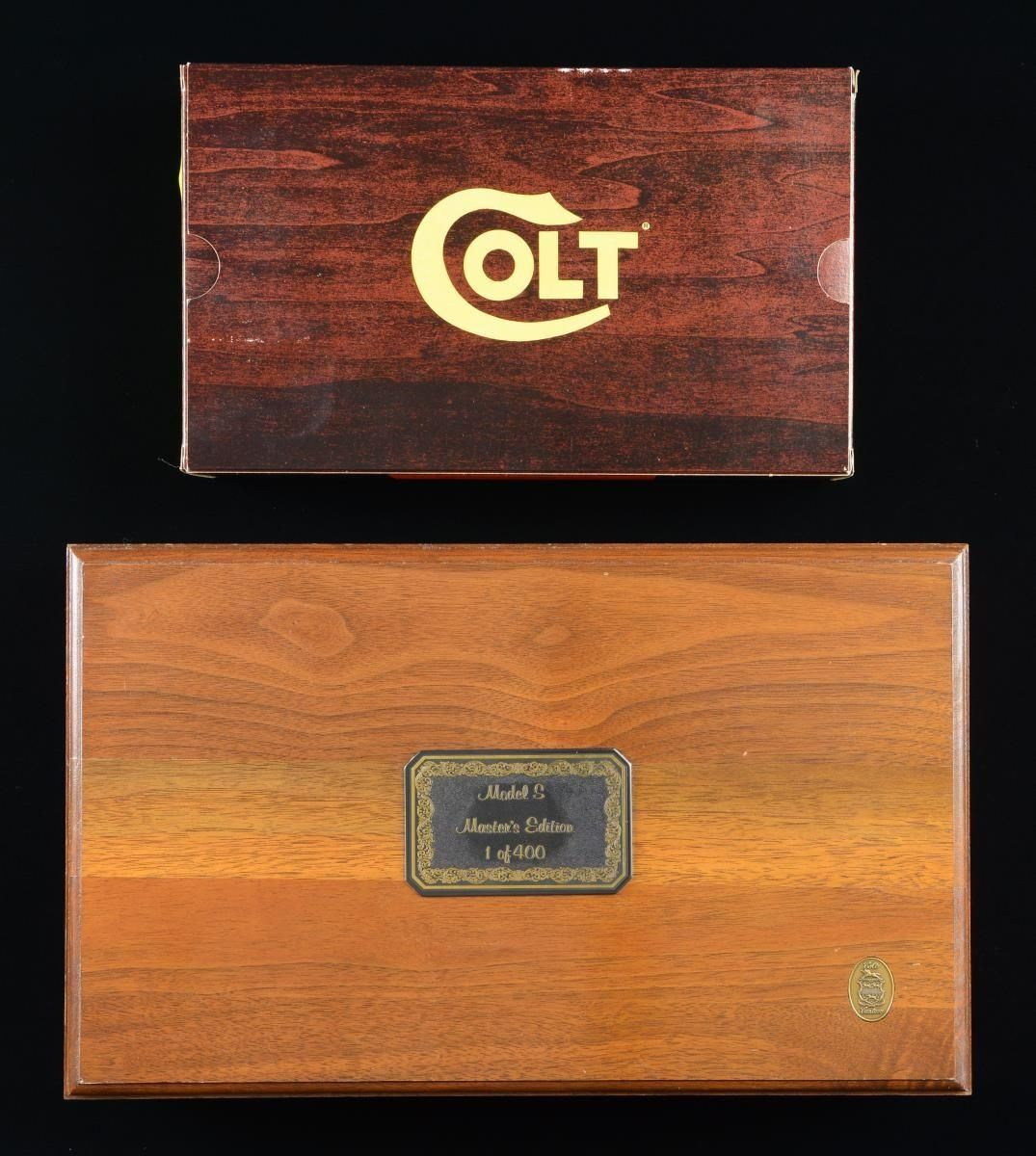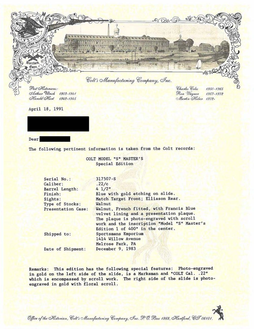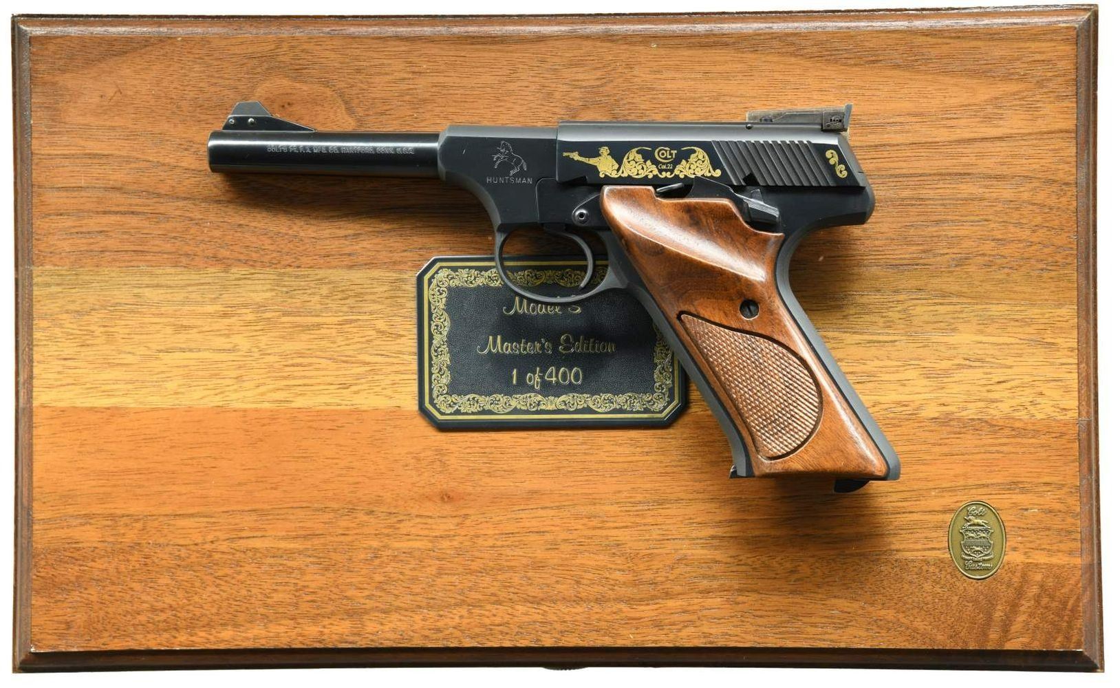 EDITION SEMI-AUTOMATIC PISTOL WITH SHIPPING BOX, BOX, & DISPLAY CASE. Cal. 22 LR. S# 317507S. Bbl 4 1/2". Huntsman Model S Master's Edition manufactured by Colt in 1983. The left side of the barrel is stamped with Colt's single line address, with the Rampant Colt logo above "HUNTSMAN" on the frame. Left side of slide features gold etched marksman followed by light scrollwork surrounding "COLT/ Cal.22", with the right side exhibiting additional gold etched scrollwork. Metal components are blued, with the frame being mounted with 2 piece checkered walnut thumbrest grips. Serrated ramp front sight with Elliason adjustable square notch rear sight. UNATTACHED ACCESSORIES: 2 Colt factory letters (dated 1991 and 2020) indicating that this example was shipped to Sportsmans Emporium Ltd. of Melrose Park, PA on December 9th of 1983, as well as a letter from Robert J. Rayburn of colt22.com indicating that this example is 1 of only 100 of the original 400 Huntsman Model S Master's Edition pistols shipped with a Woodsman Sport Model barrel as compared to the standard Huntsman barrel. Pistol is also accompanied by a shipping box, matching factory box, as well as an original wood factory display case exhibiting a plaque on the lid reading "MODEL S/ Master's Edition/ 1 of 400" and featuring a blue velvet interior. CONDITION: metal components retain bountiful amounts of their original factory blue finish, exhibiting few superficial marks from handling and storage. Mirror bore, exhibiting well defined rifling throughout. Grips are very good overall. Box and display case are excellent. A extremely fine example of a scarce Colt Huntsman Model S Master's Edition pistol. (23-1783/MLW). MODERN. $1,800-2,400.